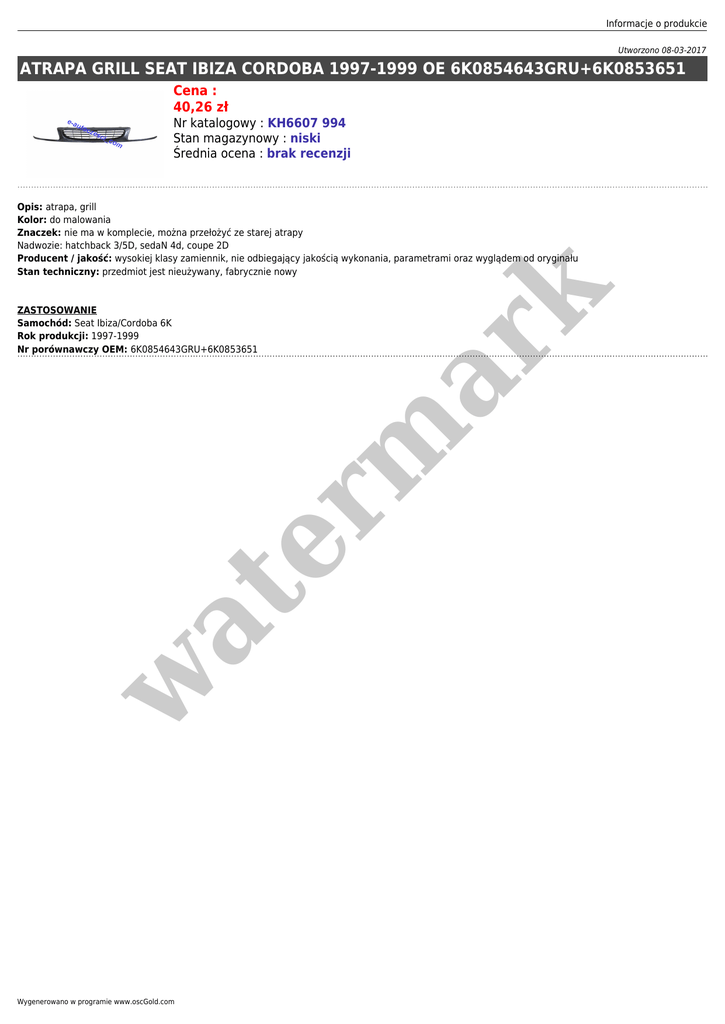 Informacje o produkcie Utworzono 08-03-2017 ATRAPA GRILL SEAT IBIZA CORDOBA 1997-1999 OE 6K0854643GRU+6K0853651 Cena : 40,26 zł Nr katalogowy : KH6607 994 Stan magazynowy : niski Średnia ocena : brak recenzji er m ar k Opis: atrapa, grill Kolor: do malowania Znaczek: nie ma w komplecie, można przełożyć ze starej atrapy Nadwozie: hatchback 3/5D, sedaN 4d, coupe 2D Producent / jakość: wysokiej klasy zamiennik, nie odbiegający jakością wykonania, parametrami oraz wyglądem od oryginału Stan techniczny: przedmiot jest nieużywany, fabrycznie nowy w at ZASTOSOWANIE Samochód: Seat Ibiza/Cordoba 6K Rok produkcji: 1997-1999 Nr porównawczy OEM: 6K0854643GRU+6K0853651 Wygenerowano w programie www.oscGold.com