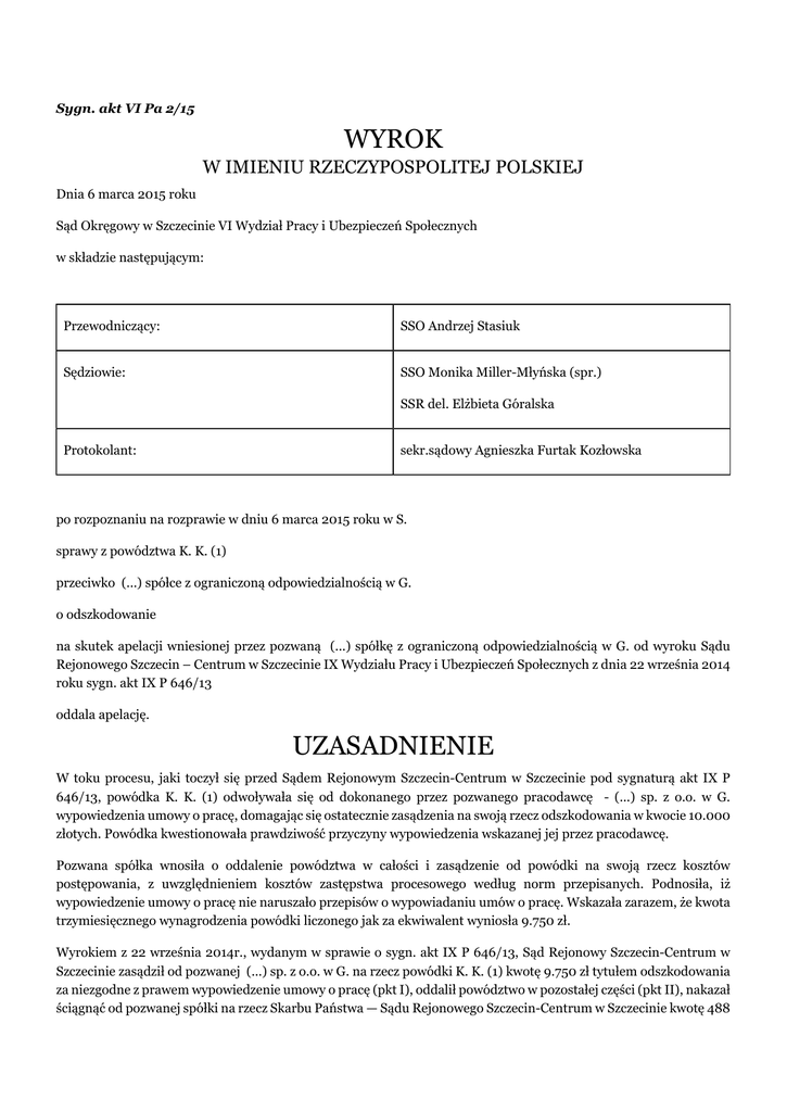 Sygn. akt VI Pa 2/15 WYROK W IMIENIU RZECZYPOSPOLITEJ POLSKIEJ Dnia 6 marca 2015 roku Sąd Okręgowy w Szczecinie VI Wydział Pracy i Ubezpieczeń Społecznych w składzie następującym: Przewodniczący: SSO Andrzej Stasiuk Sędziowie: SSO Monika Miller-Młyńska (spr.) SSR del. Elżbieta Góralska Protokolant: sekr.sądowy Agnieszka Furtak Kozłowska po rozpoznaniu na rozprawie w dniu 6 marca 2015 roku w S. sprawy z powództwa K. K. (1) przeciwko (...) spółce z ograniczoną odpowiedzialnością w G. o odszkodowanie na skutek apelacji wniesionej przez pozwaną (...) spółkę z ograniczoną odpowiedzialnością w G. od wyroku Sądu Rejonowego Szczecin – Centrum w Szczecinie IX Wydziału Pracy i Ubezpieczeń Społecznych z dnia 22 września 2014 roku sygn. akt IX P 646/13 oddala apelację. UZASADNIENIE W toku procesu, jaki toczył się przed Sądem Rejonowym Szczecin-Centrum w Szczecinie pod sygnaturą akt IX P 646/13, powódka K. K. (1) odwoływała się od dokonanego przez pozwanego pracodawcę - (...) sp. z o.o. w G. wypowiedzenia umowy o pracę, domagając się ostatecznie zasądzenia na swoją rzecz odszkodowania w kwocie 10.000 złotych. Powódka kwestionowała prawdziwość przyczyny wypowiedzenia wskazanej jej przez pracodawcę. Pozwana spółka wnosiła o oddalenie powództwa w całości i zasądzenie od powódki na swoją rzecz kosztów postępowania, z uwzględnieniem kosztów zastępstwa procesowego według norm przepisanych. Podnosiła, iż wypowiedzenie umowy o pracę nie naruszało przepisów o wypowiadaniu umów o pracę. Wskazała zarazem, że kwota trzymiesięcznego wynagrodzenia powódki liczonego jak za ekwiwalent wyniosła 9.750 zł. Wyrokiem z 22 września 2014r., wydanym w sprawie o sygn. akt IX P 646/13, Sąd Rejonowy Szczecin-Centrum w Szczecinie zasądził od pozwanej (...) sp. z o.o. w G. na rzecz powódki K. K. (1) kwotę 9.750 zł tytułem odszkodowania za niezgodne z prawem wypowiedzenie umowy o pracę (pkt I), oddalił powództwo w pozostałej części (pkt II), nakazał ściągnąć od pozwanej spółki na rzecz Skarbu Państwa — Sądu Rejonowego Szczecin-Centrum w Szczecinie kwotę 488 zł (tytułem nieuiszczonych kosztów sądowych (pkt III), zniósł koszty procesu pomiędzy stronami (pkt IV) oraz nadał wyrokowi w punkcie I rygor natychmiastowej wykonalności do kwoty 3250 zł. Sąd Rejonowy ustalił następujący stan faktyczny: (...) Sp. z o.o. z siedzibą w G. nie posiadała oddziału w S., który posiadałby status pracodawcy. Umowy o pracę podpisywał zarząd pozwanej. W jednostce w S. było zatrudniono przed jej likwidacją około 20 osób; miejscem pracy tam osób zatrudnionych był S.. (...) w S. została zlikwidowana wiosną 2012 r. Rozwiązano wówczas umowy o pracę z osobami zatrudnionymi w tej jednostce w oparciu o przepisy ustawy z dnia 13 marca 2003 r. o szczególnych zasadach rozwiązywania z pracownikami stosunków pracy z przyczyn niedotyczących pracowników. W grudniu 2011 r. K. K. (1) zaszła w ciążę. W okresie pomiędzy 23.01.2012 r. a 22.02.2012 r. a następnie w okresie pomiędzy 10.04.2012 r. a 18.04.2012 r. oraz w okresie pomiędzy 02.05.2012 r. a 19.09.2012 r. przebywała na zwolnieniu lekarskim. Po urodzeniu dziecka (w dniu 14.09.2012 r.) powódka przebywała na urlopie macierzyńskim oraz dodatkowym urlopie macierzyńskim do dnia 28.02.2013 r. Następnie od dnia 01.03.2013 r. do dnia 18.06.2013 r. korzystała z urlopu wypoczynkowego, zaś do dnia 20.06.2013r wykorzystywała dwa dni wolnego z tytułu sprawowania opieki nad dzieckiem, Od dnia 21.06.2013r. do dnia 20.06.2014 r. powódka przebywała na urlopie wychowawczym. Pismem z dnia 21 czerwca 2012 roku pozwana wypowiedziała powódce warunki pracy w postaci miejsca zatrudnienia ze S. na G.. W drugim zdaniu zawarto sfomułowanie „Bieg terminu wypowiedzenia zmieniającego nastąpi po ustaniu usprawiedliwionej nieobecności w pracy”. W ostatnim zdaniu zostało zapisane : „Informuję, że w terminie 7 dni od dnia otrzymania pisma przysługuje Pani prawo do odwołania się do Sądu Pracy”. Pismo to powódka otrzymała w okolicach lipca 2012 roku. Następnie, wraz z pismem informującym o udzieleniu urlopu wychowawczego datowanym na 7 czerwca 2013 roku, powódka otrzymała pismo z dnia 18 sierpnia 2013 roku w postaci oświadczenia o rozwiązaniu umowy o pracę za wypowiedzeniem w trybie ustawy z dnia 13 marca 2003 r. o szczególnych zasadach rozwiązywania z pracownikami stosunków pracy z przyczyn niedotyczących pracowników. Jako przyczynę wskazano reorganizację stanowisk pracy — likwidację (...)w S., z jednoczesnym brakiem możliwości zatrudniania na innym stanowisku. Pisma te powódka otrzymała w dniu 27 czerwca 2013 roku W oparciu o powyższe ustalenia Sąd Rejonowy uznał powództwo w jego przeważającej części za zasadne. Podkreślił, iż stan faktyczny w zasadzie nie był pomiędzy stronami sporny, a w szczególności niesporne było to, że (...) w S., będąca miejscem pracy powódki, uległa likwidacji, a kilkunastu zatrudnionym tam pracownikom wypowiedziano umowy o pracę. Zwrócił uwagę, że poza sporem było także i to, że pozwana dokonała wypowiedzenia zmieniającego na podstawie ustawy z dnia 13 marca 2013 roku o szczególnych zasadach rozwiązywania z pracownikami stosunków pracy z przyczyn niedotyczących pracowników — na podstawie art. 10 w zw. z art. 5 ust. 5 pkt 1 — wskazując miejsce pracy na G. zamiast S., w okresie zwolnienia ciążowego powódki, a powódka otrzymawszy to wypowiedzenie, nie odwołała się od niego do sądu. Odnosząc się do zarzutu „braku wejścia w życie” wypowiedzenia zmieniającego wysłanego powódce podczas tzw. zwolnienia ciążowego, Sąd I instancji wskazał, że w jego ocenie, mimo sprzecznych zapisów pisma z dnia 21 czerwca 2012 roku pozwana wypowiedziała skutecznie powódce w czerwcu 2012 roku warunki pracy w postaci miejsca zatrudnienia ze S.na G.. Podkreślił, iż w drugim 