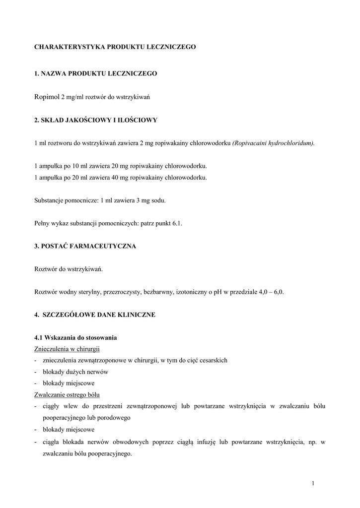 CHARAKTERYSTYKA PRODUKTU LECZNICZEGO 1. NAZWA PRODUKTU LECZNICZEGO Ropimol 2 mg/ml roztwór do wstrzykiwań 2. SKŁAD JAKOŚCIOWY I ILOŚCIOWY 1 ml roztworu do wstrzykiwań zawiera 2 mg ropiwakainy chlorowodorku (Ropivacaini hydrochloridum). 1 ampułka po 10 ml zawiera 20 mg ropiwakainy chlorowodorku. 1 ampułka po 20 ml zawiera 40 mg ropiwakainy chlorowodorku. Substancje pomocnicze: 1 ml zawiera 3 mg sodu. Pełny wykaz substancji pomocniczych: patrz punkt 6.1. 3. POSTAĆ FARMACEUTYCZNA Roztwór do wstrzykiwań. Roztwór wodny sterylny, przezroczysty, bezbarwny, izotoniczny o pH w przedziale 4,0 – 6,0. 4. SZCZEGÓŁOWE DANE KLINICZNE 4.1 Wskazania do stosowania Znieczulenia w chirurgii - znieczulenia zewnątrzoponowe w chirurgii, w tym do cięć cesarskich - blokady dużych nerwów - blokady miejscowe Zwalczanie ostrego bólu - ciągły wlew do przestrzeni zewnątrzoponowej lub powtarzane wstrzyknięcia w zwalczaniu bólu pooperacyjnego lub porodowego - blokady miejscowe - ciągła blokada nerwów obwodowych poprzez ciągłą infuzję lub powtarzane wstrzyknięcia, np. w zwalczaniu bólu pooperacyjnego. 1 Zwalczanie ostrego bólu w pediatrii (około i pozabiegowego) - Blokada zewnątrzoponowa krzyżowa noworodków, niemowląt i dzieci do 12 roku życia. - Ciągła infuzja zewnątrzoponowa noworodków, niemowląt i dzieci do 12 roku życia. 4.2 Dawkowanie i sposób podawania Podanie nadtwardówkowe i okołonerwowe. Ropiwakainy chlorowodorek powinien być stosowany wyłącznie przez lub pod nadzorem specjalistów doświadczonych w wykonywaniu znieczuleń przewodowych. DOROŚLI I MŁODZIEŻ OD 12 ROKU ŻYCIA Dawkowanie Poniższa tabela przedstawia dawkowanie zalecane dla najczęściej stosowanych typów znieczuleń. Obowiązuje zasada podawania najmniejszej skutecznej dawki. Dawkowanie należy ustalić na podstawie doświadczenia specjalisty oraz stanu ogólnego pacjenta. 2 ZNIECZULENIA W CHIRURGII Znieczulenie zewnątrzoponowe w odcinku lędźwiowym Stężenie Objętość Dawka (§) Czas Czas trwania mg/ml ml mg indukcji Chirurgia 7,5 15-25 113-188 10-20 3-5 10 15-20 150-200 10-20 4-6 (1) Cięcie cesarskie 7,5 15-20 113-150 10-20 3-5 Znieczulenie zewnątrzoponowe w odcinku piersiowym Blokada w zwalczaniu bólu 7,5 5-15 38-113 10-20 n/a (2) pooperacyjnego (w zależności od poziomu wstrzykiwania) Blokada dużych nerwów* Blokada splotu ramiennego 7,5 30-40 225 300 (3) 10-25 6-10 Blokada miejscowa (np. blokada małych nerwów i 7,5 1-30 7,5-225 1-15 2-6 infiltracja) ZWALCZANIE OSTREGO BÓLU Znieczulenie zewnątrzoponowe w odcinku lędźwiowym Bolus 2 10-20 20-40 10-15 0,5-1,5 Powtarzane wstrzykiwania 2 10-15 20-30 (np. zwalczanie bólu porodowego) (minimalny odstęp 30 minut) Infuzja ciągła, np. ból porodowy 2 6-10 ml/h 12-20 mg/h n/a n/a Zwalczanie bólu pooperacyjnego 2 6-14 ml/h 12-28 mg/h n/a n/a Znieczulenie zewnątrzoponowe w odcinku piersiowym Infuzja ciągła (zwalczanie bólu 2 6-14 ml/h 12-28 mg/h n/a n/a pooperacyjnego) Blokada miejscowa (np. blokada małych nerwów 2 1-100 2,0-200 1-5 2-6 obwodowych i infiltracja) Blokada nerwów obwodowych (blokada udowa lub z dostępu pomiędzy mm. pochyłymi) Infuzja ciągła lub powtarzane 2 5-10 ml/h 10-20 mg/h n/a n/a wstrzykiwanie (np. zwalczanie bólu pooperacyjnego) (§) Przyjmuje się, że przedstawione w tabeli dawki dotyczące ropiwakainy chlorowodorku są minimalnymi dawkami skutecznymi i powinny być traktowane jako wytyczne do stosowania u dorosłych pacjentów. Możliwe są indywidualne różnice w indukcji i okresie oddziaływania dawki. Dane w kolumnie „Dawka” odzwierciedlają średni przewidywany zakres niezbędnej do podania dawki ropiwakainy chlorowodorku. W celu uzyskania informacji dotyczących czynników wpływających na określone techniki blokowania, jak również wymagań dotyczących poszczególnych pacjentów, należy skorzystać ze standardowych podręczników. * W przypadku blokady dużych nerwów istnieją jedynie zalecenia dotyczące dawkowania przy blokadzie splotu ramiennego. Pozostałe blokady dużych nerwów mogą wymagać stosowania mniejszych dawek. Obecnie nie ma jednak popartych doświadczeniem zaleceń dotyczących określonego dawkowania w przypadku innych blokad. 3 1) Zaleca się stosowanie dawkowania wzrastającego, gdzie dawka inicjująca wynosząca około 100 mg (97,5 mg = 13 ml; 105 mg = 14 ml) podawana jest w przedziale czasowym 3-5 min. W razie potrzeby można podać dwie dodatkowe dawki, w sumie dodatkowo 50 mg. 2) n/a = nie ma zastosowania 3) Dawka przy blokadzie dużych nerwów musi być dostosowana do miejsca podania oraz stanu ogólnego pacjenta. Blokada splotu ramiennego z dostępu pomiędzy mięśniami pochyłymi oraz z dostępu nadobojczykowego może wiązać się ze zwiększonym ryzykiem wystąpienia ciężkich działań niepożądanych, niezależnie od rodzaju użytego miejscowego leku znieczulającego (patrz punkt 4.4.). Znieczulenia w chirurgii (np. podanie zewnątrzoponowe) wymagają stosowania większych stężeń i dawek. W zabiegach chirurgicznych, do których w znieczuleniach zewnątrzoponowych konieczne jest uzyskanie całkowitej blokady nerwów ruchowych zaleca się podanie ropiwakainy chlorowodorku w postaci roztworu do wstrzykiwań w stężeniu 10 mg/ml. Mniejsze stężenia i dawki zalecane są w przypadku analgezji (np. znieczulenie zewnątrzoponowe w zwalczaniu ostrego bólu). Sposób podawania Zaleca się uważną aspirację przed i podczas wstrzykiwania leku w celu uniknięcia podania donaczyniowego. W przypadku konieczności podania dużych dawek zaleca się zastosowanie próbnej dawki 3 do 5 ml roztworu lidokainy z adrenaliną. Niezamierzone podanie donaczyniowe można rozpoznać na podstawie przemijającego przyspieszenia czynności serca, a niezamierzone podanie podpajęczynówkowe na podstawie objawów bloku rdzeniowego. Aspirację należy powtarzać przed i w czasie podawania dawki głównej, którą należy wstrzykiwać powoli lub w dawkach wzrastających,