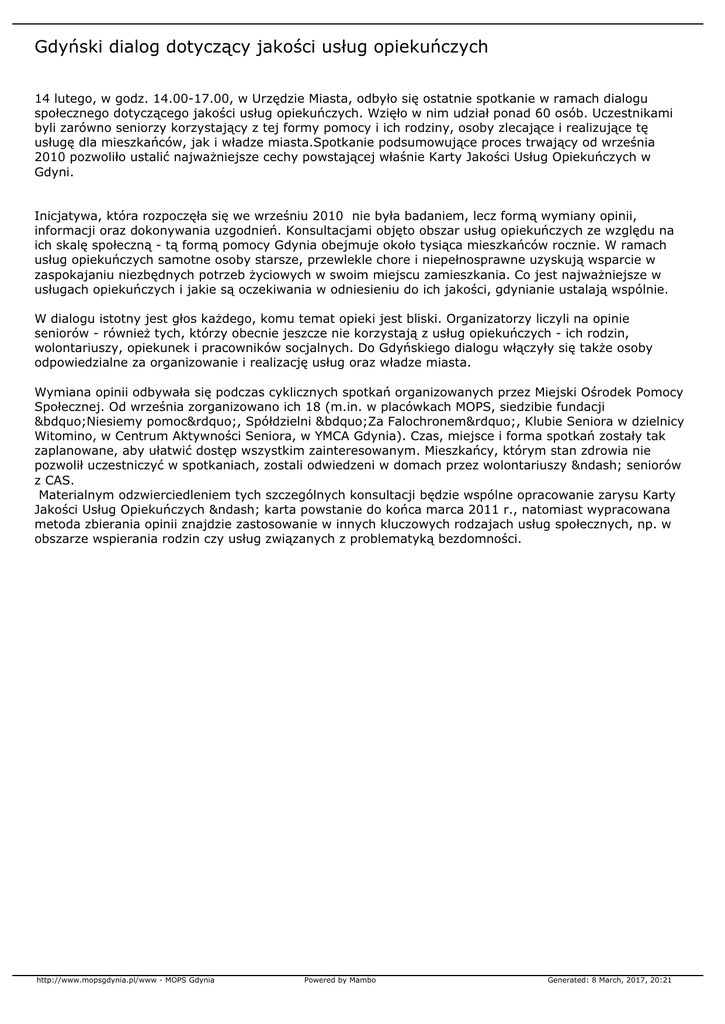 Gdyński dialog dotyczący jakości usług opiekuńczych 14 lutego, w godz. 14.00-17.00, w Urzędzie Miasta, odbyło się ostatnie spotkanie w ramach dialogu społecznego dotyczącego jakości usług opiekuńczych. Wzięło w nim udział ponad 60 osób. Uczestnikami byli zarówno seniorzy korzystający z tej formy pomocy i ich rodziny, osoby zlecające i realizujące tę usługę dla mieszkańców, jak i władze miasta.Spotkanie podsumowujące proces trwający od września 2010 pozwoliło ustalić najważniejsze cechy powstającej właśnie Karty Jakości Usług Opiekuńczych w Gdyni. Inicjatywa, która rozpoczęła się we wrześniu 2010 nie była badaniem, lecz formą wymiany opinii, informacji oraz dokonywania uzgodnień. Konsultacjami objęto obszar usług opiekuńczych ze względu na ich skalę społeczną - tą formą pomocy Gdynia obejmuje około tysiąca mieszkańców rocznie. W ramach usług opiekuńczych samotne osoby starsze, przewlekle chore i niepełnosprawne uzyskują wsparcie w zaspokajaniu niezbędnych potrzeb życiowych w swoim miejscu zamieszkania. Co jest najważniejsze w usługach opiekuńczych i jakie są oczekiwania w odniesieniu do ich jakości, gdynianie ustalają wspólnie. W dialogu istotny jest głos każdego, komu temat opieki jest bliski. Organizatorzy liczyli na opinie seniorów - również tych, którzy obecnie jeszcze nie korzystają z usług opiekuńczych - ich rodzin, wolontariuszy, opiekunek i pracowników socjalnych. Do Gdyńskiego dialogu włączyły się także osoby odpowiedzialne za organizowanie i realizację usług oraz władze miasta. Wymiana opinii odbywała się podczas cyklicznych spotkań organizowanych przez Miejski Ośrodek Pomocy Społecznej. Od września zorganizowano ich 18 (m.in. w placówkach MOPS, siedzibie fundacji „Niesiemy pomoc”, Spółdzielni „Za Falochronem”, Klubie Seniora w dzielnicy Witomino, w Centrum Aktywności Seniora, w YMCA Gdynia). Czas, miejsce i forma spotkań zostały tak zaplanowane, aby ułatwić dostęp wszystkim zainteresowanym. Mieszkańcy, którym stan zdrowia nie pozwolił uczestniczyć w spotkaniach, zostali odwiedzeni w domach przez wolontariuszy – seniorów z CAS. Materialnym odzwierciedleniem tych szczególnych konsultacji będzie wspólne opracowanie zarysu Karty Jakości Usług Opiekuńczych – karta powstanie do końca marca 2011 r., natomiast wypracowana metoda zbierania opinii znajdzie zastosowanie w innych kluczowych rodzajach usług społecznych, np. w obszarze wspierania rodzin czy usług związanych z problematyką bezdomności. http://www.mopsgdynia.pl/www - MOPS Gdynia Powered by Mambo Generated: 8 March, 2017, 20:21