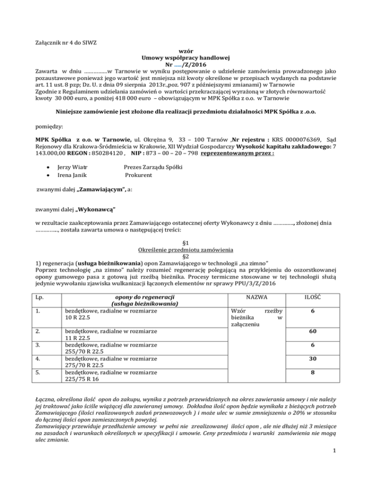 Załącznik nr 4 do SIWZ wzór Umowy współpracy handlowej Nr …../Z/2016 Zawarta w dniu ……………w Tarnowie w wyniku postępowanie o udzielenie zamówienia prowadzonego jako pozaustawowe ponieważ jego wartość jest mniejsza niż kwoty określone w przepisach wydanych na podstawie art. 11 ust. 8 pzp; Dz. U. z dnia 09 sierpnia 2013r.,poz. 907 z późniejszymi zmianami) w Tarnowie Zgodnie z Regulaminem udzielania zamówień o wartości przekraczającej wyrażoną w złotych równowartość kwoty 30 000 euro, a poniżej 418 000 euro – obowiązującym w MPK Spółka z o.o. w Tarnowie Niniejsze zamówienie jest złożone dla realizacji przedmiotu działalności MPK Spółka z .o.o. pomiędzy: MPK Spółka z o.o. w Tarnowie, ul. Okrężna 9, 33 – 100 Tarnów ,Nr rejestru : KRS 0000076369, Sąd Rejonowy dla Krakowa-Śródmieścia w Krakowie, XII Wydział Gospodarczy Wysokość kapitału zakładowego: 7 143.000,00 REGON : 850284120 , NIP : 873 – 00 – 20 – 798 reprezentowanym przez : Jerzy Wiatr Irena Janik Prezes Zarządu Spółki Prokurent zwanymi dalej „Zamawiającym”, a: zwanymi dalej „Wykonawcą” w rezultacie zaakceptowania przez Zamawiającego ostatecznej oferty Wykonawcy z dniu …………., złożonej dnia …………..., została zawarta umowa o następującej treści: §1 Określenie przedmiotu zamówienia §2 1) regeneracja (usługa bieżnikowania) opon Zamawiającego w technologii „na zimno” Poprzez technologię „na zimno” należy rozumieć regenerację polegającą na przyklejeniu do oszorstkowanej opony gumowego pasa z gotową już rzeźbą bieżnika. Procesy termiczne stosowane w tej technologii służą jedynie wywołaniu zjawiska wulkanizacji łączonych elementów nr sprawy PPU/3/Z/2016 Lp. 1. 2. 3. 4. 5. opony do regeneracji (usługa bieżnikowania) bezdętkowe, radialne w rozmiarze 10 R 22.5 bezdętkowe, radialne w rozmiarze 11 R 22.5 bezdętkowe, radialne w rozmiarze 255/70 R 22.5 bezdętkowe, radialne w rozmiarze 275/70 R 22.5 bezdętkowe, radialne w rozmiarze 225/75 R 16 NAZWA ILOŚĆ Wzór rzeźby bieżnika w załączeniu 6 60 6 30 8 Łączna, określona ilość opon do zakupu, wynika z potrzeb przewidzianych na okres zawierania umowy i nie należy jej traktować jako ściśle wiążącej dla zawieranej umowy. Dokładna ilość opon będzie wynikała z bieżących potrzeb Zamawiającego (ilości realizowanych zadań przewozowych ) i może ulec w sumie zmniejszeniu o 20% w stosunku do łącznej ilości opon zamieszczonych powyżej. Zamawiający przewiduje przedłużenie umowy w pełni nie zrealizowanej ilości opon , ale nie dłużej niż 3 miesiące na zasadach i warunkach określonych w specyfikacji i umowie. Ceny przedmiotu i warunki zamówienia nie mogą ulec zmianie. 1 Wartość zamówienia oraz termin wykonania 2) Wartość netto całości zamówienia wynosi : Lp. opony do regeneracji (usługa bieżnikowania) NAZWA ILOŚĆ Wartość netto [PLN] 1 szt. 1. 2. bezdętkowe, radialne w rozmiarze 10 R 22.5 bezdętkowe, radialne w rozmiarze 11 R 22.5 3. bezdętkowe, radialne w rozmiarze 255/70 R 22.5 4. bezdętkowe, radialne w rozmiarze 275/70 R 22.5 5. bezdętkowe, radialne w rozmiarze 225/75 R 16 (ceny zgodne z załącznikiem do niniejszej umowy). Wzór rzeźby bieżnika w załączeniu 6 60 6 30 8 Przez cały czas trwania umowy ceny o których mowa w załączniku (formularz cenowy) nie mogą ulec zmianie. §3 1. Dostarczanie opon bieżnikowych i odbiór karkasów do bieżnikowania odbywać się będzie przez okres 12 m-cy od dnia podpisania umowy na życzenie zamawiającego (sukcesywnie w miarę potrzeb.) 2. Dostarczanie opon i odbiór karkasów do bieżnikowania obciąża Wykonawcę. 3. Datę i godzinę dostarczenia opon do MPK Spółka z o.o. w Tarnowie, Zamawiający uzgadnia z Wykonawcą telefonicznie, faksem lub mailem. 4. Siedziba Zamawiającego: Tarnów, ul. Okrężna 9 w godzinach od 7:15 do 14:30, tel. 630 – 06 – 24 lub 626 – 96 – 11 w. 113, 140, 114 każdego dnia roboczego tygodnia. §4 Termin, sposób płatności oraz warunki odbioru 1. Ustala się 21 dniowy termin zapłaty po uprzednim otrzymaniu przedmiotów umowy oraz faktury. 2. Termin do zapłaty biegnie od daty spełnienia obu warunków wymienionych w pkt 1. Jako dzień dokonania zapłaty przyjmuje się dzień obciążenia konta Zamawiającego. 3. Płatność za wykonaną usługę nastąpi przelewem na rachunek bankowy Wykonawcy. §5 Wykonawca zobowiązany jest dostarczać Zamawiającemu wraz z dostawą; specyfikacji asortymentowej nowych opon (wykaz szczegółowy opon – typ, rozmiar, gatunek, itp. ). §6 1. Wykonawca zobowiązany jest dostarczyć Zamawiającemu przedmiot umowy bez żadnych wad w ciągu 48 godzin od momentu zgłoszenia telefonicznego, faksem lub maliowo do siedziby zamawiającego. 2. Zamawiający zobowiązuje się do sprawdzenia kompletności przedmiotu umowy oraz dokumentacji podczas odbioru przedmiotu umowy. §7 Gwarancja 1. Wykonawca udziela na każdy dostarczony przedmiot umowy min. 12 –sto miesięcznej gwarancji. 2. Opony reklamacyjne objęte gwarancją Wykonawca odbiera i dostarcza do Zamawiającego na własny koszt. §8 Zakres odpowiedzialności 1. Wykonawca zobowiązuje się zapłacić Zamawiającemu następujące kary umowne: za odstąpienie od umowy przez Zamawiającego z przyczyn, za które ponosi odpowiedzialność Wykonawca, w wysokości 10% wartości umowy (określonej w §2), 2. Zamawiający może dochodzić, na zasadach ogólnych, odszkodowania przewyższającego kary umowne. 3. W razie wystąpienia istotnej zmiany okoliczności powodującej, że wykonanie umowy nie leży w interesie 2 publicznym, czego nie można było przewidzieć w chwili zawarcia umowy, Zamawiający może odstąpić od umowy w terminie miesiąca od powzięcia wiadomości o powyższych okolicznościach. §9 Postanowienia końcowe Wszelkie zmiany niniejszej umowy mogą być dokonywane za zgodą obu stron wyrażoną na piśmie pod rygorem nieważności. §10