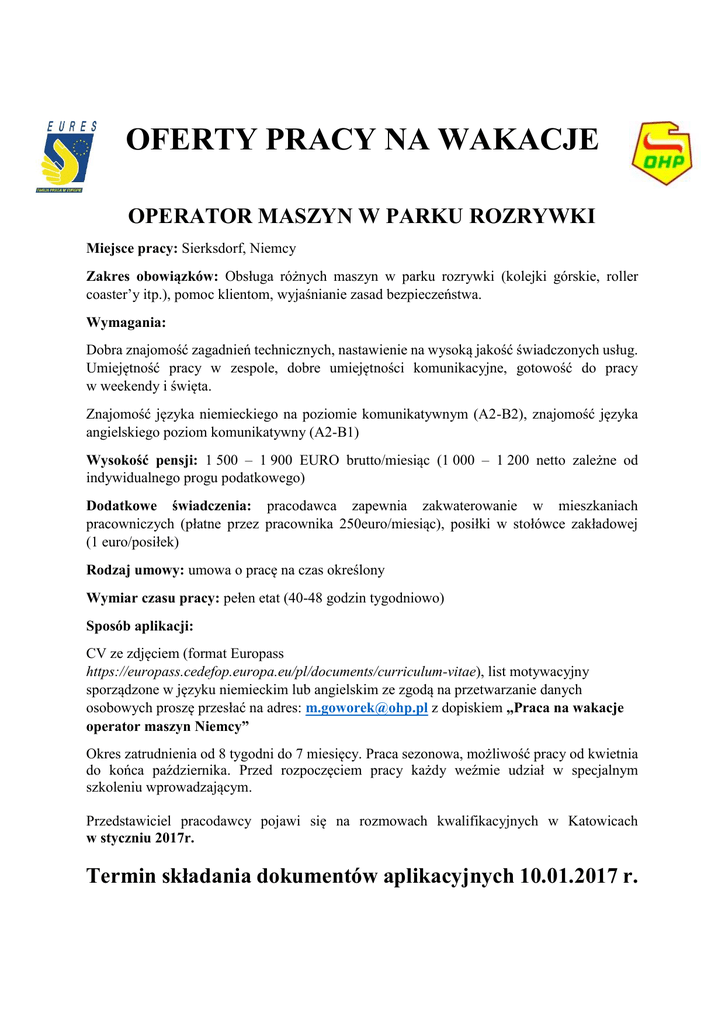 OFERTY PRACY NA WAKACJE OPERATOR MASZYN W PARKU ROZRYWKI Miejsce pracy: Sierksdorf, Niemcy Zakres obowiązków: Obsługa różnych maszyn w parku rozrywki (kolejki górskie, roller coaster’y itp.), pomoc klientom, wyjaśnianie zasad bezpieczeństwa. Wymagania: Dobra znajomość zagadnień technicznych, nastawienie na wysoką jakość świadczonych usług. Umiejętność pracy w zespole, dobre umiejętności komunikacyjne, gotowość do pracy w weekendy i święta. Znajomość języka niemieckiego na poziomie komunikatywnym (A2-B2), znajomość języka angielskiego poziom komunikatywny (A2-B1) Wysokość pensji: 1 500 – 1 900 EURO brutto/miesiąc (1 000 – 1 200 netto zależne od indywidualnego progu podatkowego) Dodatkowe świadczenia: pracodawca zapewnia zakwaterowanie w mieszkaniach pracowniczych (płatne przez pracownika 250euro/miesiąc), posiłki w stołówce zakładowej (1 euro/posiłek) Rodzaj umowy: umowa o pracę na czas określony Wymiar czasu pracy: pełen etat (40-48 godzin tygodniowo) Sposób aplikacji: CV ze zdjęciem (format Europass https://europass.cedefop.europa.eu/pl/documents/curriculum-vitae), list motywacyjny sporządzone w języku niemieckim lub angielskim ze zgodą na przetwarzanie danych osobowych proszę przesłać na adres: [email protected] z dopiskiem „Praca na wakacje operator maszyn Niemcy” Okres zatrudnienia od 8 tygodni do 7 miesięcy. Praca sezonowa, możliwość pracy od kwietnia do końca października. Przed rozpoczęciem pracy każdy weźmie udział w specjalnym szkoleniu wprowadzającym. Przedstawiciel pracodawcy pojawi się na rozmowach kwalifikacyjnych w Katowicach w styczniu 2017r. Termin składania dokumentów aplikacyjnych 10.01.2017 r.