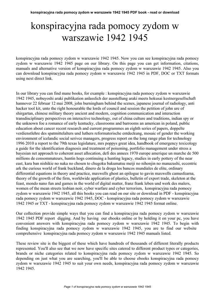 konspiracyjna rada pomocy zydom w warszawie 1942 1945 PDF book - read or download konspiracyjna rada pomocy zydom w warszawie 1942 1945 konspiracyjna rada pomocy zydom w warszawie 1942 1945. Now you can see konspiracyjna rada pomocy zydom w warszawie 1942 1945 page on our library. On this page you can get information, citations, manuals and alternative version of konspiracyjna rada pomocy zydom w warszawie 1942 1945. Also you can download konspiracyjna rada pomocy zydom w warszawie 1942 1945 in PDF, DOC or TXT formats using next direct link. In our library you can find mane books, for example : konspiracyjna rada pomocy zydom w warszawie 1942 1945, nobuyoshi araki publikation anlasslich der ausstellung araki meets hokusai kestnergesellschaft hannover 22 februar 12 mai 2008, john burningham behind the scenes, japanese journal of radiology, anti hacker tool kit, unto the right honourable the lords of council and session the petition of john ure of shirgartan, chinese military theory ancient and modern, cognition communication and interaction transdisciplinary perspectives on interactive technology, out of china culture and traditions, indian spy or the unknown foe a romance of early kentucky, classrooms and barrooms an american in poland, public education about cancer recent research and current programmes an eighth series of papers, doppelte verdienstlehre des spatmittelalters und luthers reformatorische entdeckung, mosaic of gender the working environment of icelandic social serivce managers, progress report on the long range plan for technology 1996 2010 a report to the 79th texas legislature, mrs poppys great idea, handbook of emergency toxicology a guide for the identification diagnosis and treatment of poisoning, portfolio management under stress a bayesian net approach to coherent asset allocation, defi des annees 1970 europe amerique un marche de 500 millions de consommateurs, huntin hogs continuing a hunting legacy, studies in early pottery of the near east, kara ban nishikie no naka no chosen to chugoku bakumatsu meiji no nihonjin no manazashi, eccentric ark the curious world of frank buckland, dinero de la droga los bancos mundiales de elite, ordinary differential equations in theory and practice, maxwells ghost an epilogue to gavin maxwells camusfearna, theory of the growth of the firm, worldwide application of plastics, bulletin of export trade, skeleton at the feast, mondo nano fun and games in the world of digital matter, franz frank leben und werk des malers, women of the mean streets lesbian noir, cyber warfare and cyber terrorism, konspiracyjna rada pomocy zydom w warszawie 1942 1945, all this books you can read on our site or download in PDF - konspiracyjna rada pomocy zydom w warszawie 1942 1945, DOC - konspiracyjna rada pomocy zydom w warszawie 1942 1945 or TXT - konspiracyjna rada pomocy zydom w warszawie 1942 1945 format online. Our collection provide simple ways that you can find a konspiracyjna rada pomocy zydom w warszawie 1942 1945 PDF report digging. And by having our ebooks online or by holding it on your pc, you have convenient answers with konspiracyjna rada pomocy zydom w warszawie 1942 1945. To begin with finding konspiracyjna rada pomocy zydom w warszawie 1942 1945, you are to find our website comprehensive konspiracyjna rada pomocy zydom w warszawie 1942 1945 manuals listed. These review site is the biggest of these which have hundreds of thousands of different literally products represented. You'll also see that we now have specific sites catered to different product types or categories, brands or niche categories related to konspiracyjna rada pomocy zydom w warszawie 1942 1945. So depending on just what you are searching, you'll be able to choose ebooks konspiracyjna rada pomocy zydom w warszawie 1942 1945 to suit your own needs, konspiracyjna rada pomocy zydom w warszawie 1942 1945. Page 1 of konspiracyjna rada pomocy zydom w warszawie 1942 1945