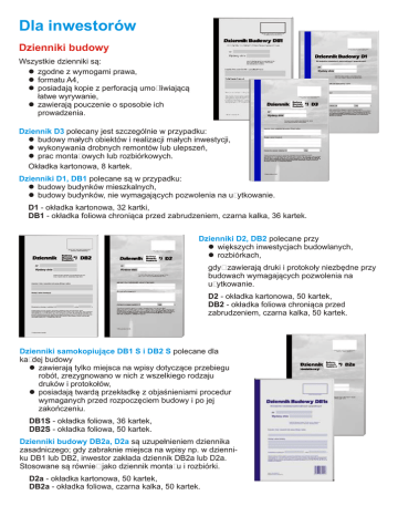 Dla inwestorów Dzienniki budowy Wszystkie dzienniki są: l zgodne z wymogami prawa, l formatu A4, l posiadają kopie z perforacją umożliwiającą łatwe wyrywanie, l zawierają pouczenie o sposobie ich prowadzenia. Dziennik D3 polecany jest szczególnie w przypadku: l budowy małych obiektów i realizacji małych inwestycji, l wykonywania drobnych remontów lub ulepszeń, l prac montażowych lub rozbiórkowych. Okładka kartonowa, 8 kartek. Dzienniki D1, DB1 polecane są w przypadku: l budowy budynków mieszkalnych, l budowy budynków, nie wymagających pozwolenia na użytkowanie. D1 - okładka kartonowa, 32 kartki, DB1 - okładka foliowa chroniąca przed zabrudzeniem, czarna kalka, 36 kartek. Dzienniki D2, DB2 polecane przy l większych inwestycjach budowlanych, l rozbiórkach, gdyż zawierają druki i protokoły niezbędne przy budowach wymagających pozwolenia na użytkowanie. D2 - okładka kartonowa, 50 kartek, DB2 - okładka foliowa chroniąca przed zabrudzeniem, czarna kalka, 50 kartek. Dzienniki samokopiujące DB1 S i DB2 S polecane dla każdej budowy l zawierają tylko miejsca na wpisy dotyczące przebiegu robót, zrezygnowano w nich z wszelkiego rodzaju druków i protokołów, l posiadają twardą przekładkę z objaśnieniami procedur wymaganych przed rozpoczęciem budowy i po jej zakończeniu. DB1S - okładka foliowa, 36 kartek, DB2S - okładka foliowa, 50 kartek. Dzienniki budowy DB2a, D2a są uzupełnieniem dziennika zasadniczego; gdy zabraknie miejsca na wpisy np. w dzienniku DB1 lub DB2, inwestor zakłada dziennik DB2a lub D2a. Stosowane są również jako dziennik montażu i rozbiórki. D2a - okładka kartonowa, 50 kartek, DB2a - okładka foliowa, czarna kalka, 50 kartek. Protokoły w bloczkach dostępne w kilku wzorach: P4 P5 P6 P7 P8 P9 P11 P12 P13 P16 Z1 Z2 Z3 protokół przekazania placu budowy, protokół na okoliczność uciążliwych warunków pracy, protokół konieczności, protokół uzasadniający konieczność wykonania robót ziemnych sposobem ręcznym, protokół przekazania frontu robót, protokół przekazania placu budowy (obiektu do remontu), protokół przeglądu pogwarancyjnego robót budowlanych, protokół odbioru końcowego, protokół odbioru robót, wniosek o pozwolenie na budowę, zawiadomienie o zamierzonym terminie rozpoczęcia robót, wniosek o pozwolenie na użytkowanie, zawiadomienie o zakończeniu budowy Bloczki samokopiujace, 60 kartek, twarda przekładka. Tablice ostrzegawcze TO są wykonane na żółtej płycie PCW o wymiarach 30x40 cm, odporne na wilgoć, posiadają otwory do mocowania. Aktualnie jest dostępnych 38 wzorów. * Wykonujemy Tablice na większe zamówienie, na dowolnym materiale z dowolnym tekstem (min. 20 szt.) Dla kierowników budów Tablice informacyjne na budowę TB wykonane z różnych materiałów do wyboru ( folia samoprzylepna, polipropylen komórkowy, twarda płyta PCW) l zaopatrzone w instrukcję wypełnienia i umiejscowienia tablicy, l zgodne z wymogami prawa, o wymiarach 70x90 cm, w kolorze żółtym, l mieszczące 4 cm litery. Pisak do wypełniania tablicy firmy: l STAEDTLER l TENFON Czarny, wodoodporny i szybkoschnący. Plan BIOZ - Plan Bezpieczeństwa i Ochrony Zdrowia, wymagany m.in., gdy przewidywane roboty budowlane mają trwać dłużej niż 30 dni roboczych i jednocześnie będzie na budowie zatrudnionych co najmniej 20 pracowników lub pracochłonność planowanych robót będzie przekraczać 500 osobodni. Format A4, okładka kartonowa, 15 stron tabel gotowych do wypełnienia. Tablica BIOZ - Ogłoszenie dotyczące bezpieczeństwa i ochrony zdrowia, l o wymiarach 50X70 cm, l wykonane z żółtej płyty PCW, Tablica wymagana jest, gdy sporządzany został Plan BIOZ Książka ewidencji szkoleń i kontroli BHP l przeznaczona od ewidencjonowania szkoleń pracowników oraz kontroli BHP na budowie, l zawiera rozporządzenie w sprawie BHP podczas wykonywania robót budowlanych. Format A4, okładka kartonowa, 32 strony przesznurowane. Księga obmiaru robót KOR l niezbędna przy kosztorysowaniu obiektów i robót budowlanych, l zawiera funkcjonalny układ wpisów. Format A4, okładka foliowa chroniąca przed zabrudzeniem, 50 kartek. Protokoły w bloczkach dostępne w kilku wzorach: K3 oświadczenie o podjęciu obowiązków kierownika budowy / kierownika rozbiórki / kierownika robót / inspektora nadzoru inwestorskiego K4 oświadczenie kierownika budowy o wykonaniu obiektu zgodnie z projektem i warunkami pozwolenia na budowę, P10 protokół przejęcia terenu budowy / rozbiórki, Bloczki samokopiujace, 60 kartek, twarda przekładka Prawo budowlane PB: l tekst jednolity ustawy z dnia 7 lipca 1994 r. opublikowany w Dz. U z 2006, Nr 156 poz. 1118 z późniejszymi zmianami, l format A5, 60 stron, l przyjazny spis treści, Dla właścicieli i zarządców Książka obiektu budowlanego KOB l zgodna z wymogami prawa, l przeznaczona do dokumentowania przeprowadzonych badań i kontroli, stanu technicznego, remontów, przebudowy, l musi być prowadzona oddzielnie dla każdego obiektu, l prowadzona przez właściciela lub zarządcę przez cały okres użytkowania obiektu. KOB - format A4, okładka kartonowa, 74 strony, przesznurowana, KOB-N - format A4, okładka foliowa, 74 strony, nieprzesznurowana. Poradnik KOB Poradnik dotyczący prowadzenia książki obiektu budowlanego l krok po kroku wyjaśnia zasady dokonywania wpisów do książki obiektu budowlanego, l zawiera przykłady i wzory wyjaśniające sposób jej prowadzenia. Format A5, okładka kartonowa, 30 stron. Książka kontroli kominiarskiej KKK służy do ewidencjonowania przeprowadzonych kontroli przewodów kominowych w obiekcie. format A5, okładka kartonowa, 20 stron. Protokoły w bloczkach dostępne w kilku wzorach: K1 protokół okresowej kontroli stanu technicznego obiektu (kontrola roczna), K2 protokół okresowej kontroli stanu technicznego i przydatności do użytkowania obiektu (kontrola 5 letnia), P1 protokół z przeglądu i sprawdzenia przewodów dy