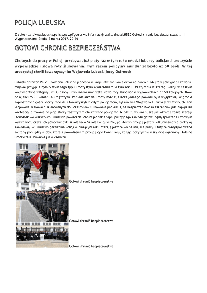 POLICJA LUBUSKA Źródło: http://www.lubuska.policja.gov.pl/go/serwis-informacyjny/aktualnosci/9510,Gotowi-chronic-bezpieczenstwa.html Wygenerowano: Środa, 8 marca 2017, 20:20 GOTOWI CHRONIĆ BEZPIECZEŃSTWA Chętnych do pracy w Policji przybywa. Już piąty raz w tym roku młodzi lubuscy policjanci uroczyście wypowiedzieli słowa roty ślubowania. Tym razem policyjny mundur założyło aż 50 osób. W tej uroczystej chwili towarzyszył im Wojewoda Lubuski Jerzy Ostrouch. Lubuski garnizon Policji, podobnie jak inne jednostki w kraju, otwiera swoje drzwi na nowych adeptów policyjnego zawodu. Majowe przyjęcie było piątym tego typu uroczystym wydarzeniem w tym roku. Od stycznia w szeregi Policji w naszym województwie wstąpiły już 83 osoby. Tym razem uroczyste słowa roty ślubowania wypowiedziało aż 50 kolejnych. Nowi policjanci to 10 kobiet i 40 mężczyzn. Poniedziałkowa uroczystość z jeszcze jednego powodu była wyjątkową. W gronie zaproszonych gości, którzy tego dnia towarzyszyli młodym policjantom, był również Wojewoda Lubuski Jerzy Ostrouch. Pan Wojewoda w słowach skierowanych do uczestników ślubowania podkreślił, że bezpieczeństwo mieszkańców jest najwyższa wartością, a trwanie na jego straży zaszczytem dla każdego policjanta. Młodzi funkcjonariusze już wkrótce zasilą szeregi jednostek we wszystkich lubuskich powiatach. Zanim jednak adepci policyjnego zawodu gotowi będą sprostać służbowym wyzwaniom, czeka ich półroczny cykl szkolenia w Szkole Policji w Pile, po którym przejdą jeszcze kilkumiesięczna praktyką zawodową. W lubuskim garnizonie Policji w bieżącym roku czekają jeszcze wolne miejsca pracy. Etaty te rozdysponowane zostaną pomiędzy osoby, które z powodzeniem przejdą cykl kwalifikacji, zdając pozytywnie wszystkie egzaminy. Kolejne uroczyste ślubowanie już w czerwcu. Gotowi chronić bezpieczeństwa Gotowi chronić bezpieczeństwa Gotowi chronić bezpieczeństwa Gotowi chronić bezpieczeństwa Gotowi chronić bezpieczeństwa Gotowi chronić bezpieczeństwa Gotowi chronić bezpieczeństwa Gotowi chronić bezpieczeństwa Gotowi chronić bezpieczeństwa Gotowi chronić bezpieczeństwa Gotowi chronić bezpieczeństwa Gotowi chronić bezpieczeństwa Gotowi chronić bezpieczeństwa Gotowi chronić bezpieczeństwa Gotowi chronić bezpieczeństwa Gotowi chronić bezpieczeństwa Ocena: 0/5 (0) Tweetnij