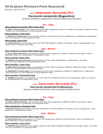 50 Krajowa Wystawa Psów Rasowych Koszalin 20.07.2014 r. Aleksander Skrzyński (PL) Owczarek niemiecki długowłosy Sędzia: Deutscher Schäferhund Langstockhaar / German Shepherd Dog Long-haired Psy - Dogs Klasa młodszych szczeniąt / Minor Puppy Class 30. GRIS von Skorpionenblut, czarne podpalane, 04-03-2014, PKR w przygotowaniu, 5842/XLII/14, (GRISU vom Frankengold - BRANDY vom Gran Peregrino), hod. Hanna Gajtkowska, wł. Hanna Gajtkowska, Polska Klasa młodzieży / Junior Class 31. BOSTON von Skorpionenblut, czarne podpalane, 03-06-2013, PKR.I-74444, 5747/XLII/13, (OSKAR Wolf-Jar - ZERAPHINA von Zellwaldrand), hod. Hanna Gajtkowska, wł. Hanna Gajtkowska, Polska Klasa otwarta / Open Class 32. ŁATEK Dobrzyków, czarne podpalane, 28-01-2012, PKR.I-70026, 8590/IX/12, (JOKER vom Eichenplatz - MAXI ze Skalnego Wzgórza), hod. Bernard Famuła, wł. Marzena Falarz, Polska Suki - Bitches Klasa młodszych szczeniąt / Minor Puppy Class 33. GOJA z Więcborskiej Doliny, czarne podpalane, 06-02-2014, PKR w przygotowaniu, 21589/XII/14, (WENTYL Nova-Langfuhr - ŁEZKA z Więcborskiej Doliny), hod. Lech Bardoński, wł. Lech Bardoński, Polska Klasa szczeniąt / Puppy Class 34. DEMONA von Skorpionenblut (FCI), czarne podpalane, 23-12-2013, PKR.I-74789, 8946/IX/13, (OSKAR Wolf-Jar - LUKA REDAlert), hod. Hanna Gajtkowska, wł. Aleksandra Rutecka, Polska Klasa młodzieży / Junior Class 35. ABRA-AZTRA z Piaszczystej Górki, czarne podpalane, 23-03-2013, PKR w przygotowaniu, 8804/IX/13, (ORION Mavic Poland - TINA Mavic Poland), hod. Bogusław Szabat, wł. Marzena Falarz, Polska 36. AMBASADA von Skorpionenblut, czarne podpalane, 30-03-2013, PKR w przygotowaniu, 5596/XLII/13, (OSKAR Wolf-Jar - ULMA-UNKA z Piaszczystej Górki), hod. Hanna Gajtkowska, wł. Hanna Gajtkowska, Polska Klasa pośrednia / Intermediate Class 37. KARMEN vom Lamorak, czarne podpalane, 12-11-2012, PKR.I-72179, 3920/XXXI/12, (PACCO vom Langenbungert - DUFTE vom Lamorak), hod. Silke Bretschneider, wł. Aneta Kotkowicz, Polska Sędzia: Aleksander Skrzyński (PL) Owczarek niemiecki krótkowłosy Deutscher Schäferhund Stockhaar / German Shepherd Dog Short-haired Psy - Dogs Klasa młodszych szczeniąt / Minor Puppy Class 38. FARAT z Więcborskiej Doliny, czarne podpalane, 05-02-2014, PKR w przygotowaniu, 21689/XII/14, (WENTYL Nova-Langfuhr - BAJA z Więcborskiej Doliny), hod. Lech Bardoński, wł. Lech Bardoński, Polska Klasa championów / Champion Class 39.LEO Mavic Poland, czarne podpalane, 06-07-2009, PKR.I-65279, 14213/XXI/09, (ZAMP vom Thermodos - IKA vom Farbenspiel), hod. Adrian Dobrzański, wł. Anna Mielnikiewicz, Polska Suki - Bitches Klasa młodszych szczeniąt / Minor Puppy Class 40. HALLE Arkona Park, czarne podpalane, 31-01-2014, PKR w przygotowaniu, 8981/IX/14, (LEO Mavic Poland - JONA vom Urstromtal), hod. Dariusz Makarewicz, wł. Dariusz Makarewicz, Polska Klasa młodzieży / Junior Class 41. BALBINKA Anarchia Box FCI, czarne podpalane, 08-09-2013, PKR.I-73628, 15636/XXI/13, (NELSON vom Frankengold - DIANA Tom-And-Box FCI), hod. Luiza Nilsson, wł. Luiza Nilsson, Polska 42. JESSI z Więcborskiej Doliny, czarne podpalane, 22-03-2013, PKR w przygotowaniu, 21481/XII/13, (NICO Stan Lech - ALASKA z Więcborskiej Doliny),hod. Lech Bardonski, wł. Lech Bardoński, Polska Klasa pośrednia / Intermediate Class 43. WHITNEY z Gargamellu, czarne, 16-03-2013, PKR.I-74580, 8941/IX/13, (WOLTAIR Gaja-Nova - KIRKE Vepeden), hod. Petra Furstova, wł. Dariusz Lorenc, Polska Klasa otwarta / Open Class 44. URMI z Więcborskiej Doliny, czarne podpalane, 08-10-2011, PKR.I-70520, 8624/IX/11, (DOLLAR vom Zellwaldrand - OSA Stan Lech), hod. Lech Bardoński, wł. Tomasz Kaczmarek, Polska Klasa użytkowa / Working Class 45.JOLLY vom Urstromtal, czarne podpalane, 15-11-2009, PKR.I-65950, 8306/IX/09, (JIMMY vom Baruther Land - CINDY vom Urstromtal), hod. Fred Heinze, wł. Dariusz Lorenc, Polska