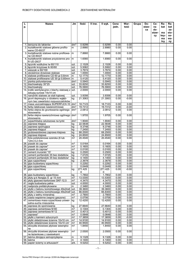 ROBOTY DODATKOWE GOLDMEDICA 2 L p. Nazwa Jm Ilość dm3 m 0.9299 2.8980 0.9299 2.8980 0.00 0.00 0.00 0.00 m 7.8660 7.8660 0.00 0.00 m 1.6560 1.6560 0.00 0.00 szt. szt. szt. szt m m dm3 szt. szt. szt. 2.1528 5.5062 3.7674 1.0000 12.1770 5.4120 0.5945 33.8250 76.5900 2.0000 2.1528 5.5062 3.7674 1.0000 12.1770 5.4120 0.5945 33.8250 76.5900 2.0000 0.00 0.00 0.00 0.00 0.00 0.00 0.00 0.00 0.00 0.00 0.00 0.00 0.00 0.00 0.00 0.00 0.00 0.00 0.00 0.00 szt. kg 3.9356 21.3063 3.9356 21.3063 0.00 0.00 0.00 -0.00 dm3 dm3 dm3 18.7123 19.7312 2.0812 18.7123 19.7312 2.0812 0.00 0.00 0.00 0.00 -0.00 0.00 dm3 1.9705 1.9705 0.00 0.00 dm3 kg kg kg kg kg m2 1.9040 22.5838 9.3748 7.2450 68.2500 24.8500 20.4540 1.9040 22.5838 9.3748 7.2450 68.2500 24.8500 20.4540 0.00 0.00 0.00 0.00 0.00 0.00 0.00 0.00 0.00 0.00 0.00 0.00 0.00 0.00 0.0164 0.1605 0.0100 0.2500 7.0725 4.1400 2.3678 0.2292 0.0449 271.425 0 gips budowlany szpachlowy kg 1.7802 płyty g-k Norgips S gr 15 mm m2 13.5300 płyty gipsowo-kartonowe GKF-12,5 m2 4.3470 cegła budowlana pełna szt. 4.0000 nadproża prefabrykowane m 2.3460 płytki z betonu komórkowego 49x24x6 szt. 39.3600 płytki z betonu komórkowego 49x24x6' szt. 66.8300 płyty z wełny mineralnej m2 2.7800 ciasto wapienne (wapno gaszone) m3 0.0706 cementowa masa szpachlowa uniwer- kg 12.4200 salna-sucha mieszanka zaprawa do spoinowania kg 27.6640 zaprawa cementowa M 80 m3 0.1304 zaprawa cementowa M 12 m3 0.4013 zaprawa'' m3 0.0648 płytki z kamieni sztucznych m2 17.3859 płytki okładzinowe ścienne 10x10 cm m2 14.9100 płytki okładzinowe ścienne 10x10 cm' m2 40.9500 skrzydła drzwiowe płytowe wewnętrz- m2 1.8450 ne skrzydła drzwiowe płytowe wewnętrz- m2 2.0500 ne łazienkowe z nawiewkami taśma zbrojąca samoprzylepna m 9.1328 taśma m 4.1400 papier ścierny w arkuszach' ark. 9.5202 0.0164 0.1605 0.0100 0.2500 7.0725 4.1400 2.3678 0.2292 0.0449 271.425 0 1.7802 13.5300 4.3470 4.0000 2.3460 39.3600 66.8300 2.7800 0.0706 12.4200 0.00 0.00 0.00 0.00 0.00 0.00 0.00 0.00 0.00 0.00 0.00 0.00 0.00 0.00 0.00 0.00 0.00 0.00 0.00 -0.00 0.00 0.00 0.00 0.00 0.00 0.00 0.00 0.00 0.00 0.00 0.00 0.00 0.00 0.00 0.00 0.00 0.00 0.00 0.00 0.00 27.6640 0.1304 0.4013 0.0648 17.3859 14.9100 40.9500 1.8450 0.00 0.00 0.00 0.00 0.00 0.00 0.00 0.00 0.00 0.00 0.00 0.00 -0.00 0.00 0.00 0.00 2.0500 0.00 0.00 9.1328 4.1400 9.5202 0.00 0.00 0.00 0.00 0.00 0.00 1. benzyna do lakierów 2. kształtowniki stalowe główne profilowane CD-60/27 3. kształtowniki stalowe nośne profilowane CD-60/27 4. kształtowniki stalowe przyścienne profil UD-28/27 5. łączniki wzdłużne Iw 60/110 6. łączniki krzyżowe Ik 60/60 7. wieszak w 60/100 8. ościeżnice drzwiowe stalowe 9. stalowe profilowane CD 60 gr.0,6mm 10. stalowe profilowane UD 30 gr.0,60mm 11. pianka poliuretanowa 12. blachowkręty 35*25 13. blachowkręty 14. kratki wentylacyjne z blachy stalowej z żaluzją surowe 14x14 cm 15. narożniki stalowe ze stali kątowej 16. grunt depresyjny o działaniu wgłębnym bez zawartości rozpuszczalników 17. masa uszczelniająca SUPERFLEX-10 18. farby lateksowe nawierzchniowe 19. farba olejna do gruntowania ogólnego stosowania 20. farba olejna nawierzchniowa ogólnego stosowania 21. szpachlówka celulozowa na tynki 22. zaprawa klejąca 23. zaprawa spoinująca 24. zaprawa klejąca' 25. grubowarstwowa zaprawa klejowa 26. zaprawa klejowa 27. folia polietylenowa szeroka (6 lub 12m) 0.2 mm 28. piasek do zapraw 29. piasek do zapraw'' 30. piasek do zapraw' 31. cement murarski '15' 32. cement portlandzki 35 bez dodatków 33. cement portlandzki 35 bez dodatków' 34. gips szpachlowy' 35. gips budowlany szpachlowy 36. gips szpachlowy 37. gips szpachlowy 38. 39. 40. 41. 42. 43. 44. 45. 46. 47. 48. 49. 50. 51. 52. 53. 54. 55. 56. 57. 58. 59. ZESTAWIENIE MATERIAŁÓW Il inw. m3 m3 m3 kg kg kg kg t t kg -1- Norma PRO Wersja 4.29 Licencja: 22359 dla Małgorzata Lenarczyk Il wyk. Cena jedn. Wartość Grupa Dostawca Ce- Ra- Rana bat bat dozastaw- ma stocy ksy- soma walny ny ROBOTY DODATKOWE GOLDMEDICA 2 L p. Nazwa 60. 61. 62. 63. 64. 65. woda woda z rurociągu woda' woda z rurociągu' woda ościeżnice regulowane drewniane z opaskami rury stalowe ze szwem gwintowane typ S ocynkowane śr.15 mm rury stalowe instalacyjne z/s typ S średnie ocynk.z końcami gwint. 100 mm rury stalowe instalacyjne z/s typ S średnie ocynk.z końcami gwint. 100 mm' korki z żeliwa ciągliwego ocynkowane śr. 15 mm korki z żeliwa ciągliwego ocynkowane śr. 32 mm złączki nakrętne z żeliwa ciągliwego, ocynkowane śr. 15 mm korki z obrzeżem z żeliwa ciągliwego ocynkowane śr.15 mm korki żeliwne kanalizacyjne śr.50 mm korki żeliwne do rur kanalizacyjnych śr. 100 mm kabina narożna w komplecie z brodzikiem i syfonem rury Hep2O "barrier" 15 mm kształtki Hep2O 15 mm kształtki kanalizacyjne z PCW 50 mm kształtki kanalizacyjne z PCW 110 mm uchwyty do rur PCW wykonane z blachy stalowej o śr. 50 mm uchwyty do rur PCW wykonane z blachy stalowej o śr. 110 mm baterie natryskowe ścienne 15 mm baterie umywalkowe stojące 15 mm syfony umywalkowe mosiężne ze spustem i rurą odpływową śr.32 mm przyłącza elastyczne w oplocie u stali kwasoodpornej zawory przelotowe proste mosiężne o śr. nominalnej 10-15 mm grzejniki stalowe łazienkowe, drabinkowe, i lakierowane z kompletem uchwytów montażowych tuleje wspomagające 15 mm tuleje ochronne do rur Hep2O z tworzywa sztucznego rura wywiewna żeliwna 100 mm wpusty ściekowe podłogowe z rusztem umywalki prostokątne lub trapezowe porcelanowe umywalki prostokątne lub trapezowe porcelanowe' urządzenia sanitarne 'kompakt' porcelanowe białe z deską wolnoopadającą wsporniki do umywalek porcelanowych haki do rur śr. 10-32 mm haki do rur uchwyty do rur Hep2O przykręcane 15 mm Kołki rozporowe (dyble) uszczelki gumowe pierścieniowe do rur PCW 50 mm uszczelki gumowe pierścieniowe do rur PCW 110 mm 66. 67. 68. 69. 70. 71. 72. 73. 74. 75. 76. 77. 78. 79. 80. 81. 82. 83. 84. 85. 86. 87. 88. 89. 90. 91. 92. 93. 94