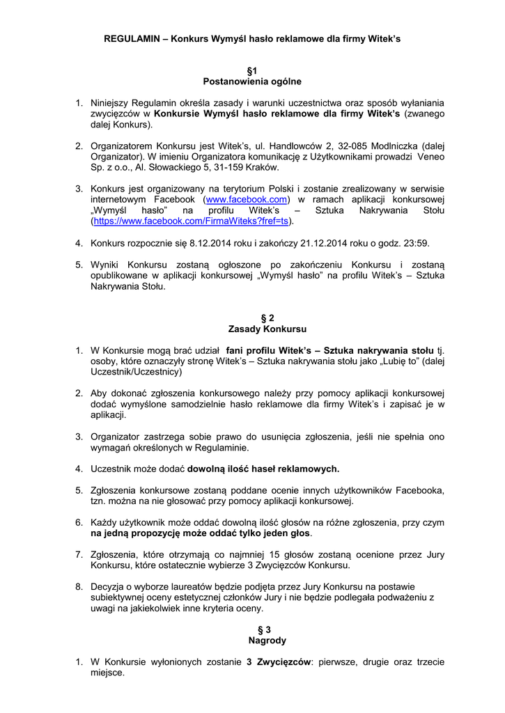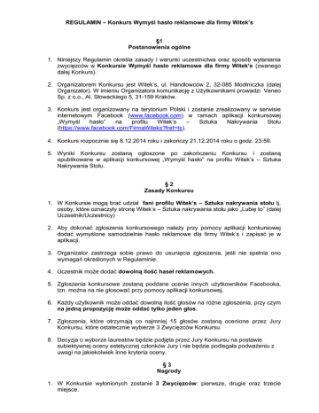REGULAMIN – Konkurs Wymyśl hasło reklamowe dla firmy Witek’s §1 Postanowienia ogólne 1. Niniejszy Regulamin określa zasady i warunki uczestnictwa oraz sposób wyłaniania zwycięzców w Konkursie Wymyśl hasło reklamowe dla firmy Witek’s (zwanego dalej Konkurs). 2. Organizatorem Konkursu jest Witek’s, ul. Handlowców 2, 32-085 Modlniczka (dalej Organizator). W imieniu Organizatora komunikację z Użytkownikami prowadzi Veneo Sp. z o.o., Al. Słowackiego 5, 31-159 Kraków. 3. Konkurs jest organizowany na terytorium Polski i zostanie zrealizowany w serwisie internetowym Facebook (www.facebook.com) w ramach aplikacji konkursowej „Wymyśl hasło” na profilu Witek’s – Sztuka Nakrywania Stołu (https://www.facebook.com/FirmaWiteks?fref=ts). 4. Konkurs rozpocznie się 8.12.2014 roku i zakończy 21.12.2014 roku o godz. 23:59. 5. Wyniki Konkursu zostaną ogłoszone po zakończeniu Konkursu i zostaną opublikowane w aplikacji konkursowej „Wymyśl hasło” na profilu Witek’s – Sztuka Nakrywania Stołu. §2 Zasady Konkursu 1. W Konkursie mogą brać udział fani profilu Witek’s – Sztuka nakrywania stołu tj. osoby, które oznaczyły stronę Witek’s – Sztuka nakrywania stołu jako „Lubię to” (dalej Uczestnik/Uczestnicy) 2. Aby dokonać zgłoszenia konkursowego należy przy pomocy aplikacji konkursowej dodać wymyślone samodzielnie hasło reklamowe dla firmy Witek’s i zapisać je w aplikacji. 3. Organizator zastrzega sobie prawo do usunięcia zgłoszenia, jeśli nie spełnia ono wymagań określonych w Regulaminie. 4. Uczestnik może dodać dowolną ilość haseł reklamowych. 5. Zgłoszenia konkursowe zostaną poddane ocenie innych użytkowników Facebooka, tzn. można na nie głosować przy pomocy aplikacji konkursowej. 6. Każdy użytkownik może oddać dowolną ilość głosów na różne zgłoszenia, przy czym na jedną propozycję może oddać tylko jeden głos. 7. Zgłoszenia, które otrzymają co najmniej 15 głosów zostaną ocenione przez Jury Konkursu, które ostatecznie wybierze 3 Zwycięzców Konkursu. 8. Decyzja o wyborze laureatów będzie podjęta przez Jury Konkursu na postawie subiektywnej oceny estetycznej członków Jury i nie będzie podlegała podważeniu z uwagi na jakiekolwiek inne kryteria oceny. §3 Nagrody 1. W Konkursie wyłonionych zostanie 3 Zwycięzców: pierwsze, drugie oraz trzecie miejsce. 2. Nagrody przewidziane w Konkursie ufundował Organizator: Nagroda za pierwsze miejsce: Serwis do kawy Lotos Nagroda za drugie miejsce: Zestaw porcelanowych miseczek Nagroda za trzecie miejsce: Zestaw dwóch filiżanek §4 Wyłonienie zwycięzców i wysyłka nagród 1. Imiona i nazwiska zwycięzców zostaną opublikowane w aplikacji konkursowej na profilu Witek’s – Sztuka nakrywania stołu w serwisie Facebook. 2. Organizator zastrzega sobie prawo weryfikacji danych podanych przez Uczestnika podczas rejestracji oraz prawo do zdyskwalifikowania Uczestnika posługującego się fałszywymi danymi bez konieczności przedstawiania metod weryfikacji. 3. Organizator zastrzega sobie prawo do zdyskwalifikowania Uczestnika, wobec którego zajdzie podejrzenie, iż zgromadził głosy nieuczciwie bez konieczności przedstawiania metod weryfikacji. 4. Po publikacji listy Zwycięzców wymienione na profilu osoby są zobowiązane do wysłania w wiadomości do strony dokładnego adresu umożliwiającego wysyłkę nagrody. Jeżeli w ciągu 5 dni roboczych od opublikowania listy Zwycięzców, Zwycięzca nie prześle danych adresowych – traci prawo do nagrody. 5. Koszty wysyłki pokrywa Organizator. 6. Adres wskazany do wysyłki nagrody może dotyczyć wyłącznie terytorium Rzeczpospolitej Polskiej. 7. Organizator nie ponosi odpowiedzialności za prawidłowości i terminy doręczenia przesyłek przez Pocztę Polską i firmy kurierskie. 8. Zwycięzcom nie przysługuje prawo do wymiany nagród na gotówkę czy nagrodę innego rodzaju ani odstąpienie nagrody osobom trzecim. 9. Zwycięzcy konkursu zgadzają się na nieodpłatne przekazanie Organizatorowi całości autorskich praw majątkowych do wymyślonych haseł reklamowych. §5 Postanowienia końcowe 1. Wzięcie udziału w Konkursie jest równoznaczne z akceptacją niniejszego Regulaminu. 2. Organizator zastrzega sobie prawo do zmian niniejszego Regulaminu oraz przedłużenia czasu trwania Konkursu bez podania przyczyny, ale po wcześniejszym zawiadomieniu Uczestników Konkursu. 3. Dane osobowe uczestników Konkursu będą przetwarzane tylko i wyłącznie dla potrzeb Konkursu i kontaktu z Uczestnikami Konkursu. 4. W kwestiach nieobjętych niniejszym regulaminem stosuje się odpowiednie przepisy Kodeksu Cywilnego. 5. Niniejsza Promocja nie stanowi gry losowej w rozumieniu art. 2 ust. 1 pkt. 10 Ustawy z dnia 19 listopada 2009 r. o grach hazardowych (Dz.U. z 2009 r., Nr 201, poz. 1540), a o jej rozstrzygnięciu decydują działania i umiejętności Uczestnika, subiektywna ocena Użytkowników Serwisu Facebook oraz ocena Jury.