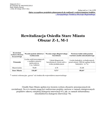 Załącznik Nr 2 do Uchwały Nr 546/XXXII/2013 Rady Miasta Płocka z dnia 26 lutego 2013 roku Załącznik nr 2 do LPR Opisy szczegółowe projektów planowanych do realizacji z wykorzystaniem środków z Europejskiego Funduszu Rozwoju Regionalnego Rewitalizacja Osiedla Stare Miasto Obszar Z-1, M-1 Kryterium Wysoki poziom ubóstwa i Wysoka stopa długotrwałego wyboru obszaru wykluczenia bezrobocia kryzysowego Porównywalnie niski poziom wartości zasobu mieszkaniowego Wskaźnik Liczba osób korzystających z zasiłków pomocy społecznej na 1 tys. ludności Udział długotrwale bezrobotnych wśród osób w wieku produkcyjnym Liczba budynków wybudowanych przed rokiem 1989/do ogólnej liczby budynków (w %) Mazowieckie 70,00 4,70 81,00 Stare Miasto 110,48* 9,71* 89,64* * wartości referencyjne „gorsze” niż średnia dla województwa mazowieckiego Osiedle Stare Miasto spełnia trzy kryteria wyboru obszarów przeznaczonych do rewitalizacji. Na w/w terenie mogą być realizowane projekty zarówno w ramach zintegrowanych projektów odnowy miejskiej (kategoria interwencji 61), jak i w ramach infrastruktury mieszkalnictwa (kategoria interwencji 78). Załącznik nr 2 do LPR Opisy szczegółowe projektów planowanych do realizacji z wykorzystaniem środków z Europejskiego Funduszu Rozwoju Regionalnego Tytuł projektu Opis ogólny projektu Rewitalizacja Zespołu Zabytkowego Fara wraz z otoczeniem Zespół Zabytkowy Fara tworzą: Kościół Parafialny św. Bartłomieja, Dzwonnica i Plebania. Wszystkie ww. obiekty oraz otoczenie w promieniu 100 m od Kościoła św. Bartłomieja posiadają indywidualny wpis do rejestru zabytków. W związku z istotnym kulturowo i historycznie znaczeniem Zespołu Zabytkowego Fara rewitalizacja jego obiektów jest niezbędna dla zachowania dziedzictwa narodowego miasta i regionu. Szeroki i kosztowny zakres prac remontowo – konserwatorskich, a także specyfika obiektów uzasadnia realizację inwestycji w następujących etapach: ETAP I: Prace projektowe oraz remontowo-budowlane niezbędne do utrzymania obiektu (prace projektowe oraz niezbędne badania architektoniczne, geologiczne i archeologiczne; remont elewacji kościoła; konserwacja wieży; prace remontowe we wnętrzu kościoła: posadzka, ogrzewanie, wymiana tynków, nowa instalacja elektryczna, p.poż., alarm, monitoring, centralne ogrzewanie, nowe schody na chór, strych i kapitularz, podłoga na chórze i na kapitularzu, remont więźby dachowej i konstrukcji sygnaturki; remont dzwonnicy: remont konstrukcji wewnątrz dzwonnicy, wymiana tynków i malowanie elewacji). ETAP II: Prace konserwatorskie wewnątrz kościoła (odnowienie malatury, renowacja ołtarzy, badanie krypt i ewentualna ich ekspozycja) ETAP III: Zagospodarowanie terenu (obniżenie terenu, modernizacja odwodnienia, badania archeologiczne i ewentualna ekspozycja wykopalisk, urządzenie zieleni, naprawa parkanu) ETAP IV: Wykonanie elewacji plebanii. Atrakcyjność Starego Miasta Płocka, a tym samym całego jego obszaru i regionu obniża degradacja infrastruktury oraz przestrzeni miejskich. Cechą charakterystyczną osiedla Stare Miasto w Płocku jest skupienie w bliskim sąsiedztwie wielu cennych obiektów architektury i historii. Jest to najbardziej atrakcyjny pod względem turystycznym obszar Płocka. Płocka Fara i związane z nią obiekty od ponad 600 lat są świadkami ważnych wydarzeń mających swoje miejsce na rynku Starego Miasta. Wielokrotnie przebudowywana świątynia kryje w sobie tajemnice wielu pokoleń płocczan różnej narodowości. W roku 2004 pod posadzką kościoła odkryto średniowieczne krypty, z zapisów historycznych wiadomo, że wokół niego istniał kiedyś cmentarz. Zachowanie tych zabytków w dobrym stanie jest bardzo ważne dla poznania historii miasta. Planowany okres realizacji projektu 2009 - 2015 Nazwa beneficjenta Rzymskokatolicka Parafia Św. Bartłomieja Płock, ul. Kazimierza Wielkiego 1 Planowane źródło finansowania w rozbiciu na lata realizacji Lata realizacji 2009 2010 Budżet Miasta 200 000 2011 80 000 2012 63 640 2013 2014 311 200 100 000 3 000 000 700 000 2015 150 000 MFOŚiGW Środki unijne Środki własne 166 000 Inne 55 000 OGÓŁEM 221 000 87 000 136 000 288 360 200 000 150 000 150 000 287 000 216 000 352 000 3 511 200 950 000 300 000 Łączna szacunkowa wartość projektu: 5 837 200 zł Komplementarność • • • • • • • • Rozbudowa i adaptacja kamienicy przy ul. Tumskiej dla potrzeb Muzeum Mazowieckiego w Płocku; Przebudowa i modernizacja ul. Tumskiej wraz z infrastrukturą; Przebudowa opactwa pobenedyktyńskiego oraz oficyny przy Domu pod Trąbami na Wzgórzu Tumskim; Modernizacja płockiego kina „Przedwiośnie”; Adaptacja zabytkowej mykwy żydowskiej na siedzibę Płockiej Galerii Sztuki - komplementarność związana z rewitalizacją Starego Miasta; Przebudowa i modernizacja teatru im. Jerzego Szaniawskiego w Płocku; ADHOC Rozwój historycznych starówek w środkowej i wschodniej Europie dostosowany do społecznych i demograficznych zmian - komplementarność związana z implementacją rozwiązań na rzecz m.in. wykorzystywania pustych przestrzeni Starówki; EuRoB – Instytucjonalizacja europejskiego szlaku gotyku ceglanego – marketing inspirowanego kulturą i historią turystycznego szlaku dziedzictwa gotyku ceglanego oraz związanych z nim ofert kulturalnych - komplementarność związana z zapewnieniem dostępu do obiektów Szlaku Gotyku Ceglanego powstałego w ramach projektu. Załącznik nr 2 do LPR Opisy szczegółowe projektów planowanych do realizacji z wykorzystaniem środków z Europejskiego Funduszu Rozwoju Regionalnego Tytuł projektu Opis ogólny projektu Rewitalizacja zabytkowych budynków dawnego Kolegium i dawnej Kolegiaty św. Michała w Płocku Głównym założeniem projektu jest remont i konserwacja zabytkowych budynków dawnego Kolegium i dawnej Kolegiaty w Płocku będących siedzibą Liceum Ogólnokształcącego im. Marszałka Stanisława
