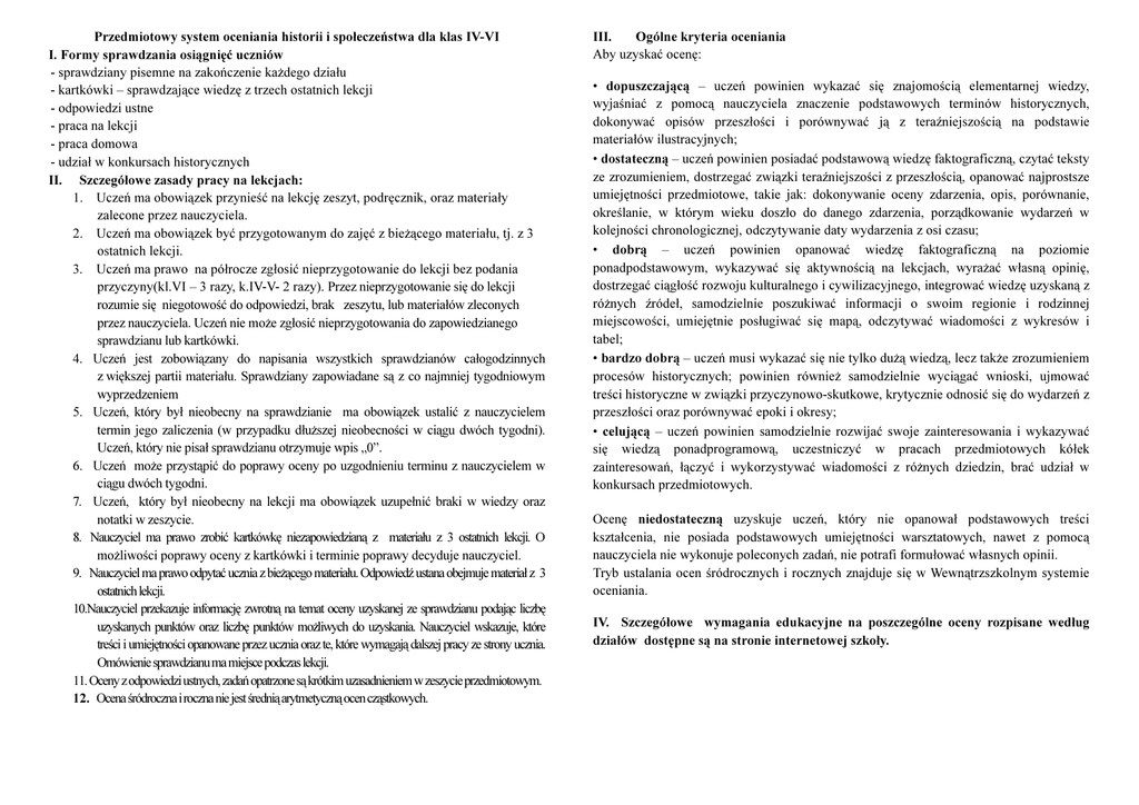 Przedmiotowy system oceniania historii i społeczeństwa dla klas IV