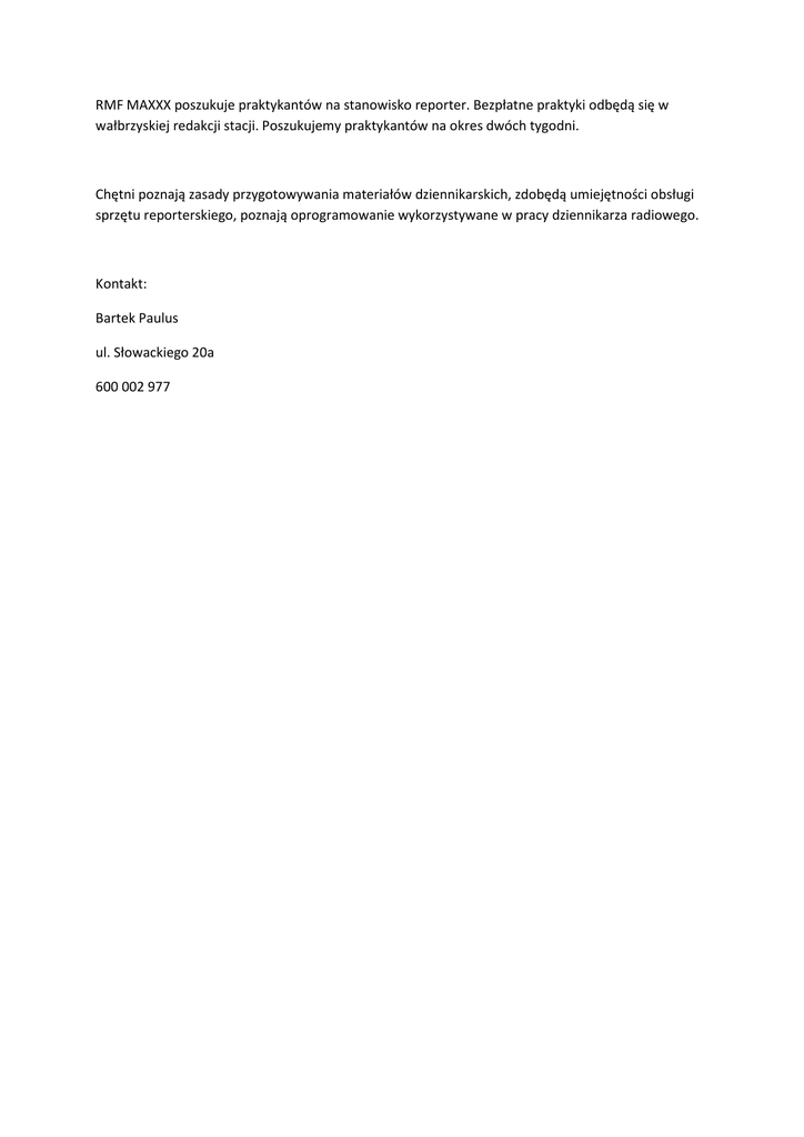 RMF MAXXX poszukuje praktykantów na stanowisko reporter. Bezpłatne praktyki odbędą się w wałbrzyskiej redakcji stacji. Poszukujemy praktykantów na okres dwóch tygodni. Chętni poznają zasady przygotowywania materiałów dziennikarskich, zdobędą umiejętności obsługi sprzętu reporterskiego, poznają oprogramowanie wykorzystywane w pracy dziennikarza radiowego. Kontakt: Bartek Paulus ul. Słowackiego 20a 600 002 977