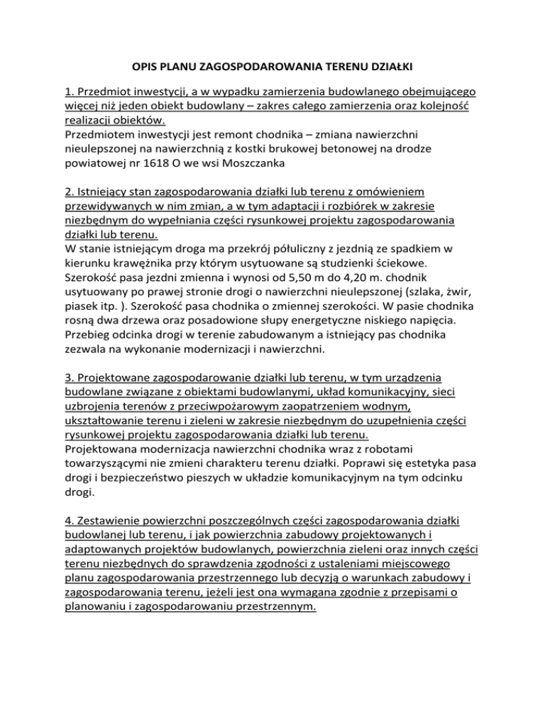 OPIS PLANU ZAGOSPODAROWANIA TERENU DZIAŁKI 1. Przedmiot inwestycji, a w wypadku zamierzenia budowlanego obejmującego więcej niż jeden obiekt budowlany – zakres całego zamierzenia oraz kolejność realizacji obiektów. Przedmiotem inwestycji jest remont chodnika – zmiana nawierzchni nieulepszonej na nawierzchnią z kostki brukowej betonowej na drodze powiatowej nr 1618 O we wsi Moszczanka 2. Istniejący stan zagospodarowania działki lub terenu z omówieniem przewidywanych w nim zmian, a w tym adaptacji i rozbiórek w zakresie niezbędnym do wypełniania części rysunkowej projektu zagospodarowania działki lub terenu. W stanie istniejącym droga ma przekrój półuliczny z jezdnią ze spadkiem w kierunku krawężnika przy którym usytuowane są studzienki ściekowe. Szerokość pasa jezdni zmienna i wynosi od 5,50 m do 4,20 m. chodnik usytuowany po prawej stronie drogi o nawierzchni nieulepszonej (szlaka, żwir, piasek itp. ). Szerokość pasa chodnika o zmiennej szerokości. W pasie chodnika rosną dwa drzewa oraz posadowione słupy energetyczne niskiego napięcia. Przebieg odcinka drogi w terenie zabudowanym a istniejący pas chodnika zezwala na wykonanie modernizacji i nawierzchni. 3. Projektowane zagospodarowanie działki lub terenu, w tym urządzenia budowlane związane z obiektami budowlanymi, układ komunikacyjny, sieci uzbrojenia terenów z przeciwpożarowym zaopatrzeniem wodnym, ukształtowanie terenu i zieleni w zakresie niezbędnym do uzupełnienia części rysunkowej projektu zagospodarowania działki lub terenu. Projektowana modernizacja nawierzchni chodnika wraz z robotami towarzyszącymi nie zmieni charakteru terenu działki. Poprawi się estetyka pasa drogi i bezpieczeństwo pieszych w układzie komunikacyjnym na tym odcinku drogi. 4. Zestawienie powierzchni poszczególnych części zagospodarowania działki budowlanej lub terenu, i jak powierzchnia zabudowy projektowanych i adaptowanych projektów budowlanych, powierzchnia zieleni oraz innych części terenu niezbędnych do sprawdzenia zgodności z ustaleniami miejscowego planu zagospodarowania przestrzennego lub decyzją o warunkach zabudowy i zagospodarowania terenu, jeżeli jest ona wymagana zgodnie z przepisami o planowaniu i zagospodarowaniu przestrzennym. - ogólna powierzchnia pasa chodnika _________________________1283,00 m2 - powierzchnia chodnika ___________________________________1034,00 m2 - powierzchnia zjazdów i wjazdów ____________________________172,00 m2 - pobocza, zieleń i skarpy ____________________________________77,00m2 5. Dane informujące, czy działka lub teren, na którym jest projektowany obiekt budowlany są wpisane do rejestru zabytków oraz czy podlegają ochronie na podstawie ustaleń miejscowego planu zagospodarowania przestrzennego. Działka km 10 nr 637 nie podlega ochronie na podstawie miejscowego planu zagospodarowania przestrzennego. 6. Dane określające wpływ eksploatacji górniczej na działkę lub teren zamierzenia budowlanego znajdującego się w granicach terenu górniczego. Działka km 10 nr 637 nie leży w granicach terenu górniczego i nie podlega wpływowi eksploatacji górniczej. 7. Informacje i dane o charakterze i cechach istniejących i przewidywanych zagrożeń dla środowiska oraz higieny i zdrowia użytkowników projektowanych projektów budowlanych i ich otoczenia w zakresie zgodnym z przepisami odrębnymi. Projektowana modernizacja powierzchni chodnika nie będzie miała ujemnego wpływu na środowisko oraz higienę i zdrowie jego użytkowników. 8. Inne konieczne dane wynikające ze specyfiki, charakteru i stopnia skomplikowania obiektu budowlanego lub robót budowlanych. Inne konieczne dane wynikające ze specyfiki obiektu budowlanego nie występują. Opracował: Kwiecień 2010