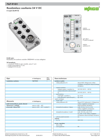 767-9101 2 420 Rozdzielacz zasilania 24 V DC 6 wyjść (6xM12) PWR DVI X 6 X 5 X 4 wyjścia zasilania (2) X 3 X 2 opis złącz (1 pole na złącze) X 1 24 V ULS UA X7 wejście zasilania (1) 767-9101 Krótki opis: Rozdzielacz do zasilania modułów SPEEDWAY na duże odległości W komplecie: • oznacznik WMB do opisu modułu, szary (1 szt.) • pasek oznacznikowy (1 szt.) • zaślepki M12 (2 szt.) Opis nr katalogowy szt./ opak. Dane techniczne rozdzielacz zasilania 767-9101 1 zasilanie modułu rodzaj połączenia (1) Akcesoria nr katalogowy paski oznacznikowe, pisak, element dystansowy i zaślepki przewody i złącza IP67 patrz str. 438 ... 439 patrz str. 422 ... 437 i rozdział 5 napięcie zasilania napięcie systemu i czujników ULS napięcie elementów wykonawczych UA prąd zasilania prąd logiki i czujników ILS prąd elementów wykonawczych IA wyjścia zasilające liczba wyjść rodzaj połączenia (2) obciążalność prądowa / złącze obciążalność prądowa / moduł ochrona przed zwarciem izolacja ULS - UA normy i aprobaty r UL 508 znak zgodności :$*2.RQWDNWWHFKQLN*PE+&R.* :$*2(/:$*VS]RR =DVWU]HJDVLĊSUDZRGR]PLDQWHFKQLF]Q\FK XO3LĊNQDD:URFáDZ złącze M23, 6-biegunowe; należy uwzględnić zmniejszenie dopuszczalnego obciążenia 24 V DC (-25 % ...+30 %) 24 V DC (-25 % ...+30 %) typ. 4 mA typ. 4 mA 6 złącze M12, kodowanie A, 4-biegunowe; należy uwzględnić zmniejszenie dopuszczalnego obciążenia maks. 8 A (ULS: 4 A, UA: 4 A); należy uwzględnić zmniejszenie dopuszczalnego obciążenia maks. 24 A (ULS maks. 8 A) (UA maks. 16 A); należy uwzględnić zmniejszenie dopuszczalnego obciążenia nie 500 V DC 1 WHO ZZZZDJRFRP 2 421 wyjścia zasilające X1 ... X6 2 3 5 1 4 1 2 5 4 3 M12 kodowanie A Schemat blokowy rozdzielacza zasilania 1: 24 V ULS 2: 24 V UA 3: 0 V ULS 4: 0 V UA 5: n.c. wejście zasilające X7 M23 1 ULS zasilanie wejście 5 1 6 4 2 3 M23 Dane techniczne wyjścia zasilające X1 ... X6 M12 1 ULS ULS 2 1: 24 V ULS 2: 0 V ULS 3: n.c. 4: 24 V UA 5: 0 V UA 6: n.c. 4 UA 3 2 UA UA 5 4 Dane techniczne 2 Dane ogólne wymiary (mm) S x H x G ciężar 50 x 43,3 x 117 276 g