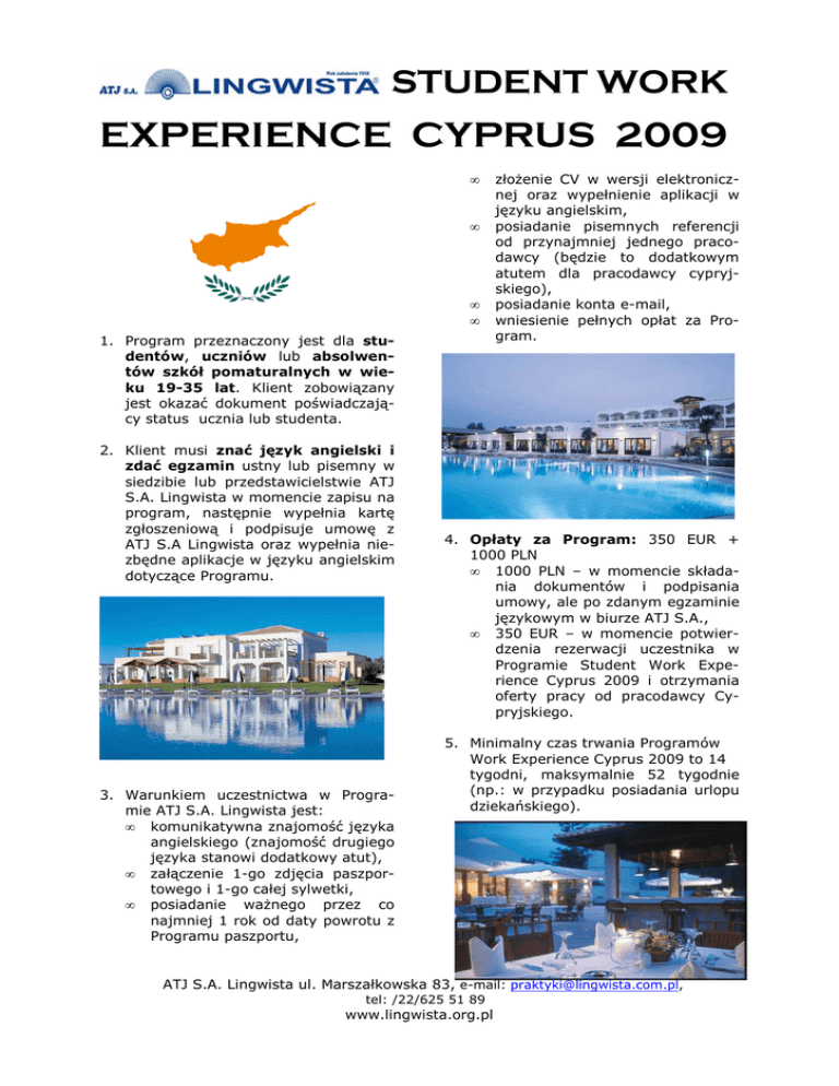 STUDENT WORK EXPERIENCE CYPRUS 2009 • • • • 1. Program przeznaczony jest dla studentów, uczniów lub absolwentów szkół pomaturalnych w wieku 19-35 lat. Klient zobowiązany jest okazać dokument poświadczający status ucznia lub studenta. 2. Klient musi znać język angielski i zdać egzamin ustny lub pisemny w siedzibie lub przedstawicielstwie ATJ S.A. Lingwista w momencie zapisu na program, następnie wypełnia kartę zgłoszeniową i podpisuje umowę z ATJ S.A Lingwista oraz wypełnia niezbędne aplikacje w języku angielskim dotyczące Programu. 3. Warunkiem uczestnictwa w Programie ATJ S.A. Lingwista jest: • komunikatywna znajomość języka angielskiego (znajomość drugiego języka stanowi dodatkowy atut), • załączenie 1-go zdjęcia paszportowego i 1-go całej sylwetki, • posiadanie waŜnego przez co najmniej 1 rok od daty powrotu z Programu paszportu, złoŜenie CV w wersji elektronicznej oraz wypełnienie aplikacji w języku angielskim, posiadanie pisemnych referencji od przynajmniej jednego pracodawcy (będzie to dodatkowym atutem dla pracodawcy cypryjskiego), posiadanie konta e-mail, wniesienie pełnych opłat za Program. 4. Opłaty za Program: 350 EUR + 1000 PLN • 1000 PLN – w momencie składania dokumentów i podpisania umowy, ale po zdanym egzaminie językowym w biurze ATJ S.A., • 350 EUR – w momencie potwierdzenia rezerwacji uczestnika w Programie Student Work Experience Cyprus 2009 i otrzymania oferty pracy od pracodawcy Cypryjskiego. 5. Minimalny czas trwania Programów Work Experience Cyprus 2009 to 14 tygodni, maksymalnie 52 tygodnie (np.: w przypadku posiadania urlopu dziekańskiego). ATJ S.A. Lingwista ul. Marszałkowska 83, e-mail: [email protected], tel: /22/625 51 89 www.lingwista.org.pl PROGRAM ZAPEWNIA: 1. Przygotowanie i dostarczenie kontraktu praktyk. 2. Udział w spotkaniach informacyjnych oraz pakiet materiałów informacyjnych (mapy, przewodnik, przydatne informacje praktyczne, zdjęcia, itp.). 3. Ubezpieczenie: NNW i KL na czas trwania Programu. Dodatkowo kaŜdy student otrzymuje Międzynarodową Kartę Studenta uprawniającą do korzystania z tysięcy zniŜek na całym świecie. 7. Program gwarantuje osiąganie zarobków co najmniej 300 – 550 CYP miesięcznie. Wynagrodzenie zaleŜy od stanowiska oraz polityki hotelu. 8. Program posiada odrębne szczegółowe warunki uczestnictwa w formie aneksu dołączanego do umowy z klientem. WARUNKI REZYGNACJI: 1. Zwracana jest całość wpłat w momencie rezygnacji, jednak max. 14 dni od podpisania umowy z biurem lub w przypadku odrzucenia aplikacji klienta przez pracodawcę cypryjskiego. 4. Bezpłatne zakwaterowanie oraz wyŜywienie zapewnia pracodawca cypryjski po wcześniejszym uzgodnieniu warunków z ATJ S.A. Lingwista. 5. ATJ S.A Lingwista w ramach opłat za dany Program pobiera bezzwrotny depozyt na poczet zakwaterowania i wyŜywienia. 2. Przepada bezzwrotny depozyt 600 PLN (do momentu potwierdzenia przez pracodawcę cypryjskiego, ale po terminie 14 dni od podpisania umowy z biurem ATJ S.A.). 6. Bilet lotniczy w obie strony na trasie Warszawa – Larnaca - Warszawa Ewentualne koszty transferu z lotniska do miejsca docelowego ponosi klient. 3. W przypadku rezygnacji po otrzymaniu kontraktu od pracodawcy zagranicznego jednak nie krócej niŜ 21 dni przed datą rozpoczęcia Programu przepada opłata rejestracyjna 1000 PLN. 4. W wypadku rezygnacji na krócej niŜ 48 godzin przed planowanym wylotem na Cypr opłata anulacyjna wynosi 1000 PLN i 350 EUR. ATJ S.A. Lingwista ul. Marszałkowska 83, e-mail: [email protected], tel: /22/625 51 89 www.lingwista.org.pl