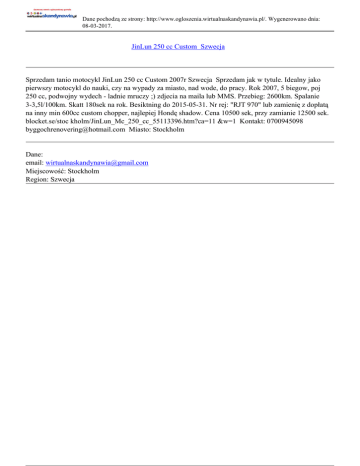 Dane pochodzą ze strony: http://www.ogloszenia.wirtualnaskandynawia.pl/. Wygenerowano dnia: 08-03-2017. JinLun 250 cc Custom Szwecja Sprzedam tanio motocykl JinLun 250 cc Custom 2007r Szwecja Sprzedam jak w tytule. Idealny jako pierwszy motocykl do nauki, czy na wypady za miasto, nad wode, do pracy. Rok 2007, 5 biegow, poj 250 cc, podwojny wydech - ladnie mruczy ;) zdjecia na maila lub MMS. Przebieg: 2600km. Spalanie 3-3,5l/100km. Skatt 180sek na rok. Besiktning do 2015-05-31. Nr rej: "RJT 970" lub zamienię z dopłatą na inny min 600cc custom chopper, najlepiej Hondę shadow. Cena 10500 sek, przy zamianie 12500 sek. blocket.se/stoc kholm/JinLun_Mc_250_cc_55113396.htm?ca=11 &w=1 Kontakt: 0700945098 [email protected] Miasto: Stockholm Dane: email: [email protected] Miejscowość: Stockholm Region: Szwecja
