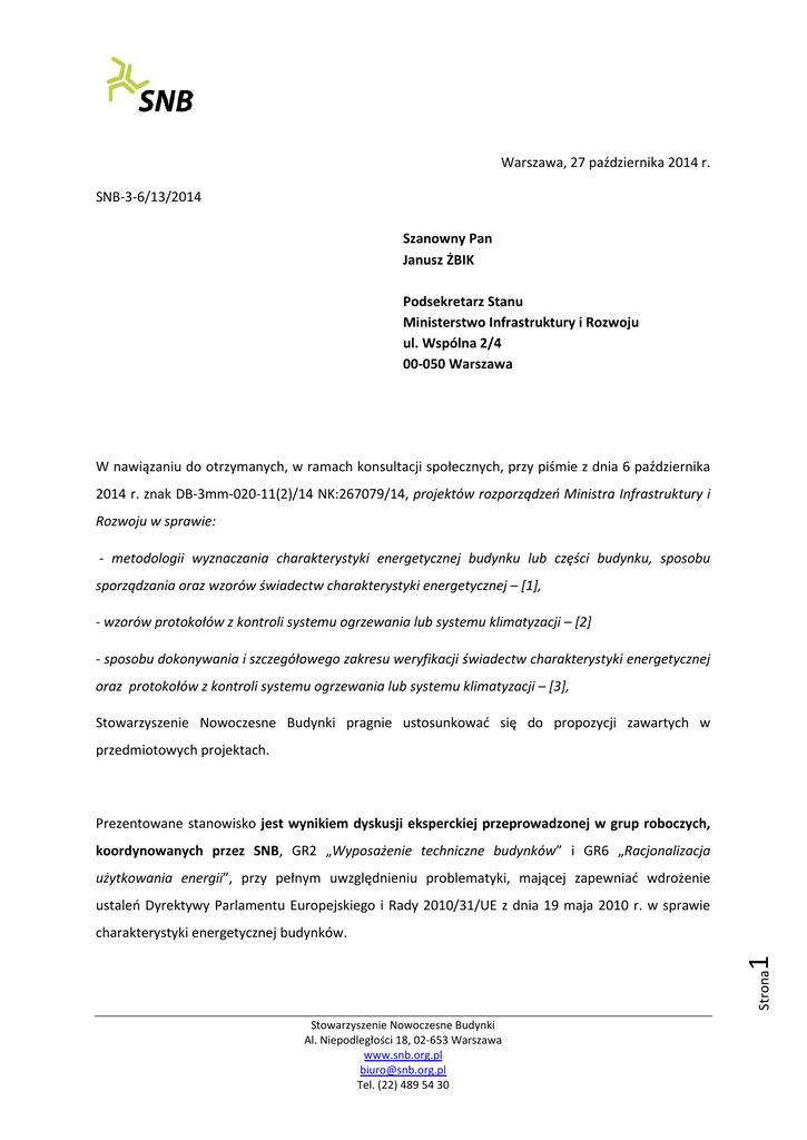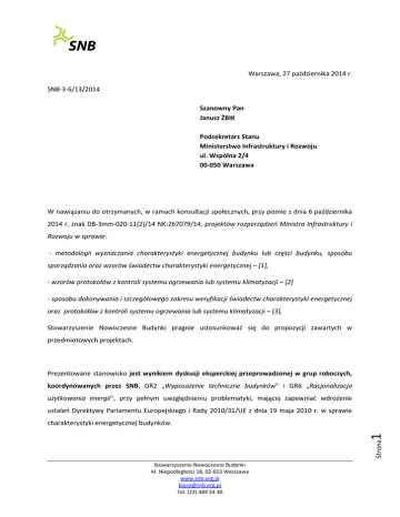 Warszawa, 27 października 2014 r. SNB-3-6/13/2014 Szanowny Pan Janusz ŻBIK Podsekretarz Stanu Ministerstwo Infrastruktury i Rozwoju ul. Wspólna 2/4 00-050 Warszawa W nawiązaniu do otrzymanych, w ramach konsultacji społecznych, przy piśmie z dnia 6 października 2014 r. znak DB-3mm-020-11(2)/14 NK:267079/14, projektów rozporządzeń Ministra Infrastruktury i Rozwoju w sprawie: - metodologii wyznaczania charakterystyki energetycznej budynku lub części budynku, sposobu sporządzania oraz wzorów świadectw charakterystyki energetycznej – [1], - wzorów protokołów z kontroli systemu ogrzewania lub systemu klimatyzacji – [2] - sposobu dokonywania i szczegółowego zakresu weryfikacji świadectw charakterystyki energetycznej oraz protokołów z kontroli systemu ogrzewania lub systemu klimatyzacji – [3], Stowarzyszenie Nowoczesne Budynki pragnie ustosunkować się do propozycji zawartych w przedmiotowych projektach. Prezentowane stanowisko jest wynikiem dyskusji eksperckiej przeprowadzonej w grup roboczych, koordynowanych przez SNB, GR2 „Wyposażenie techniczne budynków” i GR6 „Racjonalizacja użytkowania energii”, przy pełnym uwzględnieniu problematyki, mającej zapewniać wdrożenie ustaleń Dyrektywy Parlamentu Europejskiego i Rady 2010/31/UE z dnia 19 maja 2010 r. w sprawie Strona 1 charakterystyki energetycznej budynków. Stowarzyszenie Nowoczesne Budynki Al. Niepodległości 18, 02-653 Warszawa www.snb.org.pl [email protected] Tel. (22) 489 54 30 Zgłaszane w niniejszym piśmie propozycje eksperckie zmian lub uzupełnień regulacji, zawartych w projektach rozporządzeń, w przeważającej większości są wyrazem niejednolitego podejścia ekspertów do problemu, tam gdzie udało się wypracować wspólne stanowisko, zostało ono przedstawione. Uwaga ogólna Należy powrócić do sposobu jednoznacznego przywoływania Polskich Norm tj. co do pełnego tytułu, numeru i datowania. Ponadto proponuje się także, wzorem rozporządzenia w sprawie warunków technicznych dla budynków, rozważenie możliwości opracowania na potrzeby projektu kolejnego załącznika, w postaci Wykazu norm przywoływanych. Uzasadnienie: Propozycja doprecyzowania sposobu odwoływania się do Polskich Norm ma na celu wyeliminowanie problemów interpretacyjnych, związanych ze stosowaniem wymagań oraz umożliwienie pracy sędziom orzekającym. Taki sposób przywołania wykorzystano w rozporządzeniu w sprawie szczegółowego zakresu i formy projektu budowlanego, uznając je za prawnie dopuszczalny. Uwagi szczegółowe do projektu [1] - w odniesieniu do § 2 pkt 5 i 6 projektu rozporządzenia, w powiązaniu z wzorami (14) i (40) w Załączniku nr 1, proponuje się: Wariant 1 – utrzymanie propozycji zawartej w projekcie rozporządzenia, z jednoczesnym powrotem do definicji „złożonego systemu technicznego”, jak w wersji pierwotnej projektu rozporządzenia, zgodnie z definicją opracowaną przez Instytutu Techniki Budowlanej. Uzasadnienie: Strona Wariant 2 – zrezygnowanie z proponowanego podziału obliczeń, w oparciu o dwa wzory (14) i (40), i zastąpienie ich jednym, wspólnym wzorem, z jednoczesną rezygnacją ze zdefiniowania w słowniczku obu pojęć „prosty system techniczny” i „złożony system techniczny”. 2 Uznaje się za racjonale przyjęcie zróżnicowanego podejścia do obliczeń. Stowarzyszenie Nowoczesne Budynki Al. Niepodległości 18, 02-653 Warszawa www.snb.org.pl [email protected] Tel. (22) 489 54 30 Uzasadnienie: „Prosty system techniczny” jest szczególnym przypadkiem „złożonego system technicznego”. Propozycja rezygnacji z definicji słowniczkowych jest konsekwencją propozycji wprowadzenia jednego wspólnego wzoru, upraszczającego się w przypadku zastosowania prostego systemu, który w wystarczający sposób pozwala na opisanie złożonego charakteru systemu technicznego. - w odniesieniu do definicji „odnawialnej energii pierwotnej”, o której mowa w § 2 pkt 8 projektu rozporządzenia proponuje się: zmianę definicji pojęcia „odnawialna energia pierwotna”, tak by była ona zgodna z ustaleniami dyrektywy 2010/31/UE. Uzasadnienie: Przyjęta w projekcie rozporządzenia definicja pojęcia „odnawialna energia pierwotna” jest niezgodna z dyrektywą. - w odniesieniu do pkt 6 ust.2 w § 3 projektu rozporządzenia proponuje się: dodanie wymogu odnośnie do pomiaru zużycia gazu za pomocą odrębnego gazomierza. Wówczas brzmienie pkt 6 byłoby następujące: „gaz ziemny jest zużywany wyłącznie na potrzeby ogrzewania lub przygotowania ciepłej wody użytkowej, a jego zużycie mierzone odrębnym gazomierzem.” Uzasadnienie: Propozycje zapisów dotyczących metodologii odnoszą się do oceny zastosowanych systemów technicznych w budynkach. Należy mieć na względzie przypadek, iż gaz ziemny może być używany także w kuchenkach. W świetle powyższego zasadnym będzie przyjęcie doprecyzowania warunku, wskazującego, iż zużycie gazu, na cele ogrzewania i przygotowania ciepłej wody użytkowej, powinno być mierzone odrębnym gazomierzem. - w odniesieniu do pkt 1.1. Załącznika nr 1 proponuje się: 1) Wariant 1 – utrzymanie propozycji zawartej w projekcie rozporządzenia. Stowarzyszenie Nowoczesne Budynki Al. Niepodległości 18, 02-653 Warszawa www.snb.org.pl [email protected] Tel. (22) 489 54 30 Strona Uznaje się za racjonale przyjęcie, dla potrzeb oceny charakterystyki energetycznej, podziału budynku na strefy z uwagi na różnicę temperatur 4K. 3 Uzasadnienie: Wariant 2 – przyjęcie innego podziału, jak w normie PN-EN 13790:2009 pkt 6.3.2. Kryteria podziału na strefy. Uzasadnienie: Zgodnie z normą PN – EN 13790 : 2009 (6.3.2. – Kryteria podziału na strefy), należy jeszcze uwzględnić inny podział budynku na strefy, ze względu różne systemy ogrzewania, chłodzenie i wentylacji. Dodatkowo, ze względu na rozporządzenie w sprawie warunków technicznych jakim powinny odpowiadać budynki i ich usytuowanie