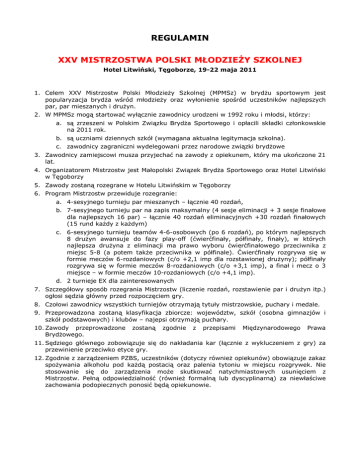 REGULAMIN XXV MISTRZOSTWA POLSKI MŁODZIEŻY SZKOLNEJ Hotel Litwiński, Tęgoborze, 19-22 maja 2011 1. Celem XXV Mistrzostw Polski Młodzieży Szkolnej (MPMSz) w brydżu sportowym jest popularyzacja brydża wśród młodzieży oraz wyłonienie spośród uczestników najlepszych par, par mieszanych i drużyn. 2. W MPMSz mogą startować wyłącznie zawodnicy urodzeni w 1992 roku i młodsi, którzy: a. są zrzeszeni w Polskim Związku Brydża Sportowego i opłacili składki członkowskie na 2011 rok. b. są uczniami dziennych szkół (wymagana aktualna legitymacja szkolna). c. zawodnicy zagraniczni wydelegowani przez narodowe związki brydżowe 3. Zawodnicy zamiejscowi musza przyjechać na zawody z opiekunem, który ma ukończone 21 lat. 4. Organizatorem Mistrzostw jest Małopolski Związek Brydża Sportowego oraz Hotel Litwiński w Tęgoborzy 5. Zawody zostaną rozegrane w Hotelu Litwińskim w Tęgoborzy 6. Program Mistrzostw przewiduje rozegranie: a. 4-sesyjnego turnieju par mieszanych – łącznie 40 rozdań, b. 7-sesyjnego turnieju par na zapis maksymalny (4 sesje eliminacji + 3 sesje finałowe dla najlepszych 16 par) – łącznie 40 rozdań eliminacyjnych +30 rozdań finałowych (15 rund każdy z każdym) c. 6-sesyjnego turnieju teamów 4-6-osobowych (po 6 rozdań), po którym najlepszych 8 drużyn awansuje do fazy play-off (ćwierćfinały, półfinały, finały), w których najlepsza drużyna z eliminacji ma prawo wyboru ćwierćfinałowego przeciwnika z miejsc 5-8 (a potem także przeciwnika w półfinale). Ćwierćfinały rozgrywa się w formie meczów 6-rozdaniowych (c/o +2,1 imp dla rozstawionej drużyny); półfinały rozgrywa się w formie meczów 8-rozdaniowych (c/o +3,1 imp), a finał i mecz o 3 miejsce – w formie meczów 10-rozdaniowych (c/o +4,1 imp). d. 2 turnieje EX dla zainteresowanych 7. Szczegółowy sposób rozegrania Mistrzostw (liczenie rozdań, rozstawienie par i drużyn itp.) ogłosi sędzia główny przed rozpoczęciem gry. 8. Czołowi zawodnicy wszystkich turniejów otrzymają tytuły mistrzowskie, puchary i medale. 9. Przeprowadzona zostaną klasyfikacja zbiorcze: województw, szkół (osobna gimnazjów i szkół podstawowych) i klubów – najepsi otrzymają puchary. 10. Zawody przeprowadzone Brydżowego. zostaną zgodnie z przepisami Międzynarodowego Prawa 11. Sędziego głównego zobowiązuje się do nakładania kar (łącznie z wykluczeniem z gry) za przewinienie przeciwko etyce gry. 12. Zgodnie z zarządzeniem PZBS, uczestników (dotyczy również opiekunów) obowiązuje zakaz spożywania alkoholu pod każdą postacią oraz palenia tytoniu w miejscu rozgrywek. Nie stosowanie się do zarządzenia może skutkować natychmiastowych usunięciem z Mistrzostw. Pełną odpowiedzialność (również formalną lub dyscyplinarną) za niewłaściwe zachowania podopiecznych ponosić będą opiekunowie.