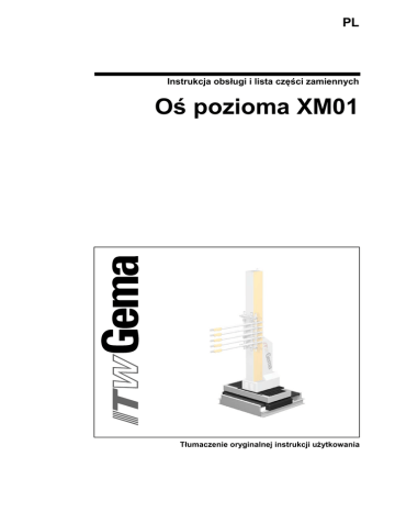 PL Instrukcja obsługi i lista części zamiennych Oś pozioma XM01 Tłumaczenie oryginalnej instrukcji użytkowania V 10/08 Dokumentacja Oś pozioma XM01 © Prawa autorskie 2006 ITW Gema GmbH Wszystkie prawa zastrzeżone. Publikacja chroniona prawem autorskim. Kopiowanie bez autoryzacji jest niedozwolone. Żadna z części tej publikacji nie może być reprodukowana, kopiowana, tłumaczona lub transmitowana w jakiejkolwiek formie, ani w całości ani częściowo bez pisemnej zgody firmy ITW Gema GmbH. OptiFlex, OptiTronic, OptiGun, EasyTronic, EasySelect, EasyFlow i SuperCorona są zarejestrowanymi znakami towarowymi firmy ITW Gema GmbH. OptiStar, OptiMatic, OptiMove, OptiMaster, OptiPlus, MultiTronic i Gematic są znakami towarowymi firmy ITW Gema GmbH. Wszystkie inne nazwy produktów są znakami towarowymi lub zarejestrowanymi znakami towarowymi ich poszczególnych właścicieli. W tej instrukcji jest zrobione odniesienie do różnych znaków towarowych i zarejestrowanych znaków towarowych. Takie odniesienia nie oznaczają, że producenci, o których mowa aprobują lub są w jakikolwiek sposób związani przez tę instrukcję. Usiłujemy zachować zapis ortograficzny znaków towarowych i zarejestrowanych znaków towarowych właścicieli praw autorskich. Cała nasza wiedza i informacje zawarte w tej publikacji były aktualizowane i ważne w dniu oddania do druku. Firma ITW Gema GmbH nie ponosi odpowiedzialności gwarancyjnej odnośnie interpretacji zawartości tej publikacji, rezerwuje sobie prawo do rewizji publikacji oraz do robienia zmian jej zawartości bez wcześniejszego zawiadomienia. Wydrukowano w Szwajcarii ITW Gema GmbH Mövenstrasse 17 9015 St. Gallen Szwajcaria Tel: +41-71-313 83 00 Fax: +41-71-313 83 83 E-Mail: [email protected] Strona internetowa: www.itwgema.ch V 10/08 Spis treści Ogólne zasady bezpieczeństwa 3 Symbole bezpieczeństwa (piktogramy) ..................................................................3 Szczególne środki bezpieczeństwa ........................................................................3 Bezpieczeństwo personelu ........................................................................4 Pojęcie bezpieczeństwa.............................................................................4 Zgodność użycia ........................................................................................4 O tej instrukcji 5 Informacje ogólne ...................................................................................................5 Opis funkcji 7 Zakres stosowania ..................................................................................................7 Oś pozioma XM01 ..................................................................................................7 Charakterystyka modelu ............................................................................7 Parametry techniczne 9 Oś pozioma XM01 ..................................................................................................9 Informacje techniczne ................................................................................9 Podłączenia elektryczne ............................................................................9 Wymiary ...................................................................................................10 Lista części zamiennych 11 Zamawianie części zamiennych ...........................................................................11 Oś pozioma XM01 - lista części zamiennych .......................................................12 Oś pozioma XM01 - części zamienne ..................................................................13 Oś pozioma XM01 - lista części zamiennych (kontynuacja).................................14 Oś pozioma XM01 - części zamienne (kontynuacja)............................................15 Oś pozioma XM01 Spis treści • 1 V 10/08 Ogólne zasady bezpieczeństwa Ten rozdział zawiera wszystkie podstawowe zasady bezpieczeństwa, które muszą być przestrzegane przez personel obsługujący Oś pozioma XM01. Należy dokładnie zapoznać się z rozdziałem "Zasady bezpieczeństwa" przed uruchomieniem Osi poziomej XM01. Symbole bezpieczeństwa (piktogramy) Wszystkie warunki oraz ich znaczenie można odnaleźć w poszczególnych instrukcjach obsługi urządzeń firmy ITW Gema. Należy także stosować się do zasad bezpieczeństwa zawartych w poszczególnych instrukcjach obsługi. NIEBEZPIECZEŃSTWO! Zagrożenie porażenia prądem lub uderzenia ruchomymi częściami. Możliwe konsekwencje: Śmierć lub poważne obrażenia. UWAGA! Nieprawidłowe działanie może prowadzić do uszkodzenia lub nieprawidłowego działania urządzenia. Możliwe konsekwencje: Lekkie obrażenia lub uszkodzenie sprzętu. INFORMACJA! Pomocnicze wskazówki i informacje. Szczególne środki bezpieczeństwa Oś pozioma XM01 - Prace instalacyjne wykonywane przez klienta, muszą być wykonane zgodnie z lokalnymi przepisami - Przed uruchomieniem malarni należy sprawdzić, czy żadne obce przedmioty nie znajdują się w kabinie proszkowej lub rurach odzysku (powietrze wejścia i wyjścia) - Należy zwrócić uwagę, czy uziemienie podzespołów zostało wykonane zgodnie z lokalnymi przepisami Ogólne zasady bezpieczeństwa • 3 V 10/08 Bezpieczeństwo personelu - Oś pozioma XM01 może być włączana i obsługiwana tylko po dokładnym przeczytaniu tej instrukcji. Nieprawidłowa obsługa osi poziomej może prowadzić do obrażeń lub uszkodzenia urządzenia. - Wszystkie ruchome osie powinny być zabezpieczone barierką przed uruchomieniem i podczas pracy (patrz lokalne przepisy bezpieczeństwa) - Przed uruchomieniem należy sprawdzić uziemienie osi! - Podzespoły zabezpieczające nie mogą być demontowane, pomijane lub ignorowane. Usunięcie osłon niesie niebezpieczeństwo obrażeń. - Podzespoły zabezpieczające muszą być utrzymywane w dobrym stanie technicznym i nie mogą być wyłączane z obiegu.