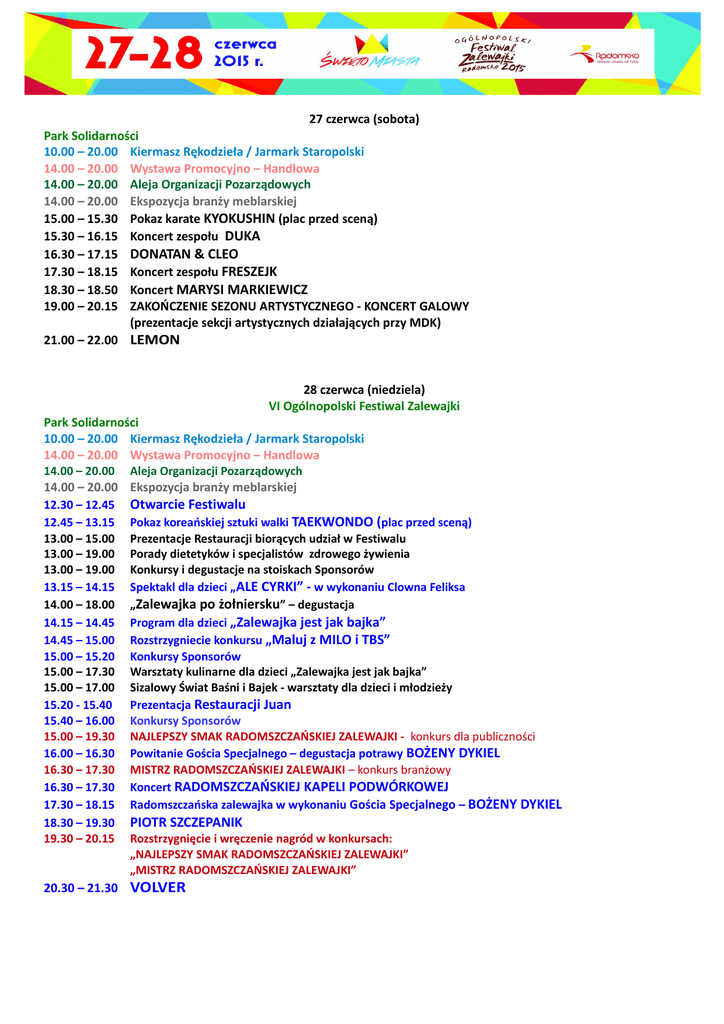 27 czerwca (sobota) Park Solidarności 10.00 – 20.00 Kiermasz Rękodzieła / Jarmark Staropolski 14.00 – 20.00 Wystawa Promocyjno – Handlowa 14.00 – 20.00 Aleja Organizacji Pozarządowych 14.00 – 20.00 Ekspozycja branży meblarskiej 15.00 – 15.30 Pokaz karate KYOKUSHIN (plac przed sceną) 15.30 – 16.15 Koncert zespołu DUKA 16.30 – 17.15 DONATAN & CLEO 17.30 – 18.15 Koncert zespołu FRESZEJK 18.30 – 18.50 Koncert MARYSI MARKIEWICZ 19.00 – 20.15 ZAKOŃCZENIE SEZONU ARTYSTYCZNEGO - KONCERT GALOWY (prezentacje sekcji artystycznych działających przy MDK) 21.00 – 22.00 LEMON 28 czerwca (niedziela) VI Ogólnopolski Festiwal Zalewajki Park Solidarności 10.00 – 20.00 Kiermasz Rękodzieła / Jarmark Staropolski 14.00 – 20.00 Wystawa Promocyjno – Handlowa 14.00 – 20.00 Aleja Organizacji Pozarządowych 14.00 – 20.00 Ekspozycja branży meblarskiej 12.30 – 12.45 Otwarcie Festiwalu 12.45 – 13.15 Pokaz koreańskiej sztuki walki TAEKWONDO (plac przed sceną) 13.00 – 15.00 Prezentacje Restauracji biorących udział w Festiwalu 13.00 – 19.00 Porady dietetyków i specjalistów zdrowego żywienia 13.00 – 19.00 Konkursy i degustacje na stoiskach Sponsorów 13.15 – 14.15 Spektakl dla dzieci „ALE CYRKI” - w wykonaniu Clowna Feliksa 14.00 – 18.00 „Zalewajka po żołniersku” – degustacja 14.15 – 14.45 Program dla dzieci „Zalewajka jest jak bajka” 14.45 – 15.00 Rozstrzygniecie konkursu „Maluj z MILO i TBS” 15.00 – 15.20 Konkursy Sponsorów 15.00 – 17.30 Warsztaty kulinarne dla dzieci „Zalewajka jest jak bajka” 15.00 – 17.00 Sizalowy Świat Baśni i Bajek - warsztaty dla dzieci i młodzieży 15.20 - 15.40 Prezentacja Restauracji Juan 15.40 – 16.00 Konkursy Sponsorów 15.00 – 19.30 NAJLEPSZY SMAK RADOMSZCZAŃSKIEJ ZALEWAJKI - konkurs dla publiczności 16.00 – 16.30 Powitanie Gościa Specjalnego – degustacja potrawy BOŻENY DYKIEL 16.30 – 17.30 MISTRZ RADOMSZCZAŃSKIEJ ZALEWAJKI – konkurs branżowy 16.30 – 17.30 Koncert RADOMSZCZAŃSKIEJ KAPELI PODWÓRKOWEJ 17.30 – 18.15 Radomszczańska zalewajka w wykonaniu Gościa Specjalnego – BOŻENY DYKIEL 18.30 – 19.30 PIOTR SZCZEPANIK 19.30 – 20.15 Rozstrzygnięcie i wręczenie nagród w konkursach: „NAJLEPSZY SMAK RADOMSZCZAŃSKIEJ ZALEWAJKI” „MISTRZ RADOMSZCZAŃSKIEJ ZALEWAJKI” 20.30 – 21.30 VOLVER IMPREZY TOWARZYSZĄCE 27 czerwca (sobota) Miejski Dom Kultury w Radomsku 18.00 Koncert Inauguracyjny XI Międzynarodowego Festiwalu Chóralnego „Wschód – Zachód - Zbliżenia Radomsko 2015” - Towarzystwo Śpiewacze im. Stanisława Moniuszki 28 czerwca (niedziela) Miejski Ośrodek Sportu i Rekreacji 8.00 – 12.00 III Radomszczański Bieg Uliczny - Memoriał Mariana Szymańskiego (start i meta na parkingu Urzędu Miasta Radomska ) Miejski Dom Kultury w Radomsku 10.00 Pokaz numizmatyczny i sesja popularnonaukowa zorganizowana przez Polskie Towarzystwo Numizmatyczne Oddział im. Leszka Czarnego w Radomsku 27-28 czerwca (sobota, niedziela) Miejski Ośrodek Sportu i Rekreacji 9.00 – 18.00 Puchar Polski w układaniu Kostki Rubika (Hala Sportowa przy ZSG nr 4 w Radomsku) Park Solidarności przy ul. Armii Krajowej 14.00 – 19.00 Sportowe zawody strzeleckie w konkurencji karabin pneumatyczny – Okręgowy Klub Strzelectwa Sportowego „10 – ka”