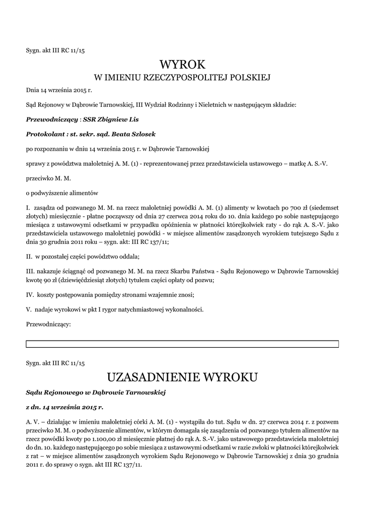 Sygn. akt III RC 11/15 WYROK W IMIENIU RZECZYPOSPOLITEJ POLSKIEJ Dnia 14 września 2015 r. Sąd Rejonowy w Dąbrowie Tarnowskiej, III Wydział Rodzinny i Nieletnich w następującym składzie: Przewodniczący : SSR Zbigniew Lis Protokolant : st. sekr. sąd. Beata Szlosek po rozpoznaniu w dniu 14 września 2015 r. w Dąbrowie Tarnowskiej sprawy z powództwa małoletniej A. M. (1) - reprezentowanej przez przedstawiciela ustawowego – matkę A. S.-V. przeciwko M. M. o podwyższenie alimentów I. zasądza od pozwanego M. M. na rzecz małoletniej powódki A. M. (1) alimenty w kwotach po 700 zł (siedemset złotych) miesięcznie - płatne począwszy od dnia 27 czerwca 2014 roku do 10. dnia każdego po sobie następującego miesiąca z ustawowymi odsetkami w przypadku opóźnienia w płatności którejkolwiek raty - do rąk A. S.-V. jako przedstawiciela ustawowego małoletniej powódki - w miejsce alimentów zasądzonych wyrokiem tutejszego Sądu z dnia 30 grudnia 2011 roku – sygn. akt: III RC 137/11; II. w pozostałej części powództwo oddala; III. nakazuje ściągnąć od pozwanego M. M. na rzecz Skarbu Państwa - Sądu Rejonowego w Dąbrowie Tarnowskiej kwotę 90 zł (dziewięćdziesiąt złotych) tytułem części opłaty od pozwu; IV. koszty postępowania pomiędzy stronami wzajemnie znosi; V. nadaje wyrokowi w pkt I rygor natychmiastowej wykonalności. Przewodniczący: Sygn. akt III RC 11/15 UZASADNIENIE WYROKU Sądu Rejonowego w Dąbrowie Tarnowskiej z dn. 14 września 2015 r. A. V. – działając w imieniu małoletniej córki A. M. (1) - wystąpiła do tut. Sądu w dn. 27 czerwca 2014 r. z pozwem przeciwko M. M. o podwyższenie alimentów, w którym domagała się zasądzenia od pozwanego tytułem alimentów na rzecz powódki kwoty po 1.100,00 zł miesięcznie płatnej do rąk A. S.-V. jako ustawowego przedstawiciela małoletniej do dn. 10. każdego następującego po sobie miesiąca z ustawowymi odsetkami w razie zwłoki w płatności którejkolwiek z rat – w miejsce alimentów zasądzonych wyrokiem Sądu Rejonowego w Dąbrowie Tarnowskiej z dnia 30 grudnia 2011 r. do sprawy o sygn. akt III RC 137/11. Domagała się także zasądzenia od pozwanego na rzecz powódki kosztów postępowania wg przepisanych norm. W uzasadnieniu podała, że powódka jest córką pozwanego ze związku z A. V.. Pozostaje ona na utrzymaniu rodziców, przy czym obowiązek alimentacyjny został określony wyrokiem Sądu Rejonowego w Dąbrowie Tarnowskiej z dn. 30 grudnia 2011 roku do sprawy o sygn. akt III RC 137/11. W punkcie I powołanego orzeczenia Sąd zobowiązał pozwanego do łożenia na rzecz małoletniej powódki alimentów w kwocie po 550,00 zł miesięcznie. Od czasu wyrzeczenia o alimentach minęły już ponad dwa lata, w czasie których potrzeby małoletniej powódki znacznie wzrosły i w pełni uzasadniają zasadność pozwu o podwyższenie dotychczasowych świadczeń. Małoletnia ma 13 lat, zamieszkuje razem z matką, jej mężem oraz przyrodnią siostrą na terenie Stanów Zjednoczonych Ameryki i tam też się kształci, uczęszczając obecnie do gimnazjum. Matka powódki ponosi koszty kształcenia córki związane z opłatą czesnego, reguluje też inne opłaty z tym związane w postaci opłat za strój sportowy, księgę rocznika, Komitet Rodzicielski. Wydatki te kształtują się na poziomie 227,25 USD. Dodatkowe koszty są związane z lekcjami religii, co kosztuje 290 USD. Ponosi także opłaty, wynikające z wyjazdów, wycieczek szkolnych i zajęć dodatkowych, które kształtują się na poziomie ok. 200 USD. Powódka wraz z rodziną zamieszkuje na nieruchomości obciążonej kredytem hipotecznym. Z tego tytułu ponoszone są koszty spłaty kredytu. Nadto ponoszone są też opłaty z tytułu mediów: rachunek za prąd i gaz jest regulowany w zależności od zużycia – za styczeń wynosił 104,09 USD, zaś za luty 63,24 USD, rachunek za gaz za styczeń wyniósł 114,84 USD, zaś za luty 137,94 USD. Opłaty za telefon kształtują się na poziomie załączonego do pozwu rachunku – za okres rozliczeniowy grudzień 2013 r. i styczeń 2014 r. opłata ta wynosiła 186,04 USD, zaś za kolejny – tj. styczeń/ luty 2014 r. – 199,53 USD. Opłata za Internet jest stała i wynosi 46,00 USD miesięcznie. Matka powódki opłaca również obowiązkowe ubezpieczenia domu i pojazdów mechanicznych – co w stosunku rocznym kosztuje odpowiednio 417,54 USD i 771,14 USD. Do kolejnych wydatków związanych z utrzymaniem dziecka należy zaliczyć wydatki za zakup środków czystości, odzież i kosmetyki. Z racji wieku i potrzeb indywidualnych powódki jest to kwota kształtująca się na poziomie 120 USD miesięcznie. Koszty zakupu żywności dla powódki to wydatek 50 USD tygodniowo, co matka powódki wyprowadza z ogólnych kosztów wyżywienia całej rodziny. Powódka jest ogólnie zdrowa, ale jak każde dziecko zapada na schorzenia dróg oddechowych. Poza leczeniem ortodontycznym nie wymaga innego specjalistycznego leczenia. Ponieważ polisa ubezpieczeniowa matki powódki nie obejmuje wszystkich kosztów leczenia – założenie aparatu ortodontycznego, jaki jest konieczny w przypadku powódki stanowi wydatek 5000 USD. Pozwany jest zatrudniony w charakterze kierowcy. Osiąga z tego tytułu wysokie wynagrodzenie. Wedle wiedzy matki powódki jest osobą zdrową. Poza powódką nie ma innych osób na utrzymaniu. Zamieszkuje wraz z rodzicami, którzy z racji własnych emerytur nie wymagają jego pomocy. Natomiast matka powódki obecnie nie pracuje ze względu na to, że w kwietniu urodziła kolejne dziecko. Przebywa na utrzymaniu mężu, który jako jedyny w rodzinie uzyskuje stałe dochody. Pozwany M. M. ostatecznie wnosił o oddalenie powództwa w całości. Sąd ustalił następujący stan faktyczny: Wyrokiem z dn. 30 grudnia 2011 r. – sygn. akt III RC 137/11 tut. Sąd zasądził od pozwanego M. M. na rzecz powódki A. M. (1) alimenty w wysokości po 550 zł miesięcznie z ustawowymi odsetk