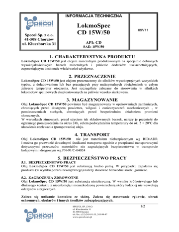 INFORMACJA TECHNICZNA Specol Sp. z o.o. 41-508 Chorzów ul. Kluczborska 31 LokmoSpec CD 15W/50 09V11 API: CD SAE: 15W/50 1. CHARAKTERYSTYKA PRODUKTU LokmoSpec CD 15W/50 jest olejem mineralnym produkowanym na specjalnie dobranych wysokojakościowych bazach mineralnych i pakiecie dodatków uszlachetniających, zapewniającym doskonałe właściwości uŜytkowe. 2. PRZEZNACZENIE LokmoSpec CD 15W/50 jest olejem przeznaczony do silników wysokopręŜnych wszystkich typów, z doładowaniem lub bez pracujących przy maksymalnych obciąŜeniach w całym zakresie temperatur otoczenia. Jest szczególnie zalecany do stosowania w silnikach lokomotyw spalinowych eksploatowanych na paliwie wysoko siarkowym. 3. MAGAZYNOWANIE Olej LokmoSpec CD 15W/50 powinien być magazynowany w opakowaniach zamkniętych, chroniących przed dostępem powietrza, wilgoci i zanieczyszczeń mechanicznych , w pomieszczeniach suchych, chroniących przed bezpośrednim działaniem promieni słonecznych. W warunkach zimowych, przed uŜyciem tak składowanych beczek, naleŜy je przenieść do ogrzanego pomieszczenia na okres 24h, celem podwyŜszenia temperatury do ok. 5 ÷ 20ºC dla ułatwienia rozlewania (pompowania) oleju. 4. TRANSPORT Olej LokmoSpec CD 15W/50 nie jest materiałem niebezpiecznym wg RID/ADR i moŜna go przewozić dowolnymi środkami transportu zgodnie z przepisami transportowymi dotyczącymi przewozów materiałów nie zagraŜających bezpieczeństwu w transporcie kolejowym i drogowym wg PN-91/C-04024 5. BEZPIECZEŃSTWO PRACY 5.1. BEZPIECZENSTWO PRACY Olej LokmoSpec CD 15W/50 jest substancją trudno palną. W przypadku zapalenia się produktu (w wyniku poŜaru zewnętrznego) naleŜy stosować bezwodne środki gaśnicze. 5.2. ZAGROśENIA ZDROWOTNE Olej LokmoSpec CD 15W/50 jest substancją nietoksyczną. W wyniku krótkotrwałego lub dłuŜszego kontaktu z nieosłoniętą i nieuszkodzoną powierzchnią skóry ludzkiej nie wywołują odczynów alergicznych. Zaleca się unikanie kontaktu ze skórą. Zaleca się stosowanie rękawic, ubrań ochronnych, okularów i innych środków zabezpieczających. SPECOL SP. Z O.O. ul. Kluczborska 31 41-508 Chorzów tel./fax.: (32) 245-91-33, 245-94-47 www.specol.com.pl 1/2 W przypadku oblania się produktem, miejsca zmoczone naleŜy zmyć obficie czystą wodą. 6. TYPOWE PARAMETRY FIZYKO-CHEMICZNE PARAMETRY SAE: 15W/40 wygląd zewnętrzny Klarowny, bez osadów lepkość kinematyczna w temperaturze 18,5 100 0C, mm2/s lepkość kinematyczna w temperaturze 149 40 0C, mm2/s wskaźnik lepkości 140 temperatura płynięcia, 0C -28 0 temperatura zapłonu, C 220 liczba zasadowa, mg KOH/g 11,0 zawartość wody, % nie zawiera zawartość ciał obcych, % nie zawiera Uwaga: PowyŜsze wartości parametrów fizyko-chemicznych są wartościami typowymi. Wartości rzeczywiste są umieszczane na orzeczeniach laboratoryjnych dołączonych do kaŜdej partii produktu. 7. NORMY I SPECYFIKACJE SAE: 15W/50, API: CD, 8.OPAKOWANIA Opakowania: 20L, 208L, 1000L. 9. WARUNKI GWARANCJI Wszystkie oleje smarowe produkowane przez firmę SPECOL Sp. z o.o. objęte są 3 letnim okresem gwarancyjnym. Warunkiem 3 letniego okresu gwarancyjnego jest przechowywanie zakupionego oleju w oryginalnie zamkniętych i nienaruszonych opakowaniach producenta oraz składowane w warunkach przez niego zalecanych. UŜytkowane oleje smarowe naleŜy poddawać okresowym badaniom laboratoryjnym w zakresie podstawowych normowanych parametrów uŜytkowych takich, jak: lepkość, liczba kwasowa, parametry charakteryzujące zdolność do przenoszenia obciąŜeń oraz zawartość zanieczyszczeń stałych. Oleje smarowe naleŜy wymieniać w instalacji smarującej zgodnie z instrukcją obsługi danego urządzenia mechanicznego lub w przypadku stwierdzenia znacznego odstępstwa parametrów uŜytkowych oleju od wartości normowanych (zanieczyszczenia spowodowane pracą urządzenia oraz proces starzenia się oleju). Nie jest zalecane mieszanie róŜnych olejów gdyŜ mieszanina moŜe nie odpowiadać wymaganiom stawianym przez system smarujący urządzenia mechanicznego, a w skrajnych przypadkach moŜe doprowadzić do uszkodzenia lub zniszczenia urządzenia. Gwarancją nie są objęte oleje zastosowane przez uŜytkownika do innych celów niŜ określone przez producenta. Za skutki uŜywania olejów smarowych do innych celów niŜ określone przez producenta pełną odpowiedzialność ponosi uŜytkownik. SPECOL SP. Z O.O. ul. Kluczborska 31 41-508 Chorzów tel./fax.: (32) 245-91-33, 245-94-47 www.specol.com.pl 2/2