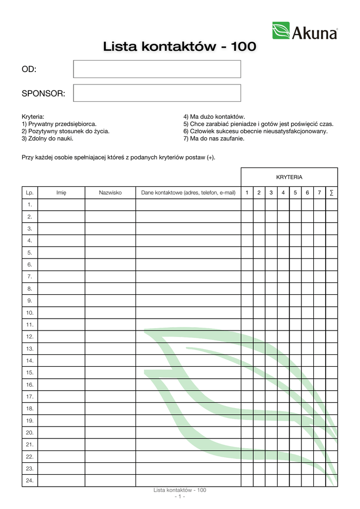 Lista kontaktów - 100 OD: SPONSOR: Kryteria: 1) Prywatny przedsiębiorca. 2) Pozytywny stosunek do życia. 3) Zdolny do nauki. 4) Ma dużo kontaktów. 5) Chce zarabiać pieniadze i gotów jest poświęcić czas. 6) Człowiek sukcesu obecnie nieusatysfakcjonowany. 7) Ma do nas zaufanie. Przy każdej osobie spełniajacej któreś z podanych kryteriów postaw (+). KRYTERIA Lp. Imię Nazwisko Dane kontaktowe (adres, telefon, e-mail) 1. 2. 3. 4. 5. 6. 7. 8. 9. 10. 11. 12. 13. 14. 15. 16. 17. 18. 19. 20. 21. 22. 23. 24. Lista kontaktów - 100 -1- 1 2 3 4 5 6 7 ∑ KRYTERIA Lp. Imię Nazwisko Dane kontaktowe (adres, telefon, e-mail) 25. 26. 27. 28. 29. 30. 31. 32. 33. 34. 35. 36. 37. 38. 39. 40. 41. 42. 43. 44. 45. 46. 47. 48. 49. 50. 51. 52. 53. 54. 55. 56. 57. 58. 59. 60. Lista kontaktów - 100 -2- 1 2 3 4 5 6 7 ∑ KRYTERIA Lp. Imię Nazwisko Dane kontaktowe (adres, telefon, e-mail) 61. 62. 63. 64. 65. 66. 67. 68. 69. 70. 71. 72. 73. 74. 75. 76. 77. 78. 79. 80. 81. 82. 83. 84. 85. 86. 87. 88. 89. 90. 91. 92. 93. 94. 95. 96. Lista kontaktów - 100 -3- 1 2 3 4 5 6 7 ∑ KRYTERIA Lp. Imię Nazwisko Dane kontaktowe (adres, telefon, e-mail) 97. 98. 99. 100. Lista kontaktów - 100 -4- 1 2 3 4 5 6 7 ∑