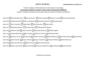 KARTA WYBORU (PRZEWODNICZĄCY I ZASTĘPCA SU) Na liście znajduje się 40 kandydatów do Samorządu Uczniowskiego. Zaznaczając krzyżykiem w okienku, możesz wybrać maksymalnie DZIESIĘCIU. Uwaga!!! Twój głos przestaje być ważny, gdy zaznaczysz więcej niż dziesięciu kandydatów. Klasa IVa: Dominika Barwicka Kamila Sitarek Klasa IVb: Aleksandra Bień Bartosz Opalewski Klasa IVc: Julia Tuszyńska Maja Radek Klasa Va: Jakub Skoczkowski Klasa Vb: Gabriela Jeżak Klasa Vc: Patrycja Bednarska Klasa Vd: Patrycja Traczyk Kacper Maj Klasa VIa: Jakub Sambor Kacper Telbuch Klasa VIb: Weronika Wieczorek Klasa VIc: Adrian Starczewski Amelia Lipińska Bartłomiej Wojtunik Julia Kostrzewa Krzysztof Kiech Szymon Sikorski Maria Uljasz Zuzanna Sobolewska Maciej Kawecki Oskar Pośnik Aleksandra Gutkiewicz Kuba Marcinkiewicz Wiktoria Traczyk Wiktoria Górecka Kacper Osiejewski Paulina Burska Julia Woźniak Bartosz Traczyk Natalia Łagoda Bartłomiej Sobień Natalia Wójtowicz Wojciech Błoński Weronika Jaworska Dawid Stolarczyk Weronika Nowicka Katarzyna Dylakiewicz Ankieta jest anonimowa Julia Bartosz Daniel Polesiak Paweł Sołtys