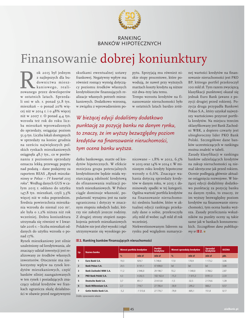 RANKING BANKÓW HIPOTECZNYCH Finansowanie dobrej koniunktury R ok 2015 był jednym z najlepszych dla bud ow n i c t w a m ie s z kaniowego, realizowanego przez deweloperów w ostatnich latach. Sprzedali oni w ub. r. ponad 51,8 tys. mieszkań – o ponad 20% więcej niż w 2014 r. i o 48% więcej niż w 2007 r. O ponad 4,4 tys. wzrosła też rok do roku liczba mieszkań wprowadzonych do sprzedaży, osiągając poziom 51,9 tys. Liczba lokali dostępnych w sprzedaży na koniec grudnia na sześciu największych polskich rynkach mieszkaniowych osiągnęła 48,7 tys., co w porównaniu z poziomem sprzedaży oznacza lekką przewagę popytu nad podażą – dane podajemy za raportem REAS „Rynek mieszkaniowy w Polsce – IV kwartał 2015 roku”. Według danych GUS w całym 2015 r. oddano do użytku 147,8 tys. mieszkań, czyli 3,3% więcej niż w roku poprzednim. Średnia powierzchnia mieszkania wzrosła do niemal 100 m 2, ale była o 1,2% niższa niż rok wcześniej. Dobra koniunktura utrzymała się również w I kwartale 2016 r. – liczba mieszkań oddanych do użytku wzrosła o ponad 17%. Rynek mieszkaniowy jest silnie uzależniony od kredytowania, ale znaczący udział inwestycji jest realizowany ze środków własnych inwestorów. Otoczenie ma niekorzystny wpływ na rynek kredytów mieszkaniowych, część banków silniej zaangażowanych w ten rynek i posiadających znaczący udział kredytów we frankach ogranicza skalę działalności w obawie przed negatywnymi skutkami ewentualnej ustawy frankowej. Negatywny wpływ ma również rosnący wymóg dotyczący poziomu środków własnych kredytobiorców finansujących realizacje własnych potrzeb mieszkaniowych. Dodatkowo wzrosną, w związku z wprowadzeniem po- pytu. Sprzyjają mu również niskie stopy procentowe, które powodują, że nawet przy wyższych marżach koszty kredytu są niższe niż dwa–trzy lata temu. Tempo wzrostu kredytów na finansowanie nieruchomości było w ostatnich latach bardzo zróż- W bieżącej edycji dodaliśmy dodatkowo punktację za pozycję banku na danym rynku, to znaczy, że im wyższy bezwzględny poziom kredytów na finansowanie nieruchomości, tym ocena banku wyższa. datku bankowego, marże od kredytów hipotecznych. W efekcie mniejsza grupa potencjalnych kredytobiorców będzie miała wystarczającą zdolność kredytową do sfinansowania realizacji potrzeb mieszkaniowych. W Polsce ciągle dominuje własność, popularność wynajmu jest na razie ograniczona i dotyczy w znacznym stopniu młodych ludzi, którzy nie założyli jeszcze rodziny. Z drugiej strony stopień zaspokojenia potrzeb mieszkaniowych Polaków nie jest zbyt wysoki i stąd utrzymywanie się wysokiego po- nicowane – 1,8% w 2012, 6,5% w 2013 oraz 14% w 2014 r. W minionym roku kredyty hipoteczne wzrosły o 6,6%. Znaczące wahania dotyczą sprzedaży kredytów w danym roku, w 2015 r. dominowały spadki w tej kategorii. Ogólna wartość portfela kredytów na finansowanie nieruchomości siedmiu banków, które w aktualnej edycji rankingu przekazały dane o sobie, przekroczyła 263 mld zł wobec 248 mld zł rok wcześniej. Niekwestionowanym liderem na rynku pod względem sumarycz- nej wartości kredytów na finansowanie nieruchomości jest PKO BP, którego portfel przekroczył 100 mld zł. Tym razem zwycięzcą klasyfikacji punktowej okazał się jednak Euro Bank (awans z pozycji drugiej przed rokiem). Pozycja druga przypadła Bankowi Pekao S.A., który uzyskał najwyższy wartościowo przyrost portfela kredytów. Na miejscu trzecim sklasyfikowany jest Bank Zachodni WBK, a dopiero czwarty jest ubiegłoroczny lider PKO Bank Polski. Szczegółowe dane banków uczestniczących w rankingu można znaleźć w tabeli. Zasady klasyfikacji w rankingu banków udzielających kredytów na zakup nieruchomości są niemal identyczne jak przed rokiem. Ocenie podlegają głównie aktualne osiągnięcia rozwojowe. W bieżącej edycji dodaliśmy dodatkowo punktację za pozycję banku na danym rynku, to znaczy, że im wyższy bezwzględny poziom kredytów na finansowanie nieruchomości, tym ocena banku wyższa. Zasady przeliczania wskaźników na punkty oceny są takie same jak w bankach konsumenckich. Szczegółowe dane publikujemy w 2. ▪ 2. Ranking banków finansujących nieruchomości Wzrost portfela kredytów Portfel kredytów Wzrost sprzedaży kredytów Sprzedaż kredytów OCENA % mln zł mln zł % mln zł mln zł pkt. 19,3 929,7 5 748,6 17,0 170,9 1 173,2 3,06 Bank Pekao S.A. 20,5 8 101,1 47 698,0 bd bd bd 3,00 3 Bank Zachodni WBK S.A. 11,2 2 946,0 29 198,7 55,2 1 340,0 3 768,2 2,87 4 PKO Bank Polski S.A. 4,3 4 202,5 102 162,4 -15,3 -1 615,3 8 951,3 2,33 5 Deutsche Bank S.A. 3,7 851,7 23 613,8 -1,5 -32,5 2 174,6 1,39 6 Bank Millennium S.A. 2,7 719,7 27 706,4 -30,9 -295,2 660,2 0,57 7 Getin Noble Bank S.A. -5,2 -1 513,6 27 770,7 -79,9 -605,1 151,8 0,17 Lp. Nazwa banku 1 Euro Bank S.A. 2 Źródło: opracowanie własne 45 aleBank.pl