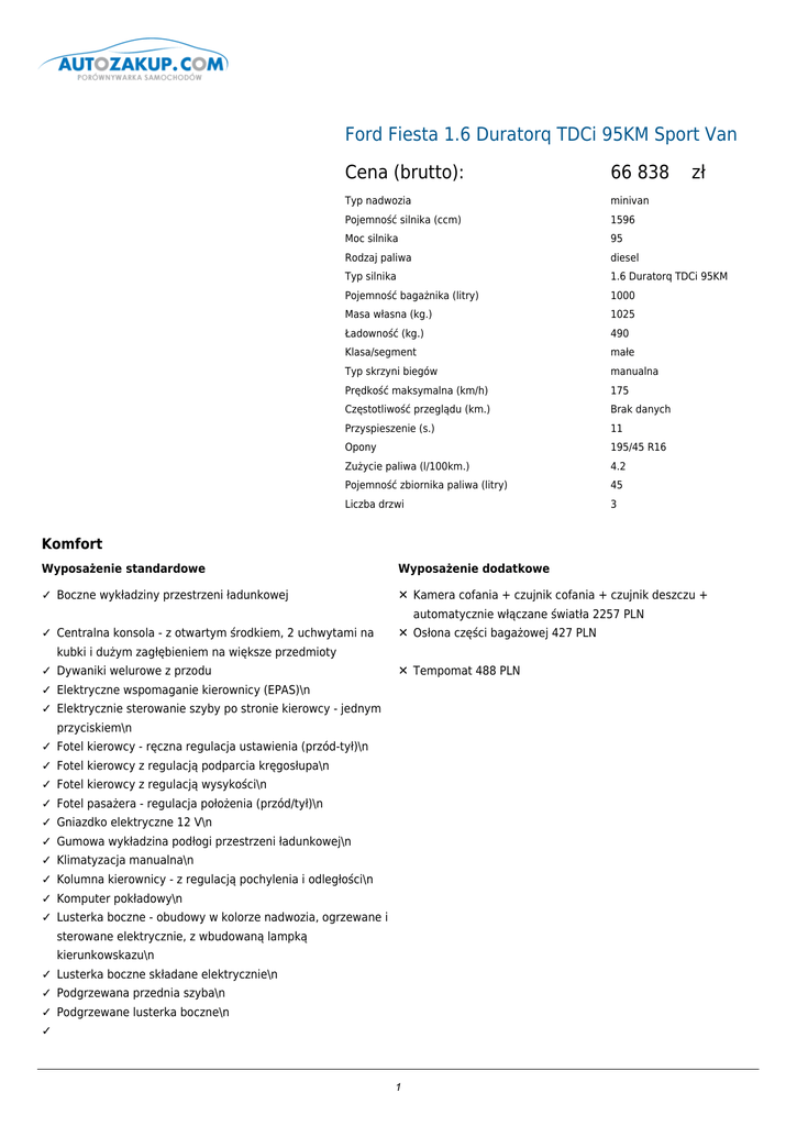 Ford Fiesta 1.6 Duratorq TDCi 95KM Sport Van Cena (brutto): 66 838 zł Typ nadwozia minivan Pojemność silnika (ccm) 1596 Moc silnika 95 Rodzaj paliwa diesel Typ silnika 1.6 Duratorq TDCi 95KM Pojemność bagażnika (litry) 1000 Masa własna (kg.) 1025 Ładowność (kg.) 490 Klasa/segment małe Typ skrzyni biegów manualna Prędkość maksymalna (km/h) 175 Częstotliwość przeglądu (km.) Brak danych Przyspieszenie (s.) 11 Opony 195/45 R16 Zużycie paliwa (l/100km.) 4.2 Pojemność zbiornika paliwa (litry) 45 Liczba drzwi 3 Komfort Wyposażenie standardowe Wyposażenie dodatkowe ✓ Boczne wykładziny przestrzeni ładunkowej ✕ Kamera cofania + czujnik cofania + czujnik deszczu + automatycznie włączane światła 2257 PLN ✓ Centralna konsola - z otwartym środkiem, 2 uchwytami na ✕ Osłona części bagażowej 427 PLN kubki i dużym zagłębieniem na większe przedmioty ✓ Dywaniki welurowe z przodu ✕ Tempomat 488 PLN ✓ Elektryczne wspomaganie kierownicy (EPAS)\n ✓ Elektrycznie sterowanie szyby po stronie kierowcy - jednym przyciskiem\n ✓ Fotel kierowcy - ręczna regulacja ustawienia (przód-tył)\n ✓ Fotel kierowcy z regulacją podparcia kręgosłupa\n ✓ Fotel kierowcy z regulacją wysykości\n ✓ Fotel pasażera - regulacja położenia (przód/tył)\n ✓ Gniazdko elektryczne 12 V\n ✓ Gumowa wykładzina podłogi przestrzeni ładunkowej\n ✓ Klimatyzacja manualna\n ✓ Kolumna kierownicy - z regulacją pochylenia i odległości\n ✓ Komputer pokładowy\n ✓ Lusterka boczne - obudowy w kolorze nadwozia, ogrzewane i sterowane elektrycznie, z wbudowaną lampką kierunkowskazu\n ✓ Lusterka boczne składane elektrycznie\n ✓ Podgrzewana przednia szyba\n ✓ Podgrzewane lusterka boczne\n ✓ 1 Reflektory - do jazdy dziennej\n 2 ✓ Reflektory - z opóźnionym wygaszaniem po opuszczeniu pojazdu\n ✓ Uchwyt dźwigni zmiany biegów - miękko wykończony, z akcentami w kolorze czarnym, czarny pierścień mieszka u podstawy dźwigni\n ✓ Wycieraczka przedniej szyby - ze zmienną prędkością, z przerywaczem pracy, przy włączaniu dodatkowe przejście piór dla zebrania spływających strużek wody\n ✓ Wycieraczka tylnej szyby - włączana także automatycznie wraz z wybraniem tylnego biegu\n ✓ Wycieraczki przedniej szyby - włączane automatycznie, z czujnikiem deszczu (wraz z automatycznym czujnikiem ✓ Zestaw świateł)\n głośnomówiący Bluetooth(R) z funkcja sterowania głosem, komputer pokładowy\n Bezpieczeństwo Wyposażenie standardowe Wyposażenie dodatkowe ✓ ABS ✕ Poduszka powietrzna pasażera 915 PLN ✓ ESP z TCS, EBA\n ✓ Poduszka powietrzna kierowcy\n ✓ Poduszki boczne z poduszką kolanową kierowcy (wymaga poduszki pasażera)\n ✓ Zagłówki przednie z regulacją wysokości\n Dodatki Wyposażenie standardowe Wyposażenie dodatkowe ✓ 4 zaczepy do mocowania ładunku (spełniające normę DIN) ✕ Alarm obwodowy z drugim składanym kluczykiem 610 PLN ✓ Drugi kluczyk z pilotem centralnego zamka ✕ Czujnik cofania 976 PLN ✓ Felgi aluminiowe 6.5 x 16" 5 - ramienne z oponami 195/45 ✕ Drugi kluczyk z pilotem centralnego zamka 134 PLN R16 ✓ Kierownica 3-ramienna, pokryta skórą ✕ Lakier metalizowany 1208 PLN ✓ Klamki zewnętrzne w kolorze nadwozia ✕ Pakiet dla palących 49 PLN ✓ Nagrzewnica z ręczną regulacją\n ✓ Oświetlenie wnętrza - lampka pod sufitem z przodu, wyłączanie oświetlania ze stopniowym wygaszaniem, lampka w przedziale ładunkowym\n ✓ Podgrzewana szyba tylna\n ✓ Przednie światła przeciwmgielne - czarne pierścienie oprawek\n ✓ Przegroda za kabiną kierowcy - o pełnej wysokości, blaszana u dołu, kratka u góry\n ✓ Przycisk zwalniający w uchwycie hamulca ręcznego chromowany\n 3 ✓ Radioodtwarzacz CD/ MP3, wyświetlacz wielopunktowy, 4 głośniki,zdalne sterowanie, gniazdo AUX - IN, zestaw głośnomówiący Bluetooth(R) z funkcja sterowania głosem, komputer pokładowy\n ✓ Reflektory - halogenowe, odbłyśnikowe, z oprawami w kolorze czarnym\n ✓ Reflektory - halogenowe, projekcyjne, z chromowanymi oprawami\n ✓ Sportowe fotele przednie\n ✓ Szyby boczne z tyłu - panele lakierowane w kolorze nadwozia w miejsce szyb\n ✓ Trzecie światło stop\n ✓ Tylny spojler - wersja "Sport" - w kolorze nadwozia\n ✓ Uchwyt tylnych drzwi nadwozia w kolorze nadwozia\n ✓ Wlew paliwa Ford Easy Fuel - bez tradycyjnego korka, z zabezpieczeniem przed zatankowaniem niewłaściwego ✓ Zderzaki paliwa\n - przedni i tylny w charakterystyce sportowej, w kolorze nadwozia, z przodu dodatkowo charakteryzowane sportowe obramowanie wlotu powietrza z tworzywa w kolorze popielatym\n ✓ Zestaw naprawczy do opon\n Doprecyzowanie oferty Kontakt: Nazwa użytkownika: admin Nazwa firmy: qqq Adres: qqq 12, 41-706 qqq1, NIP: 954 REGON: 1 Telefon: 123, 1 Fax: 1 Email: 1 www: 4