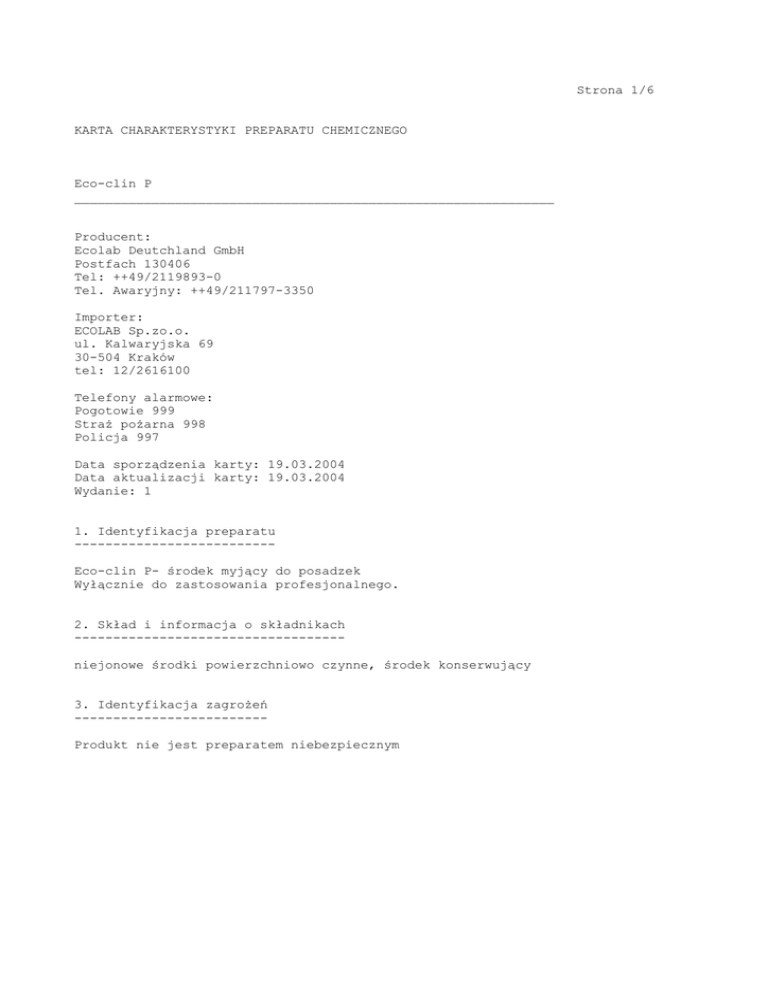 Strona 1/6 KARTA CHARAKTERYSTYKI PREPARATU CHEMICZNEGO Eco-clin P ______________________________________________________________ Producent: Ecolab Deutchland GmbH Postfach 130406 Tel: ++49/2119893-0 Tel. Awaryjny: ++49/211797-3350 Importer: ECOLAB Sp.zo.o. ul. Kalwaryjska 69 30-504 Kraków tel: 12/2616100 Telefony alarmowe: Pogotowie 999 Straż pożarna 998 Policja 997 Data sporządzenia karty: 19.03.2004 Data aktualizacji karty: 19.03.2004 Wydanie: 1 1. Identyfikacja preparatu -------------------------Eco-clin P- środek myjący do posadzek Wyłącznie do zastosowania profesjonalnego. 2. Skład i informacja o składnikach ----------------------------------niejonowe środki powierzchniowo czynne, środek konserwujący 3. Identyfikacja zagrożeń ------------------------Produkt nie jest preparatem niebezpiecznym strona 2/6 KARTA CHARAKTERYSTYKI PREPARATU CHEMICZNEGO Eco-clin P ______________________________________________________________ 4. Pierwsza pomoc ----------------W przypadku zatrucia przez wdychanie: Świeże powietrze, w razie potrzeby konsultacja lekarska W przypadku zabrudzenia skóry: Przemyć skórę pod bieżącą wodą. W przypadku zabrudzenia oczu: Przemyć natychmiast pod bieżącą wodą (min. 10 minut), nałożyć opatrunek ze sterylnej gazy, potrzeby skontaktować się z lekarzem okulistą. W przypadku spożycia: Pić wodę (1-2 szklanek), płukać usta, zasięgnąć porady lekarskiej. 5. Postępowanie w przypadku pożaru ---------------------------------Stosowne środki gaśnicze: wszystkie zwykle stosowane środki gaśnicze Środki gaśnicze niewłaściwe ze względów bezpieczeństwa: nie są znane Szczególne zagrożenia poprzez sam produkt, jego produkty spalania lub powstające gazy: Nie są znane Szczególne wyposażenie ochronne przy zwalczaniu ognia: Nie jest wymagane wyposażenie ochronne. 6. Postępowanie w przypadku niezamierzonego uwolnienia do środowiska -------------------------------------------------------------------Środki ostrożności w stosunku do osób: Nie dotyczy Zasady ochrony środowiska naturalnego: Nie dopuścić aby produkt przedostał się do kanalizacji. Sposób czyszczenia/zbierania: Usuwać mechanicznie, pozostałość spłukać dużą ilością wody. strona 3/6 KARTA CHARAKTERYSTYKI PREPARATU CHEMICZNEGO Eco-clin P ______________________________________________________________ 7. Postępowanie z preparatem i jego magazynowanie ------------------------------------------------Postępowanie z preparatem: brak specjalnych wymagań Magazynowanie: Przechowywać wyłącznie w oryginalnych opakowaniach 8. Kontrola narażenia i środki ochrony indywidualnej ---------------------------------------------------Informacje o budowie systemu: Brak dodatkowych wymagań, patrz pkt. 7 Składniki z odnoszącymi się do stanowiska pracy, dopuszczalnymi wskaźnikami stężeń, które należy kontrolować: nie dotyczy Środki ochrony indywidualnej: Ochrona układu oddechowego: nie jest wymagana Ochrona rąk: nie jest wymagana Ochrona oczu i twarzy: nie jest wymagana Ochrona skóry: nie jest wymagana 9. Właściwości fizykochemiczne -----------------------------postać: zapach: pH: temperatura: wrzenia: topnienia: zapłonu: samozapłonu: zestalania: wrażliwy na niskie temperatury: palność: właściwości wybuchowe: właściwości utleniające: prężność par: gęstość względna: rozpuszczalność: w wodzie: w rozpuszczalnikach org. (współczynnik podziału n-oktanol/woda): klarowny płyn perfumowany (przy 10g/l H2O demi.) (20'C) (koncentrat) (20'C) 7,5 brak danych brak danych >100’C DIN 51755 (Abel-Pensky) nie dotyczy brak danych brak danych nie dotyczy brak brak brak danych (20'C) 1,000 g/cm3 (20'C) rozpuszczalny w wodzie brak danych strona 4/6 KARTA CHARAKTERYSTYKI PREPARATU CHEMICZNEGO Eco-clin P ______________________________________________________________ 10. Stabilność i reaktywność ---------------------------Warunki, których należy unikać: Nie są znane przy stosowaniu zgodnym z przeznaczeniem Materiały, których należy unikać: Reakcja z kwasami: wydziela się ciepło Niebezpieczne produkty rozkładu: Nie są znane przy stosowaniu zgodnym z przeznaczeniem 11. Informacje toksykologiczne -----------------------------Produkt nie jest klasyfikowany jako niebezpieczny dla zdrowia 12. Informacje ekologiczne -------------------------Dane dotyczące: mobilności: brak danych rozkładu: spełnia polskie wymagania dotyczące stopnia biodegradacji kumulacji: brak danych ekotoksyczności: brak danych inne szkodliwe skutki: brak danych 13. Postępowanie z odpadami --------------------------Postępowanie z odpadami musi być uzgodnione z władzami lokalnymi. Postępować z odpadami zgodnie z obowiązującymi przepisami: -USTAWA z dnia 11 maja 2001 r. o opakowaniach i odpadach opakowaniowych wraz z późniejszymi zmianami -USTAWA z dnia 11 maja 2001 r. o obowiązkach przedsiębiorców w zakresie gospodarowania niektórymi odpadami oraz o opłacie produktowej i opłacie depozytowej wraz z późniejszymi zmianami 14. Informacje o transporcie ---------------------------Produkt nie jest materiałem niebezpiecznym według przepisów RID/ADR. strona 5/6 KARTA CHARAKTERYSTYKI PREPARATU CHEMICZNEGO Eco-clin P ______________________________________________________________ 15. Informacje dotyczące przepisów prawnych ------------------------------------------Znaki ostrzegawcze: Nie dotyczy Zwroty wskazujące rodzaj zagrożenia (zwroty R): Nie dotyczy Zwroty określające warunki bezpiecznego stosowania preparatu (zwroty S): Nie dotyczy Przepisy prawne uwzględnione w karcie charakterystyki: -Ustawa z dnia 11 stycznia 2001 roku o substancjach i preparatach chemicznych wraz z późniejszymi zmianami -Rozporządzenie Ministra Zdrowia z dnia 2 września 2003 r. w sprawie kryteriów i sposobu klasyfikacji substancji i preparatów chemicznych(Dz. U. Nr.171, poz.1666) -Rozporządzenie Ministra Zdrowia z dnia 2 września 2003 r. w sprawie wykazu substancji n