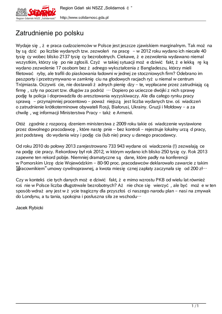 Region Gda ski NSZZ „Solidarno http://www.solidarnosc.gda.pl Zatrudnienie po polsku Wydaje si , e praca cudzoziemców w Polsce jest jeszcze zjawiskiem marginalnym. Tak mo na by s dzi po liczbie wydanych tzw. zezwole na prac ‒ w 2012 roku wydano ich niecałe 40 tysi cy wobec blisko 2137 tysi cy bezrobotnych. Ciekawe, e zezwolenia wydawano niemal wszystkim, którzy si po nie zgłosili. Czy w takiej sytuacji mo e dziwi fakt, e lekk r k wydano zezwolenie 17 osobom bez adnego wykształcenia z Bangladeszu, którzy mieli filetowa ryby, ale trafili do piaskowania ładowni w jednej ze stoczniowych firm? Odebrano im paszporty i przetrzymywano w zamkni ciu na głodowych racjach ry u niemal w centrum Trójmiasta. Oczywi cie, nie dostawali adnych pieni dzy ‒ te, wypłacane przez zatrudniaj c firm , szły na poczet tzw. długów za podró … Dopiero po ucieczce dwójki z nich spraw podj ła policja i doprowadziła do aresztowania wyzyskiwaczy. Ale dla całego rynku pracy spraw ‒ przynajmniej procentowo ‒ powa niejsz jest liczba wydanych tzw. o wiadcze o zatrudnienie krótkoterminowe obywateli Rosji, Białorusi, Ukrainy. Gruzji i Mołdowy ‒ a za chwil , wg informacji Ministerstwa Pracy ‒ tak e Armenii. Otó zgodnie z rozporz dzeniem ministerstwa z 2009 roku takie o wiadczenie wystawione przez dowolnego pracodawc , które nast pnie ‒ bez kontroli ‒ rejestruje lokalny urz d pracy, jest podstaw do wydania wizy i podj cia (lub nie) pracy u danego pracodawcy. Od roku 2010 do połowy 2013 zarejestrowano 733 943 wydane o wiadczenia (!) zezwalaj ce na podj cie pracy. Rekordowy był rok 2012, w którym wydano ich blisko 250 tysi cy. Rok 2013 zapewne ten rekord pobije. Niemniej dramatyczne s dane, które padły na konferencji w Pomorskim Urz dzie Wojewódzkim ‒ 80-90 proc. pracodawców deklarowało zawarcie z takim „pracownikiem umowy cywilnoprawnej, a kwota miesi cznej zapłaty zaczynała si od 200 zł… Czy w kontek cie tych danych mo e dziwi fakt, e mimo wzrostu PKB od wielu lat równie ro nie w Polsce liczba długotrwale bezrobotnych? A nie chce si wierzy , ale by mo e w ten sposób wdra any jest w ycie tragiczny dla przyszło ci naszego narodu plan ‒ nasi na zmywak do Londynu, a tu tania, spokojna i posłuszna siła ze wschodu… Jacek Rybicki 1/1 Powered by TCPDF (www.tcpdf.org)