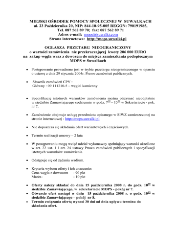 MIEJSKI OŚRODEK POMOCY SPOŁECZNEJ W SUWAŁKACH ul. 23 Października 20, NIP: 844-10-95-005 REGON: 790191985, Tel. 087 562 89 70; fax: 087 562 89 71 Adres e-mail: [email protected] Strona internetowa: http://mops.suwalki.pl OGŁASZA PRZETARG NIEOGRANICZONY o wartości zamówienia nie przekraczającej kwoty 206 000 EURO na zakup węgla wraz z dowozem do miejsca zamieszkania podopiecznym MOPS w Suwałkach Postępowanie prowadzone jest w trybie przetargu nieograniczonego w oparciu o ustawę z dnia 29 stycznia 2004r. Prawo zamówień publicznych. Słownik zamówień CPV : Główny : 09 111210-5 – węgiel kamienny Specyfikację istotnych warunków zamówienia można otrzymać nieodpłatnie w siedzibie Zamawiającego codziennie w godz. 730 – 1530 w Sekretariacie - pok. nr 7. Zamówienie obejmuje usługę przedmiotu opisanego w SIWZ zamieszczonej na stronie internetowej : http://mops.suwalki.pl Nie dopuszcza się składania ofert wariantowych i częściowych. Termin realizacji umowy – 2 lata W postępowaniu mogą wziąć udział wykonawcy spełniający warunki określone w art. 22 ust. 1 i art. 24 ustawy Prawo zamówień publicznych i specyfikacji istotnych warunków zamówienia. Odstępuje się od żądania wadium. Kryteria wyboru oferty i ich znaczenie: Cena węgla z dowozem - 90 pkt Marża- 10 pkt Oferty należy składać do dnia 15 października 2008 r. do godz. 1000 w siedzibie Zamawiającego, w sekretariacie MOPS - pokój nr 7. Otwarcie ofert nastąpi w dniu 15 października 2008 r. o godz. 1015 w siedzibie Zamawiającego – pokój nr 8. Termin związania ofertą wynosi 30 dni od dnia upływu terminu do składania ofert.