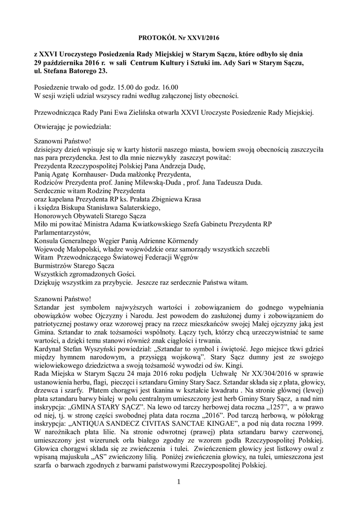 PROTOKÓŁ Nr XXVI/2016 z XXVI Uroczystego Posiedzenia Rady Miejskiej w Starym Sączu, które odbyło się dnia 29 października 2016 r. w sali Centrum Kultury i Sztuki im. Ady Sari w Starym Sączu, ul. Stefana Batorego 23. Posiedzenie trwało od godz. 15.00 do godz. 16.00 W sesji wzięli udział wszyscy radni według załączonej listy obecności. Przewodnicząca Rady Pani Ewa Zielińska otwarła XXVI Uroczyste Posiedzenie Rady Miejskiej. Otwierając je powiedziała: Szanowni Państwo! dzisiejszy dzień wpisuje się w karty historii naszego miasta, bowiem swoją obecnością zaszczyciła nas para prezydencka. Jest to dla mnie niezwykły zaszczyt powitać: Prezydenta Rzeczypospolitej Polskiej Pana Andrzeja Dudę, Panią Agatę Kornhauser- Duda małżonkę Prezydenta, Rodziców Prezydenta prof. Janinę Milewską-Duda , prof. Jana Tadeusza Duda. Serdecznie witam Rodzinę Prezydenta oraz kapelana Prezydenta RP ks. Prałata Zbigniewa Krasa i księdza Biskupa Stanisława Salaterskiego, Honorowych Obywateli Starego Sącza Miło mi powitać Ministra Adama Kwiatkowskiego Szefa Gabinetu Prezydenta RP Parlamentarzystów, Konsula Generalnego Węgier Panią Adrienne Körmendy Wojewodę Małopolski, władze wojewódzkie oraz samorządy wszystkich szczebli Witam Przewodniczącego Światowej Federacji Węgrów Burmistrzów Starego Sącza Wszystkich zgromadzonych Gości. Dziękuję wszystkim za przybycie. Jeszcze raz serdecznie Państwa witam. Szanowni Państwo! Sztandar jest symbolem najwyższych wartości i zobowiązaniem do godnego wypełniania obowiązków wobec Ojczyzny i Narodu. Jest powodem do zasłużonej dumy i zobowiązaniem do patriotycznej postawy oraz wzorowej pracy na rzecz mieszkańców swojej Małej ojczyzny jaką jest Gmina. Sztandar to znak tożsamości wspólnoty. Łączy tych, którzy chcą urzeczywistniać te same wartości, a dzięki temu stanowi również znak ciągłości i trwania. Kardynał Stefan Wyszyński powiedział: „Sztandar to symbol i świętość. Jego miejsce tkwi gdzieś między hymnem narodowym, a przysięgą wojskową”. Stary Sącz dumny jest ze swojego wielowiekowego dziedzictwa a swoją tożsamość wywodzi od św. Kingi. Rada Miejska w Starym Sączu 24 maja 2016 roku podjęła Uchwałę Nr XX/304/2016 w sprawie ustanowienia herbu, flagi, pieczęci i sztandaru Gminy Stary Sacz. Sztandar składa się z płata, głowicy, drzewca i szarfy. Płatem chorągwi jest tkanina w kształcie kwadratu . Na stronie głównej (lewej) płata sztandaru barwy białej w polu centralnym umieszczony jest herb Gminy Stary Sącz, a nad nim inskrypcja: „GMINA STARY SĄCZ”. Na lewo od tarczy herbowej data roczna „1257”, a w prawo od niej, tj. w stronę części swobodnej płata data roczna „2016”. Pod tarczą herbową, w półokrąg inskrypcja: „ANTIQUA SANDECZ CIVITAS SANCTAE KINGAE”, a pod nią data roczna 1999. W narożnikach płata lilie. Na stronie odwrotnej (prawej) płata sztandaru barwy czerwonej, umieszczony jest wizerunek orła białego zgodny ze wzorem godła Rzeczypospolitej Polskiej. Głowica chorągwi składa się ze zwieńczenia i tulei. Zwieńczeniem głowicy jest listkowy owal z wpisaną majuskuła „AS” zwieńczony lilią. Poniżej zwieńczenia głowicy, na tulei, umieszczona jest szarfa o barwach zgodnych z barwami państwowymi Rzeczypospolitej Polskiej. 1 Następnie Przewodnicząca Rady poprosiła Pana Prezydenta RP o symboliczne wbicie gwoździa przekazanie sztandaru Gminy Burmistrzowi Starego Sącza. i Pan Prezydent RP po wbiciu gwoździa przekazał Panu Burmistrzowi sztandar gminy mówiąc: „Szanowny Panie Burmistrzu. Jako włodarzowi miasta, na Pana ręce przekazuję ten sztandar. Niech służy Staremu Sączowi miastu i gminie. Niech bedzie symbolem wielkiej tradycji tego miasta i wielkich zasług tego miasta dla Rzeczypospolitej, i dla polskiej wielkiej tradycji chrześcijańskiej. Tak jak wniosła ją do naszej historii, naszej kultury Święta Kinga patronka tego miasta”. Burmistrz Starego Sącza Pan Jacek Lelek – podziekował i przyrzekł, że będziemy nosić ten sztandar z dumą i z honorem, wierni tradycji i wartościom. Następnie zaprezentował sztandar Gminy wszystkim zebranym i przekazał go chorążemu pocztu sztandarowego. Przewodnicząca Rady zwróciła się do wszystkich zebranych o powstanie i odśpiewanie pierwszej zwrotki hymnu państwowego. Po jej odśpiewaniu poprosiła Pana Prezydenta RP o zajęcie honorowego miejsca i powiedziała, cytuję: „Szanowny Panie Prezydencie, Wysoka Rado, Szanowni Goście! Mam zaszczyt ogłosić uroczyście, że Rada Miejska w Starym Sączu 26 września 2016 roku Uchwałą Nr XXIV/336/2016 nadała Prezydentowi Rzeczypospolitej Polskiej Panu Andrzejowi Dudzie tytuł Honorowego Obywatela Starego Sącza. O wygłoszenie laudacji w związku z uhonorowaniem tytułem Honorowego Obywatela Starego Sącza Pana Prezydenta RP Andrzeja Dudę proszę Pana Jacka Lelka Burmistrza Starego Sącza.” Burmistrz Starego Sącza Jacek Lelek – wygłosił laudację o następującej treści: „Panie Prezydencie! Pani Prezydentowo! Pani Przewodnicząca! Wysoka Rado! Szanowni Państwo, zacni nasi goście! Przeżywamy dzisiaj uroczystość niezwykłą, która zapisze się w historii naszego miasta. Tytuł Honorowego Obywatela Starego Sącza przyjmuje Pan dr Andrzej Duda - Prezydent Rzeczypospolitej Polskiej. Przypadł mi honor i wielki zaszczyt zaprezentowania przed pañstwem sylwetki naszego znakomitego Gościa. Pan Andrzej Duda, syn szanowanej profesorskiej rodziny, doktor prawa, polityk. Urodził się w Krakowie 16 maja 1972 roku. Po ukończeniu renomowanego II Liceum Ogólnokształcącego im. Jana III Sobieskiego, kontynuował naukę jako student Wydziału Prawa i Administracji Uniwersytetu Jagiellońskiego. W krakowskiej Alma Mater rozpoczął również pracę naukową, uzyskując tytuł doktora praw. Po studiach otworzył własną kancelarię prawną, ale wkrótce premier Jarosław Kaczyñski powo łał 