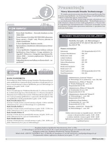 Prezentacja Nowy kierownik Działu Technicznego W związku z przejściem na emeryturę dotychczasowego Kierownika Działu Technicznego Spółdzielni - inż. Dionizego Lackiego, Zarząd Spółdzielni powołał na to stanowisko mgr inż. Tomasza Jurka. Nowy Kierownik Działu Technicznego posiada wykształcenie wyższe, jest absolwentem Politechniki Białostockiej – Wydział Budownictwa w trybie dziennym, ukończył również studia podyplomowe w Wyższej Szkole Gospodarowania Nieruchomościami w Warszawie na kierunku wycena nieruchomości. Posiada pełne uprawnienia budowlane w specjalności konstrukcyjno-budowlanej. Str. 3 Str. 4 Str. 5 Str.6 Str. 8 Str. 9 Nowe Rady Osiedlowe – Kierunki działania na lata 2006-2010 Temat Miesiąca:Certyfikat ISO 9001:2000 odnowiony Nasze sprawy: „Ciepłe” rady, Wszyscy płacimy za skutki wandalizmu Z Życia Spółdzielni: Budowa ruszyła... Sprawozdania z działalności Administracji za 3 kwartały 2006 r. Z życia Spółdzielni: Najpiękniejsze balkony wybrane Spółdzielczy Dom Kultury: Uwaga miłośnicy fotografii!!!, Malarstwo i fotografia reportażowa Rydzewo 2006 – wystawa poplenerowa, Wakacje w klubie „Sagitta” Najbardziej ukwiecone balkony na Konieczkach – nagrodzone! RADA NADZORCZA Przewodniczący Rady Nadzorczej mgr Stanisław Wszeborowski przyjmuje spółdzielców w sprawach skarg i wniosków w każdy pierwszy roboczy wtorek miesiąca w biurze Spółdzielni, przy ul. Słowackiego 2 w pokoju nr 9 w godz. 14.00 - 15.00. ZARZĄD Prezes Zarządu mgr inż. Waldemar Roszkowski, Z-ca Prezesa Zarządu ds. technicznych mgr Jerzy Henryk Korsak, Z-ca Prezesa Zarządu ds. Ekonomicznych Tadeusz Karwowski i Pełnomocnik Zarządu inż. Dionizy Lacki przyjmują spółdzielców w sprawach członkowskich w biurze Spółdzielni w każdy poniedziałek w godz. 12.00 - 14.30. Rada Osiedla Rejon Nr I dyżuruje w każdy ostatni czwartek miesiąca od godz. 13.00 w siedzibie Administracji Nr 1, przy ul. Słowackiego 2A (w podwórku) Rada Osiedla Północ I dyżuruje w każdy ostatni wtorek miesiąca w godz. 14.00 - 15.00 w siedzibie Administracji Nr 2, przy ul. Wojska Polskiego 66 Rada Osiedla Północ II dyżuruje w każdy pierwszy poniedziałek miesiąca od godz. 16.00 w siedzibie Administracji Nr 3, przy ul. Grodzieńskiej 10 Rada Osiedla Konieczki dyżuruje w każdy pierwszy czwartek miesiąca w godz. 17.00 - 18.00 w siedzibie Administracji Nr 4, przy ul. Dobrzańskiego 1 NUMERY TELEFONICZNE SM „ŚWIT” Siedziba Zarządu - ul. Słowackiego 2 centrala 621 67 87, 621 67 88, 621 67 89 fax 621 67 96 Numery wewnętrzne: Sekretariat Czynsze Mieszkaniowe Rozliczenie wody Lokale Użytkowe Dział Techniczny Sekcja Mieszkaniowa Windykacja Rozliczanie Kredytów Rozliczenie C.O. Dział Ciepłowniczy Dział Remontowy - 351 (bezpośredni 621 67 97) -304, 319 -310 -334 -349, 357 -347, 350 -334 -314 -329 -359 (bezpośredni 621 67 95) -322, 323 Administracja „Centrum” Rejon I ul. Słowackiego 2A (w podwórzu) - wew. 356, 360 Administracja „Północ I” Rejon II ul. Wojska Polskiego 66 - wew. 333 (bezpośredni 621 67 93) Administracja „Północ II” Rejon III ul. Grodzieńska 10 wew. 336 (bezpośredni 621 67 92) Administracja „Konieczki” Rejon IV ul. Dobrzańskiego 1 - wew. 308 (bezpośredni 621 67 90) Spółdzielczy Dom Kultury ul. Grodzieńska 10 - wew. 336 (bezpośredni 621 67 99) Świetlica „SAGITTA” - Konieczki ul. Dobrzańskiego 5 - wew. 307 Telefon interwencyjny na wypadek awarii - 621 67 89 - czynny w dni powszednie w godz. 15.00 - 22.00 w soboty, niedziele i święta w godz. 10.00 - 18.00 Zgłoszenia przyjmują także administracje osiedlowe w godzinach pracy. Bezpłatny biuletyn Spółdzielni Mieszkaniowej „Świt” w Ełku ul. Słowackiego 2, tel. 621 67 87, fax 621 67 96, e-mail: [email protected], www.smswit.elk.com.pl Kolegium redakcyjne: Waldemar Roszkowski, Dariusz Wasilewski. Skład i druk: „GRYFIX” KONDRAT Sp. J., 9-300 Ełk, ul. Sasankowa 17, tel. 087 620 03 09, e-mail:[email protected] Przyjmowanie reklam i ogłoszeń w drukarni (jw)w godz. 730 - 1500 ŚWIT nr 4 (30)