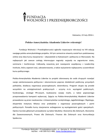 Katowice, 22 luty 2016 r. Polsko-Amerykańska Akademia Liderów rekrutuje! Fundacja Wolności i Przedsiębiorczości ogłosiła rozpoczęcie rekrutacji na VIII edycję swojego polsko-amerykańskiego projektu. W tym semestrze otwarty został kurs podstawowy online oraz dwa kursy stacjonarne – obywatelski w Katowicach i polityczny w Warszawie. Na najlepszych jak zawsze czekają interesujące nagrody: wyjazdy na zagraniczne staże, seminaria i konferencje. Całkowitą nowością jest nawiązanie współpracy z Leadership Institute, który zapewni staż, zakwaterowanie, a także wyżywienie najlepszemu uczestnikowi kursu politycznego. Polsko-Amerykańska Akademia Liderów to projekt skierowany do osób chcących rozwijać swoje zainteresowania polityczne i ekonomiczne poprzez działalność publiczną: przyszłych polityków, działaczy organizacji pozarządowych, dziennikarzy. Program skupia się przede wszystkim na umiejętnościach praktycznych – uczymy m.in. wystąpień publicznych, fundraisingu, strategii PR-owych, budowania swojej marki, a także poprawnego przeprowadzenia kampanii wyborczej. Zajęcia na Polsko-Amerykańskiej Akademii Liderów prowadzone są przez naukowców z Uniwersytetów Londyńskiego, Jagiellońskiego i Śląskiego, ekspertów Instytutu Misesa oraz praktyków z organizacji pozarządowych i partii politycznych. Ponadto kursy stacjonarne wzbogacone są wystąpieniami gości specjalnych. Oprócz kursów głównych prowadzone są także fakultety: Ekonomia dla Zielonych, Ekonomia dla Zaawansowanych, Prawo dla Zielonych, Finanse dla Zielonych oraz Komunikacja Społeczna. Fundacja Wolności i Przedsiębiorczości, ul. Asnyka 6, 40-696 Katowice tel/fax: +48 509 615 488, www.fundacjawip.org Polsko-Amerykańska Akademia Liderów kontynuuje także współpracę z Fundacją TDJ, która przeprowadzi dodatkowy projekt w ramach kursu obywatelskiego. Jego uczestnicy będą mieli za zadanie stworzyć swój własny program edukacyjny. Spośród wszystkich propozycji zostanie wybrana jedna, której Twórca otrzyma możliwość zrealizowania swojego projektu. Fundacja TDJ zapewnia budżet, materiały, dostęp do biura oraz wsparcie merytoryczne. Zapisy już trwają na stronie: www.akademialiderow.edu.pl Więcej informacji udziela: Jacek Spendel Dyrektor Polsko-Amerykańskiej Akademii Liderów Prezes Fundacji Wolności i Przedsiębiorczości, e-mail: [email protected] tel. + 48 509 615 488 Fundacja Wolności i Przedsiębiorczości jest organizacją, która stawia sobie za cel promocję rozwiązań wolnorynkowych, wolności osobistej, oraz ducha przedsiębiorczości. Założona w 2012 r. organizacja dąży do wykształcenia generacji ludzi niezależnych, wolnych, i odpowiedzialnych. Fundacja Wolności i Przedsiębiorczości kierowana jest przez osoby doświadczone w działalności publicznej, Jacka Spendla i Marcina Chmielowskiego. Flagowymi inicjatywami Fundacji są Polsko-Amerykańska Akademia Liderów oraz Akademia Młodych Przedsiębiorców. W listopadzie 2013 w Nowym Jorku Fundacja odniosła zwycięstwo w prestiżowym konkursie Think Tank Shark Tank, dzięki czemu realizuje projekt serialu telewizyjnego „Wolność pod Ostrzałem”. Fundacja Wolności i Przedsiębiorczości, ul. Asnyka 6, 40-696 Katowice tel/fax: +48 509 615 488, www.fundacjawip.org