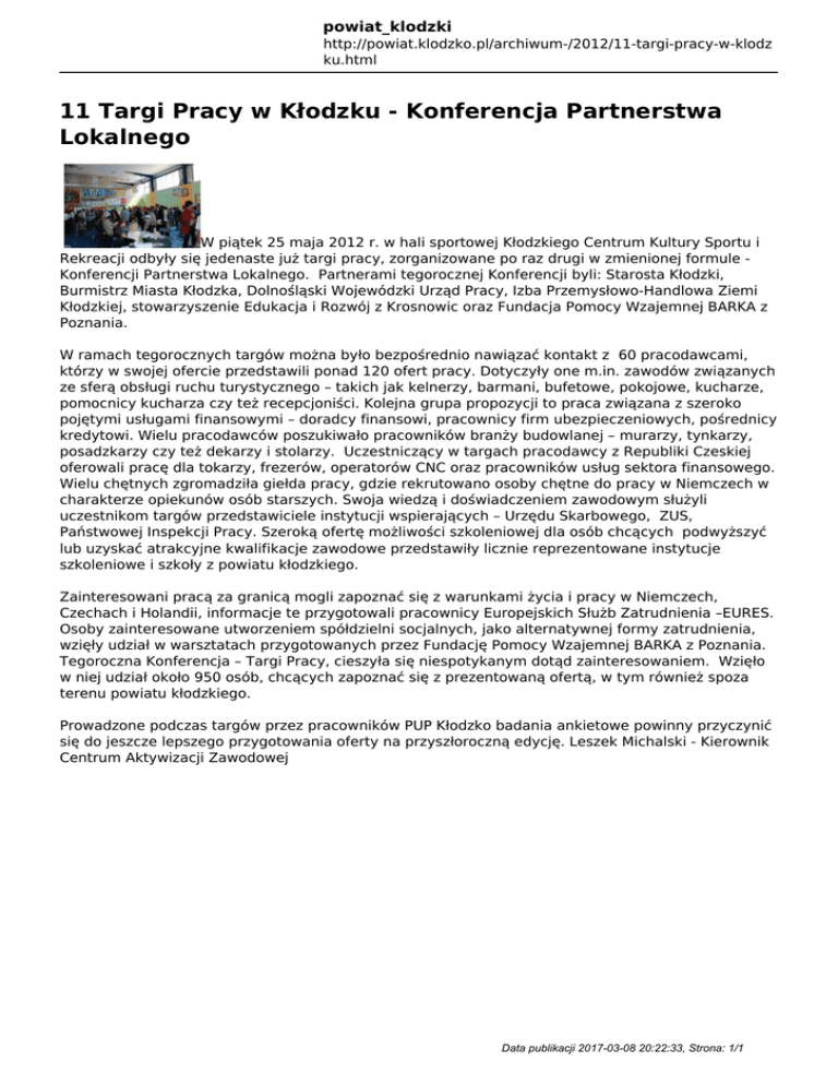 powiat_klodzki http://powiat.klodzko.pl/archiwum-/2012/11-targi-pracy-w-klodz ku.html 11 Targi Pracy w Kłodzku - Konferencja Partnerstwa Lokalnego W piątek 25 maja 2012 r. w hali sportowej Kłodzkiego Centrum Kultury Sportu i Rekreacji odbyły się jedenaste już targi pracy, zorganizowane po raz drugi w zmienionej formule Konferencji Partnerstwa Lokalnego. Partnerami tegorocznej Konferencji byli: Starosta Kłodzki, Burmistrz Miasta Kłodzka, Dolnośląski Wojewódzki Urząd Pracy, Izba Przemysłowo-Handlowa Ziemi Kłodzkiej, stowarzyszenie Edukacja i Rozwój z Krosnowic oraz Fundacja Pomocy Wzajemnej BARKA z Poznania. W ramach tegorocznych targów można było bezpośrednio nawiązać kontakt z 60 pracodawcami, którzy w swojej ofercie przedstawili ponad 120 ofert pracy. Dotyczyły one m.in. zawodów związanych ze sferą obsługi ruchu turystycznego – takich jak kelnerzy, barmani, bufetowe, pokojowe, kucharze, pomocnicy kucharza czy też recepcjoniści. Kolejna grupa propozycji to praca związana z szeroko pojętymi usługami finansowymi – doradcy finansowi, pracownicy firm ubezpieczeniowych, pośrednicy kredytowi. Wielu pracodawców poszukiwało pracowników branży budowlanej – murarzy, tynkarzy, posadzkarzy czy też dekarzy i stolarzy. Uczestniczący w targach pracodawcy z Republiki Czeskiej oferowali pracę dla tokarzy, frezerów, operatorów CNC oraz pracowników usług sektora finansowego. Wielu chętnych zgromadziła giełda pracy, gdzie rekrutowano osoby chętne do pracy w Niemczech w charakterze opiekunów osób starszych. Swoja wiedzą i doświadczeniem zawodowym służyli uczestnikom targów przedstawiciele instytucji wspierających – Urzędu Skarbowego, ZUS, Państwowej Inspekcji Pracy. Szeroką ofertę możliwości szkoleniowej dla osób chcących podwyższyć lub uzyskać atrakcyjne kwalifikacje zawodowe przedstawiły licznie reprezentowane instytucje szkoleniowe i szkoły z powiatu kłodzkiego. Zainteresowani pracą za granicą mogli zapoznać się z warunkami życia i pracy w Niemczech, Czechach i Holandii, informacje te przygotowali pracownicy Europejskich Służb Zatrudnienia –EURES. Osoby zainteresowane utworzeniem spółdzielni socjalnych, jako alternatywnej formy zatrudnienia, wzięły udział w warsztatach przygotowanych przez Fundację Pomocy Wzajemnej BARKA z Poznania. Tegoroczna Konferencja – Targi Pracy, cieszyła się niespotykanym dotąd zainteresowaniem. Wzięło w niej udział około 950 osób, chcących zapoznać się z prezentowaną ofertą, w tym również spoza terenu powiatu kłodzkiego. Prowadzone podczas targów przez pracowników PUP Kłodzko badania ankietowe powinny przyczynić się do jeszcze lepszego przygotowania oferty na przyszłoroczną edycję. Leszek Michalski - Kierownik Centrum Aktywizacji Zawodowej Data publikacji 2017-03-08 20:22:33, Strona: 1/1