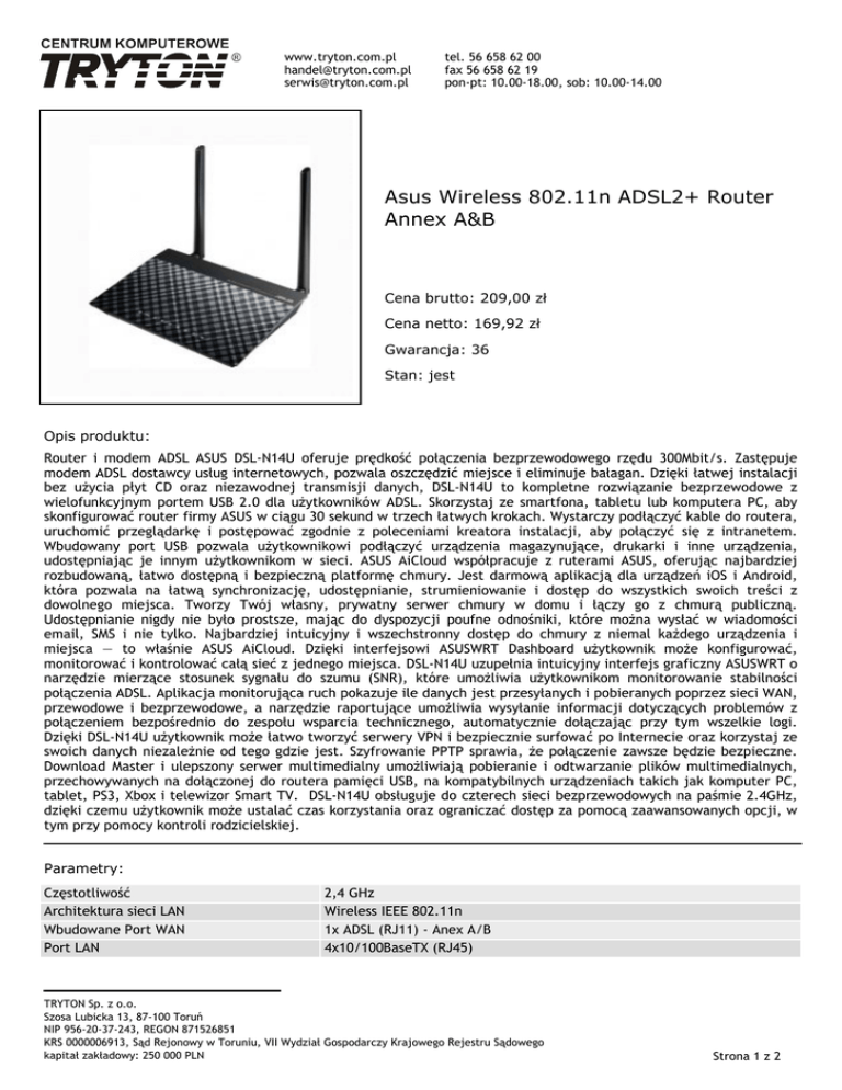 www.tryton.com.pl [email protected] [email protected] tel. 56 658 62 00 fax 56 658 62 19 pon-pt: 10.00-18.00, sob: 10.00-14.00 Asus Wireless 802.11n ADSL2+ Router Annex A&B Cena brutto: 209,00 zł Cena netto: 169,92 zł Gwarancja: 36 Stan: jest Opis produktu: Router i modem ADSL ASUS DSL-N14U oferuje prędkość połączenia bezprzewodowego rzędu 300Mbit/s. Zastępuje modem ADSL dostawcy usług internetowych, pozwala oszczędzić miejsce i eliminuje bałagan. Dzięki łatwej instalacji bez użycia płyt CD oraz niezawodnej transmisji danych, DSL-N14U to kompletne rozwiązanie bezprzewodowe z wielofunkcyjnym portem USB 2.0 dla użytkowników ADSL. Skorzystaj ze smartfona, tabletu lub komputera PC, aby skonfigurować router firmy ASUS w ciągu 30 sekund w trzech łatwych krokach. Wystarczy podłączyć kable do routera, uruchomić przeglądarkę i postępować zgodnie z poleceniami kreatora instalacji, aby połączyć się z intranetem. Wbudowany port USB pozwala użytkownikowi podłączyć urządzenia magazynujące, drukarki i inne urządzenia, udostępniając je innym użytkownikom w sieci. ASUS AiCloud współpracuje z ruterami ASUS, oferując najbardziej rozbudowaną, łatwo dostępną i bezpieczną platformę chmury. Jest darmową aplikacją dla urządzeń iOS i Android, która pozwala na łatwą synchronizację, udostępnianie, strumieniowanie i dostęp do wszystkich swoich treści z dowolnego miejsca. Tworzy Twój własny, prywatny serwer chmury w domu i łączy go z chmurą publiczną. Udostępnianie nigdy nie było prostsze, mając do dyspozycji poufne odnośniki, które można wysłać w wiadomości email, SMS i nie tylko. Najbardziej intuicyjny i wszechstronny dostęp do chmury z niemal każdego urządzenia i miejsca — to właśnie ASUS AiCloud. Dzięki interfejsowi ASUSWRT Dashboard użytkownik może konfigurować, monitorować i kontrolować całą sieć z jednego miejsca. DSL-N14U uzupełnia intuicyjny interfejs graficzny ASUSWRT o narzędzie mierzące stosunek sygnału do szumu (SNR), które umożliwia użytkownikom monitorowanie stabilności połączenia ADSL. Aplikacja monitorująca ruch pokazuje ile danych jest przesyłanych i pobieranych poprzez sieci WAN, przewodowe i bezprzewodowe, a narzędzie raportujące umożliwia wysyłanie informacji dotyczących problemów z połączeniem bezpośrednio do zespołu wsparcia technicznego, automatycznie dołączając przy tym wszelkie logi. Dzięki DSL-N14U użytkownik może łatwo tworzyć serwery VPN i bezpiecznie surfować po Internecie oraz korzystaj ze swoich danych niezależnie od tego gdzie jest. Szyfrowanie PPTP sprawia, że połączenie zawsze będzie bezpieczne. Download Master i ulepszony serwer multimedialny umożliwiają pobieranie i odtwarzanie plików multimedialnych, przechowywanych na dołączonej do routera pamięci USB, na kompatybilnych urządzeniach takich jak komputer PC, tablet, PS3, Xbox i telewizor Smart TV. DSL-N14U obsługuje do czterech sieci bezprzewodowych na paśmie 2.4GHz, dzięki czemu użytkownik może ustalać czas korzystania oraz ograniczać dostęp za pomocą zaawansowanych opcji, w tym przy pomocy kontroli rodzicielskiej. Parametry: Częstotliwość Architektura sieci LAN Wbudowane Port WAN Port LAN 2,4 GHz Wireless IEEE 802.11n 1x ADSL (RJ11) - Anex A/B 4x10/100BaseTX (RJ45) TRYTON Sp. z o.o. Szosa Lubicka 13, 87-100 Toruń NIP 956-20-37-243, REGON 871526851 KRS 0000006913, Sąd Rejonowy w Toruniu, VII Wydział Gospodarczy Krajowego Rejestru Sądowego kapitał zakładowy: 250 000 PLN Strona 1 z 2 www.tryton.com.pl [email protected] [email protected] Szyfrowanie Obsługa Neostrady Plus/NET24/Orange/Tele2 Obsługa DSL Internet (Aster City, UPC, osiedlowe sieci kablowe) Wbudowany modem ADSL/VDSL Obsługa 3G/4G Obsługiwane protokoły Obsługiwane protokoły VPN Interfejs USB tel. 56 658 62 00 fax 56 658 62 19 pon-pt: 10.00-18.00, sob: 10.00-14.00 WPA2 WPA WPS WEP Tak Nie Tak Nie 802.11g 802.11b DHCP Server - Dynamic Host Configuration Protocol - protokół dynamicznego konfigurowania węzłów TCP/IP - standard komunikacji otwartej. PPPoE - Point-to-Point Protocol over Ethernet ICMP - internetowy protokół komunikatów 802.11n UPnP - protokół typu P2P ("połączenie bezpośrednie") dla komputerów osobistych oraz urządzeń WiFi DDNS - Dynamic Domain Name Syste QoS - Quality of Service (kontrola jakość usług i przepustowości) DLNA - Digital Living Network Alliance Mutiple SSID (guest network) FTP - protokół transmisji plików Samba IPSec pass-trough L2TP pass-trough PPTP pass-trough 1 x USB 2.0 Mimo dołożenia wszelkich starań nie gwarantujemy, że publikowane dane techniczne nie zawierają uchybień lub błędów. W przypadku jakichkolwiek wątpliwości prosimy przed podjęciem decyzji o kontakt z handlowcem. Przedstawiona oferta cenowa ma charakter informacyjny, nie stanowi oferty handlowej w rozumieniu Art.66 par.1 Kodeksu Cywilnego oraz innych właściwych przepisów prawnych. TRYTON Sp. z o.o. Szosa Lubicka 13, 87-100 Toruń NIP 956-20-37-243, REGON 871526851 KRS 0000006913, Sąd Rejonowy w Toruniu, VII Wydział Gospodarczy Krajowego Rejestru Sądowego kapitał zakładowy: 250 000 PLN Strona 2 z 2