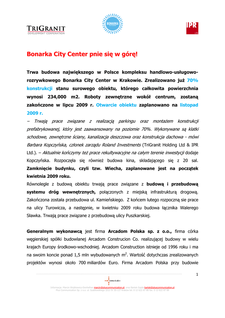Bonarka City Center pnie się w górę! Trwa budowa największego w Polsce kompleksu handlowo-usługoworozrywkowego Bonarka City Center w Krakowie. Zrealizowano już 70% konstrukcji stanu surowego obiektu, którego całkowita powierzchnia wynosi 234,000 m2. Roboty zewnętrzne wokół centrum, zostaną zakończone w lipcu 2009 r. Otwarcie obiektu zaplanowano na listopad 2009 r. – Trwają prace związane z realizacją parkingu oraz montażem konstrukcji prefabrykowanej, który jest zaawansowany na poziomie 70%. Wykonywane są klatki schodowe, zewnętrzne ściany, kanalizacja deszczowa oraz konstrukcja dachowa - mówi Barbara Kopczyńska, członek zarządu Roland Investments (TriGranit Holding Ltd & IPR Ltd.). – Aktualnie kończymy też prace rekultywacyjne na całym terenie inwestycji dodaje Kopczyńska. Rozpoczęła się również budowa kina, składającego się z 20 sal. Zamknięcie budynku, czyli tzw. Wiecha, zaplanowane jest na początek kwietnia 2009 roku. Równolegle z budową obiektu trwają prace związane z budową i przebudową systemu dróg wewnętrznych, połączonych z miejską infrastrukturą drogową. Zakończona została przebudowa ul. Kamieńskiego. Z końcem lutego rozpoczną sie prace na ulicy Turowicza, a następnie, w kwietniu 2009 roku budowa łącznika Walerego Sławka. Trwają prace związane z przebudową ulicy Puszkarskiej. Generalnym wykonawcą jest firma Arcadom Polska sp. z o.o., firma córka węgierskiej spółki budowlanej Arcadom Construcion Co. realizującej budowy w wielu krajach Europy środkowo-wschodniej. Arcadom Construction istnieje od 1996 roku i ma na swoim koncie ponad 1,5 mln wybudowanych m2. Wartość dotychczas zrealizowanych projektów wynosi około 700 miliardów Euro. Firma Arcadom Polska przy budowie -------------------------------------------------------------------------------------------------------------------------------------------- Informacje: Marcin Wojtkiewicz-Donhefner [email protected], oraz Bartek Gajda [email protected] Plus Communication Sp. z o.o. ul. Szablowskiego 3/LU IV 30-127 Kraków tel. 0 12 622 87 80 fax. 0 12 622 87 88 1 Bonarka City Center zatrudnia wielu podwykonawców z rynku lokalnego takich jak: Barzak, Energopol, Bud-max, Consolis, Technobud. Projekt ma w pełni zapewnione finansowanie bankowe. Kredytodawcą jest niemiecki Aareal Bank AG specjalizujący się w finansowaniu nieruchomości komercyjnych w tym dużych, wielofunkcyjnych projektów. Mamy duże doświadczenie w finansowaniu wielofunkcyjnych obiektów komercyjnych na całym świecie. W Polsce finansujemy znaczące projekty handlowe takie jak: warszawska Galeria Mokotów oraz Centrum Handlowe Arkadia. Współpracowaliśmy również przy poprzednim projekcie TriGranit realizowanym w Polsce – Silesia City Center w Katowicach – mówi Dyrektor Zarządzający Aareal Bank AG w Polsce Michał Sternicki. Bonarka City Center to bardzo dobry projekt, jesteśmy zadowoleni z postępu prac i czekamy na otwarcie dodaje Sternicki. -------------------------------------------------------------------------------------------------------------------------------------------- Informacje: Marcin Wojtkiewicz-Donhefner [email protected], oraz Bartek Gajda [email protected] Plus Communication Sp. z o.o. ul. Szablowskiego 3/LU IV 30-127 Kraków tel. 0 12 622 87 80 fax. 0 12 622 87 88 2