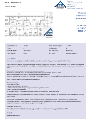 Locus s.c. ul. Konduktorska 1 lok. 1A 00-775 Warszawa 022 828 28 73 www.locus.pl, [email protected] BIURO NA WYNAJEM 59553/118/OBD Warszawa _ƌſĚŵŝĞƑĐŝĞ Stare Miasto 22 500 PLN 45 PLN/m² 500.00 m² Czynsz najmu m² 45 PLN Koszt eksploatacji m² 16.0 PLN WŝħƚƌŽ 0 >ŝĐnjďĂƉŝħƚĞƌ 3 Rodzaj budynku [biurowiec] Typ zabudowy [biurowiec] Przeznaczenie biuro Typ lokalu ďŝƵƌŽǁŽͲƵƐųƵŐŽǁLJ OPIS OFERTY WƌŽƉŽŶƵũĞŵLJĚŽǁLJŶĂũħĐŝĂƐĂŵŽĚnjŝĞůŶLJŵŽĚƵųďŝƵƌŽǁLJǁďŝƵƌŽǁĐƵŬůĂƐLJƵƐLJƚƵŽǁĂŶLJŵǁƉŽďůŝǏƵƉů͘<ƌĂƐŝŷƐŬŝĐŚ͘ ŶĂŬŽŵŝƚĂůŽŬĂůŝnjĂĐũĂďůŝƐŬŽ^ƚĂƌĞŐŽDŝĂƐƚĂƐƚĂŶŽǁŝĚŽƐŬŽŶĂųĞŵŝĞũƐĐĞĚůĂĨŝƌŵĐĞŶŝČĐLJĐŚƐČƐŝĞĚnjƚǁŽŬůŝŵĂƚLJĐnjŶĞũ͕ǁĂƌƐnjĂǁƐŬŝĞũ^ƚĂƌſǁŬŝǁ ƉŽųČĐnjĞŶŝƵnjĐĞŶƚƌĂůŶČůŽŬĂůŝnjĂĐũČŝƑǁŝĞƚŶLJŵĚŽũĂnjĚĞŵnjŬĂǏĚĞũĚnjŝĞůŶŝĐLJŵŝĂƐƚĂ͘ŝƵƌŽǁŝĞĐƉŽųŽǏŽŶLJũĞƐƚ10 minut spacerem od stacji metra Ratusz. KĨĞƌƵũĞŵLJWĂŷƐƚǁƵǁLJĚnjŝĞůŽŶČƉŽǁŝĞƌnjĐŚŶŝħŶĂƉĂƌƚĞƌnjĞďŝƵƌŽǁĐĂ͘ ŝƵƌŽƐƚĂŶŽǁŝnjĂŵŬŶŝħƚLJŵŽĚƵų͘tƌĂŵĂĐŚƉŽǁŝĞƌnjĐŚŶŝǁųĂƐŶLJǁħnjĞųƐĂŶŝƚĂƌŶLJ͕ŵŽǏůŝǁĂŬƵĐŚŶŝĂ ŝƵƌŽĚŽĂĚĂƉƚĂĐũŝǁŐƉŽƚƌnjĞďŶĂũĞŵĐLJ͘DŽǏůŝǁLJĚŽǁŽůŶLJƉŽĚnjŝĂųƉŽǁŝĞƌnjĐŚŶŝ͘ tƐƚĂŶĚĂƌĚnjŝĞǁLJŬŽŷĐnjĞŶŝĞnjĞƑĐŝĂŶŬĂŵŝĚnjŝĂųŽǁLJŵŝ͕ƐƵĨŝƚĞŵƉŽĚǁŝĞƐnjĂŶLJŵŝǁLJŬųĂĚnjŝŶČ͘ĚũħĐŝĂƉƌnjĞĚƐƚĂǁŝĂũĂƉƌnjLJŬųĂĚŽǁĞǁLJŬŽŷĐnjĞŶŝĞ͘ <ůĂƚŬĂƐĐŚŽĚŽǁĂƑǁŝĞǏŽŽĚŵĂůŽǁĂŶĂ͕ƌĞĐĞƉĐũĂŶĂƉĂƌƚĞƌnjĞ͘ Warunki komercyjne: - czynsz 45njųͬŵ2/netto , ͲŽƉųĂƚĂĞŬƐƉůŽĂƚĂĐLJũŶĂ16njųͬŵ2/netto ͲĚŽĚĂƚŬŽǁĞŬŽƐnjƚLJĞŬƐƉůŽĂƚĂĐLJũŶĞ͗ĞŶĞƌŐŝĂĞůĞŬƚƌLJĐnjŶĂǁŐǁƐŬĂnjĂŷůŝĐnjŶŝŬĂ ͲŬĂƵĐũĂ͗ƚƌnjLJŵŝĞƐŝħĐnjŶĂnjŽƉųĂƚĂŵŝ EĂŬĂǏĚĞ100m2ũĞĚŶŽŵŝĞũƐĐĞƉĂƌŬŝŶŐŽǁĞƉųĂƚŶĞ350njųŶĞƚƚŽŵŝĞƐŝħĐnjŶŝĞͲĚŽƉŽƚǁŝĞƌĚnjĞŶŝĂ͘ /ƐƚŶŝĞũĞŵŽǏůŝǁŽƑđǁLJŶĂũħĐŝĂƐĂůŝŬŽŶĨĞƌĞŶĐLJũŶĞũ;ŽĚ20m2 do 150m2Ϳ͕ĂŶĂǁĞƚǁLJŶĂũħĐŝĂƐĂůŝǁLJƐƚĂǁŽǁĞũ480m2͘tƐnjLJƐƚŬŝĞƐĂůĞƐČǁƉĞųŶŝ multimedialne. ŽƐƚħƉŶLJũĞƐƚƐnjĞƌŽŬŽƉĂƐŵŽǁLJŝŶƚĞƌŶĞƚ͕ŶĂǁĞƚ100DďƐnjĞƐƚĂǁŝĂŶLJũĂŬŽųČĐnjĞƐLJŵĞƚƌLJĐnjŶĞ͘KĐŚƌŽŶĂŽďŝĞƚŬƚƵŝŵŽŶŝƚŽƌŽǁĂŶŝĞ ĐĂųŽĚŽďŽǁĞ͘EĂŵŝĞũƐĐƵƌĞƐƚĂƵƌĂĐũĂǁųŽƐŬĂ͘ŽĚĂƚŬŽǁĂŽƉųĂƚĂnjĂĞŶĞƌŐŝħĞůĞŬƚƌLJĐnjŶČǁŐ͘ǁƐŬĂnjĂŷůŝĐnjŶŝŬĂŝƉŽųĂĐnjĞŶŝĂƚĞůĞĨŽŶŝĐnjŶĞǁ ƉƌnjLJƉĂĚŬƵƑǁŝĂĚĐnjĞŶŝĂŶĂƌnjĞĐnjEĂũĞŵĐLJƵƐųƵŐƚĞůĞŬŽŵƵŶŝŬĂĐLJũŶLJĐŚ͘ Zapraszamy na spotkanie. EƵŵĞƌůŝĐĞŶĐũŝƉŽƑƌĞĚŶŝŬĂŽĚƉŽǁŝĞĚnjŝĂůŶĞŐŽnjĂǁŽĚŽǁŽnjĂǁLJŬŽŶĂŶŝĞƵŵŽǁLJƉŽƑƌĞĚŶŝĐƚǁĂ͗Ϯϰϰϴ Kontakt DĂųŐŽƌnjĂƚĂ<ŽǁĂůƐŬĂ BIURO NA WYNAJEM 59553/118/OBD 668 117 100 [email protected] KK&Zd% Locus s.c. ul. Konduktorska 1 lok. 1A 00-775 Warszawa 022 828 28 73 www.locus.pl, [email protected]