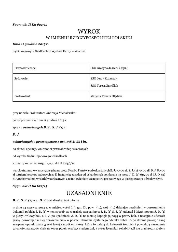 Sygn. akt II Ka 622/15 WYROK W IMIENIU RZECZYPOSPOLITEJ POLSKIEJ Dnia 11 grudnia 2015 r. Sąd Okręgowy w Siedlcach II Wydział Karny w składzie: Przewodniczący: SSO Grażyna Jaszczuk (spr.) Sędziowie: SSO Jerzy Kozaczuk SSO Teresa Zawiślak Protokolant: stażysta Renata Olędzka przy udziale Prokuratora Andrzeja Michalczuka po rozpoznaniu w dniu 11 grudnia 2015 r. sprawy oskarżonych B. J., S. J. (1) i D. J. oskarżonych o przestępstwo z art. 158 §1 kk i in. na skutek apelacji, wniesionej przez obrońcę oskarżonych od wyroku Sądu Rejonowego w Siedlcach z dnia 14 września 2015 r. sygn. akt II K 656/14 wyrok utrzymuje w mocy; zasądza na rzecz Skarbu Państwa od oskarżonych B. J. 70,00 zł , S. J. (1) 70,00 zł i D. J. 80,00 zł tytułem kosztów sądowych za II instancję; zasądza od oskarżonych solidarnie na rzecz J. D. (1) 615,00 zł i J. D. (2) 615,00 zł tytułem wydatków związanych z ustanowieniem zastępstwa procesowego w postępowaniu odwoławczym. Sygn. akt II Ka 622/15 UZASADNIENIE B. J., S. J. (1) oraz D. J. zostali oskarżeni o to, że: w dniu 14 czerwca 2014 r. w miejscowości (...), gm. D., pow. (...), woj. (...) działając wspólnie i w porozumieniu dokonali pobicia J. D. (1) w ten sposób, że w trakcie szarpaniny z J. D. (1) S. J. (1) uderzał i dźgał mopem J. D. (1) w plecy i w lewy bok, a B. J. po upadnięciu J. D. (1) na ziemię kopnęła ją nogą w prawy bok, a następnie uderzała gracą, powodując u niej obrażenia ciała w postaci złamania dystalnego odcinka żebra 10 po stronie prawej i ranę szarpaną opuszki palca 3 ręki lewej z ubytkiem skóry, które to należą do kategorii średnich i powodują naruszenie czynności narządów ciała na okres przekraczający siedem dni, a okres leczenia i rehabilitacji nie przekroczy sześciu miesięcy, przy czym sposób działania naraził ją na bezpośrednie niebezpieczeństwo utraty życia albo nastąpienia skutku określonego w art. 156 § 1 kk lub w art. 157 § 1 kk, tj. o przestępstwo określone w art. 158 § 1 kk a nadto D. J. został oskarżony o to, że: w dniu 14 czerwca 2014 r. w miejscowości (...) gm. D., powiat (...), woj. (...) dopuścił się w stosunku do J. D. (2) naruszenia nietykalności poprzez szarpanie za ubrania i uderzenie w głowę, nie powodując uszkodzenia ciała, tj. o przestępstwo określone w art. 217 § 1 kk Sąd Rejonowy w Siedlcach wyrokiem z dnia 14 września 2015 r., sygn. II K 656/14: I. oskarżonych B. J. i S. J. (1) uznał za winnych dokonania zarzucanego im czynu wyczerpującego dyspozycję art. 158 § 1 kk i za to na podstawie art. 158 § 1 kk w zw. z art. 37a kk wymierzył oskarżonym kary grzywny w wymiarze po 50 (pięćdziesiąt) stawek dziennych, ustalając na podstawie art. 33 § 3 kk wysokość stawki dziennej na kwotę 10,00 (dziesięć) złotych każda z nich; II. na podstawie art. 66 § 1 kk i art. 67 § 1 kk wobec oskarżonego D. J. postępowanie karne warunkowo umorzył na okres próby jednego roku; III. na podstawie art. 67 § 3 kk w zw. z art. 72 § 1 pkt 2 kk zobowiązał oskarżonego D. J. do przeproszenia pokrzywdzonego J. D. (2); IV. zasądził od oskarżonych solidarnie na rzecz oskarżycieli posiłkowych J. D. (1) i J. D. (2) kwotę 1.599,00 (jeden tysiąc pięćset dziewięćdziesiąt dziewięć) złotych tytułem wydatków związanych z ustanowieniem pełnomocnika procesowego; V. obciążył oskarżonych B. J. i S. J. (1) kwotami po 50,00 (pięćdziesiąt) złotych, a D. J. kwotą 60,00 (sześćdziesiąt) złotych tytułem opłaty sądowej oraz zwolnił ich od ponoszenia pozostałych kosztów sądowych. Apelację od przedstawionego wyżej wyroku wniósł obrońca oskarżonych S. J. (1), B. J. oraz D. J., zaskarżając wyrok w całości na korzyść oskarżonych, orzeczeniu temu zarzucając: - błąd w ustaleniach faktycznych, będący wynikiem mającej wpływ na treść orzeczenia obrazy przepisów postępowania (zwłaszcza art. 4 kpk, art. 5 § 2 kpk, art. 7 kpk i art. 410 kpk), który to błąd wyrażał się w przyjęciu, że zgromadzony w sprawie materiał dowodowy wskazuje, że oskarżeni mieli swoim zachowaniem co do zasady wypełnić znamiona zarzucanych im w akcie oskarżenia czynów, podczas gdy obiektywna ocena zgromadzonego w sprawie materiału dowodowego w żadnym wypadku nie dawała podstawy do przyjęcia odpowiedzialności każdego z trojga oskarżonych za czyny przypisane w wyroku, - naruszenie przepisów postępowania poprzez zaniechanie wszechstronnego rozważenia przez Sąd orzekający w I instancji – oraz dania temu wyraz w uzasadnieniu wyroku sporządzonemu w sposób określony w art. 424 § 1 kpk – zebranego w sprawie materiału dowodowego, co powinno stanowić obraz logicznego procesu myślowego, który doprowadził Sąd do określonego rozstrzygnięcia w sprawie, a nie w wybiórczym przedstawieniu wyłącznie tych dowodów i argumentów, które pasują do przyjętej „koncepcji” orzeczenia i pominięcie dowodów obrazujących w sposób radykalnie odmienny przebieg zdarzeń z dnia 14 czerwca 2014 r., to zaś rażąco odbiega od obowiązku nałożonego na Sąd, polegającego na swobodnej, a nie dowolnej ocenie dowodów, - naruszenie art. 170 § 1 kpk poprzez oddalenie wniosku obrony o nadesłanie całościowej dokumentacji z leczenia pokrzywdzonej J. D. (1), które to zarzuty, w ocenie obrońcy oskarżonych, co najmniej mogły mieć wpływ na treść zaskarżonego wyroku. Podnosząc powyższe zarzuty obrońca oskarżonych wniósł o zmianę wyroku na korzyść oskarżonych i uniewinnienie ich od zarzuconych czynów (z orzeczeniem o kosztach procesu na podstawie art. 632 kpk), ewentualnie wniósł o uchylenie wyroku i przekazanie sprawy do ponownego rozpoznania Sądowi Rejonowemu w Siedlcach, przy uznaniu, iż istnieją ku temu przesłanki. Z ostrożności procesowej – na wypadek niepodzielenia przez Sąd Odwoławczy argumentacji zawartej w apelacji, w części postulującej o uniewinnienie oskarżonych, czy te