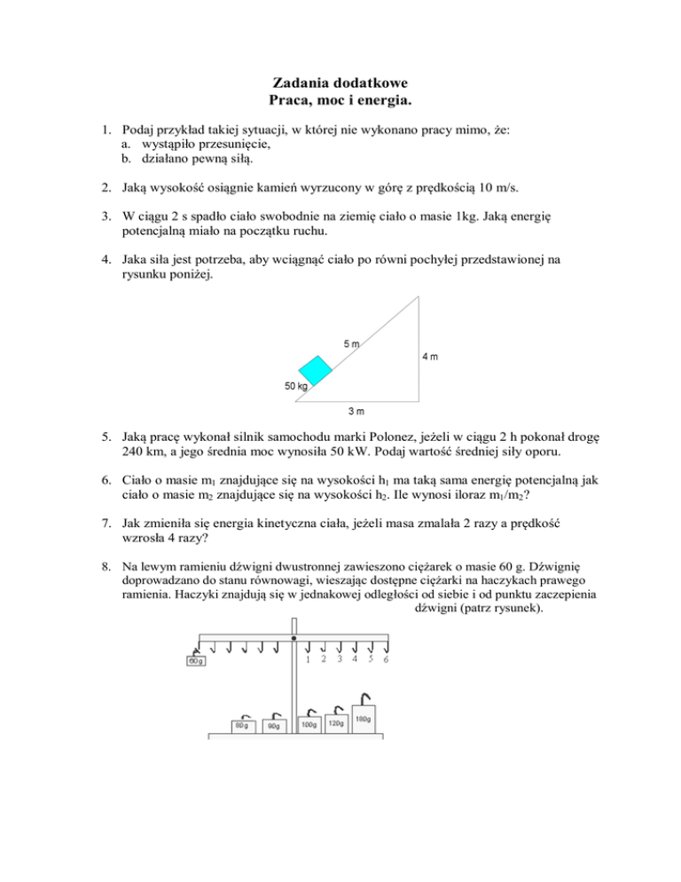 Zadania dodatkowe Praca, moc i energia. 1. Podaj przykład takiej sytuacji, w której nie wykonano pracy mimo, że: a. wystąpiło przesunięcie, b. działano pewną siłą. 2. Jaką wysokość osiągnie kamień wyrzucony w górę z prędkością 10 m/s. 3. W ciągu 2 s spadło ciało swobodnie na ziemię ciało o masie 1kg. Jaką energię potencjalną miało na początku ruchu. 4. Jaka siła jest potrzeba, aby wciągnąć ciało po równi pochyłej przedstawionej na rysunku poniżej. 5. Jaką pracę wykonał silnik samochodu marki Polonez, jeżeli w ciągu 2 h pokonał drogę 240 km, a jego średnia moc wynosiła 50 kW. Podaj wartość średniej siły oporu. 6. Ciało o masie m1 znajdujące się na wysokości h1 ma taką sama energię potencjalną jak ciało o masie m2 znajdujące się na wysokości h2. Ile wynosi iloraz m1/m2 ? 7. Jak zmieniła się energia kinetyczna ciała, jeżeli masa zmalała 2 razy a prędkość wzrosła 4 razy? 8. Na lewym ramieniu dźwigni dwustronnej zawieszono ciężarek o masie 60 g. Dźwignię doprowadzano do stanu równowagi, wieszając dostępne ciężarki na haczykach prawego ramienia. Haczyki znajdują się w jednakowej odległości od siebie i od punktu zaczepienia dźwigni (patrz rysunek). W której sytuacji dźwignia będzie w równowadze? Wybierz odpowiedź spośród podanych. A. B. C. D. 9. Haczyk 5, ciężarek 80 g Haczyk 4, ciężarek 90 g Haczyk 3, ciężarek 100 g Haczyk 2, ciężarek 120 g Ile zmieni się energia kinetyczna pocisku o masie 20g, który poruszając się w z prędkością 600m/s przebija drzewo i wylatuje z niego z prędkością 400m/s? Jaką pracę wykonały siły oporów drewna? 10. Z wysokości 20m swobodnie spada ciało o masie 2 kg. Jaką prędkość osiągnie to ciało na wysokości 5m nad ziemią? 11. Oblicz wykonaną pracę przez siłę w ciągu 5 s jeżeli przesunęła ciało o 5 m. Wykres zmian siły w czasie przedstawia ilustracja poniżej.