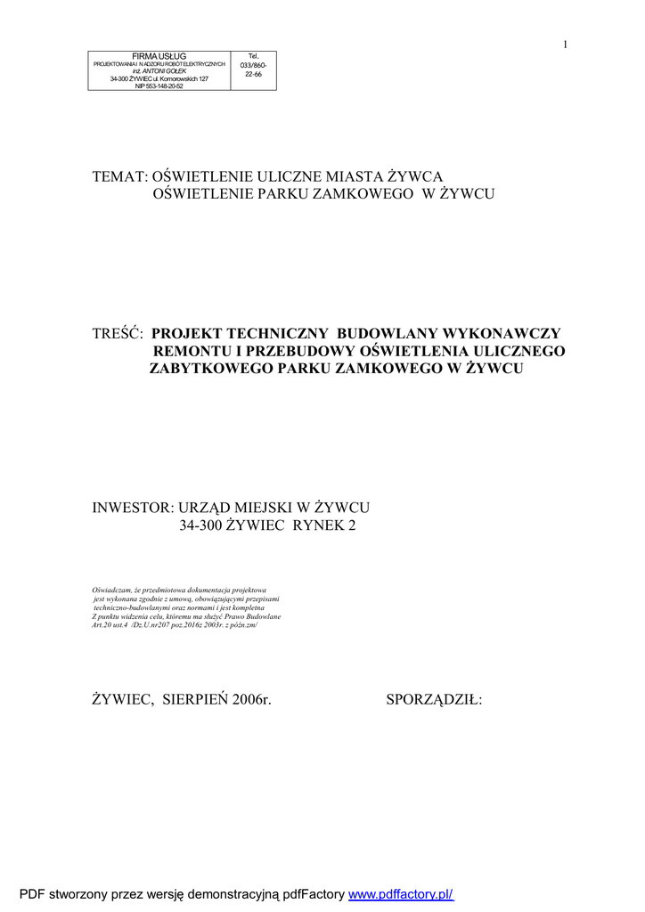 1 FIRMA USŁUG PROJEKTOWANIA I N ADZORU ROBÓT ELEKTRYCZNYCH inż. ANTONI GOŁEK 34-300 ŻYWIEC ul. Komorowskich 127 NIP 553-148-20-52 Tel.. 033/86022-66 TEMAT: OŚWIETLENIE ULICZNE MIASTA ŻYWCA OŚWIETLENIE PARKU ZAMKOWEGO W ŻYWCU TREŚĆ: PROJEKT TECHNICZNY BUDOWLANY WYKONAWCZY REMONTU I PRZEBUDOWY OŚWIETLENIA ULICZNEGO ZABYTKOWEGO PARKU ZAMKOWEGO W ŻYWCU INWESTOR: URZĄD MIEJSKI W ŻYWCU 34-300 ŻYWIEC RYNEK 2 Oświadczam, że przedmiotowa dokumentacja projektowa jest wykonana zgodnie z umową, obowiązującymi przepisami techniczno-budowlanymi oraz normami i jest kompletna Z punktu widzenia celu, któremu ma służyć Prawo Budowlane Art.20 ust.4 /Dz.U.nr207 poz.2016z 2003r. z późn.zm/ ŻYWIEC, SIERPIEŃ 2006r. SPORZĄDZIŁ: PDF stworzony przez wersję demonstracyjną pdfFactory www.pdffactory.pl/ 2 FIRMA USŁUG PROJEKTOWANIA I N ADZORU ROBÓT ELEKTRYCZNYCH inż. ANTONI GOŁEK 34-300 ŻYWIEC ul. Komorowskich 127 Tel.. 0/?/33/86022-66 ZAWARTOŚĆ OPRACOWANIA 1. OPIS TECHNICZNY 1.1. WSTĘP 1.2. PODSTAWA OPRACOWANIA 1.3. ZAKRES OPRACOWANIA 1.4. OPRACOWANIA ZWIĄZANE 1.5. STAN ISTNIEJĄCY 1.6. STAN PROJEKTOWANY OŚWIETLENIA 1.7. PROJ. LINIA KABLOWA OŚWIETLENIA 1.8. POŁĄCZENIE Z ISTNIEJĄCĄ SIECIĄ OŚWIETLENIOWĄ 1.9. PRZEBUDOWA PUNKTU ZAPALANIA OŚWIETLENIA 1.10. UZIEMIENIA I OCHRONA PRZED PORAŻENIEM 1.11. UWAGI KOŃCOWE 2. OBLICZENIA 3. ZESTAWIENIE MATERIAŁÓW 4. PRZEDMIAR ROBÓT 5. RYSUNKI: 1. SYTUACJA 1:10000 2. TRASA ISTNIEJĄCEGO OŚWIETLENIA W SKALI 1:500 cz.1 3. PLAN TRASY PROJ. LINII KABLOWEJ OŚWIETLENIA W SKALI 1:500 cz.2 4. PLAN TRASY PROJ. LINII KABLOWEJ OŚWIETLENIA W SKALI 1:500 cz. 3 PDF stworzony przez wersję demonstracyjną pdfFactory www.pdffactory.pl/ 3 5. SCHEMAT UKŁADU ZASILANIA 6. STAN ISTNIEJĄCEGO OŚWIETLENIA NA MAPIE EWIDENCYJNEJ 1:1000 7. PLAN TRASY PROJ. LINII OŚWIETLENIA NA MAPIE EWIDENCYJNEJ 1:1000 8. WIDOK SŁUPÓW OŚWIETLENIOWYCH PDF stworzony przez wersję demonstracyjną pdfFactory www.pdffactory.pl/ 4 FIRMA USŁUG PROJEKTOWANIA I NADZORU ROBÓT ELEKTRYCZNYCH inż. ANTONI GOŁEK 34-300 ŻYWIEC ul. Komorowskich 127 Tel.. 0/?/33/86022-66 1. OPIS TECHNICZNY 1.1. WSTĘP Tematem niniejszego opracowania jest projekt Techniczny budowlano wykonawczy budowy oświetlenia alei głównej, dróżek i ścieżek, domku chińskiego i fontanny w Zabytkowym Parku Zamkowym w Żywcu. Projekt obejmuje remont istniejącego oświetlenia Parku w całości i dobudowę nowego oświetlenia. Projekt obejmuje oświetlenie terenu wokół Starego Zamku, oraz zasilanie iluminacji Starego Zamku. 1.2. PODSTAWA OPRACOWANIA Podstawę opracowania stanowią: 1. umowa - zlecenie na opracowanie projektu, 2. warunki przyłączenia wydane przez ENION RD ŻYWIEC nr WP/R4/1043/410081/06 , ORAZ NR WP/R4/1044/410080/06 z dnia 30.07.2006r. oraz warunki przebudowy nr BE/RD-4/ZS/SW/2980/2006 z dnia 28.07.2006r. 3. inwentaryzacja w terenie stanu istniejącego, 4. podkłady mapowe terenu – aktualizowane, 5. wytyczne Śląskiego Wojewódzkiego Konserwatora Zabytków w sprawie wyposażenia i oświetlenia Parku Zamkowego w Żywcu, oraz wstępne ustne uzgodnienie Konserwatora Zabytków w trakcie projektowania. 5. obowiązujące przepisy, katalogi, normy PN-84/E-02033, Pr EN 13201-I, 13201-II, 13201-III 13201-IV. 1.3. ZAKRES OPRACOWANIA Zakres opracowania obejmuje: 1. Zabudowę 145 sztuk latarni na słupach stalowych typu A1A, A2B, A3A, A5A produkcji ART.-METAL Łapino Górne z oprawami sodowymi o mocy 70W z oprawami stylowymi VEGA „A” w ilości 175 szt. w tym: 1 ramienne – 119 szt. 2 ramienne - 18 szt. 3 ramienne 5 szt. 5 ramienne 1 szt. oraz kinkiety na budynkach Na10 6szt. 2. Ułożenie 5632m linii kablowej typu YAKY 4x35mm2, w tym stacja Zamek 2935m, stacja Nowotki I 2697m, 3. linia zasilająca iluminację YKY5x2,5mm2 łącznie 358m, 4. linia kablowa YAKY 4x35mm2 domek chiński- fontanna 95m, 5. zasilanie kinkietów YKY 5x2,5mm2 85m, PDF stworzony przez wersję demonstracyjną pdfFactory www.pdffactory.pl/ 5 6. Zabudowa 2 punktów zapalania oświetlenia w stacji Zamek i Nowotki I i przełączenie istniejących obwodów oświetleniowych. Punkty zapalania wyposażone w tablicę licznikową dla pomiaru energii. 1.4. OPRACOWANIA ZWIĄZANE a/ b/ c/ d/ e/ z niniejszym opracowaniem są związane opracowania: Projekt ścieżek w Parku, Projekt odbudowy młynówki od ulicy Rzecznej, Projekt odbudowy fontanny i domku chińskiego, Projekt iluminacji Starego Zamku ES SYSTEM Kraków 2005, Projekt adaptacji stajni i wozowni na pomieszczenia wystawiennicze. 1.5. STAN ISTNIEJĄCY OŚWIETLENIA Istniejące oświetlenie Parku jest zasilane z punktów zasilania oświetlenia ze stacji Poczta i Nowotki I w ilości 2 obwody ze stacji Poczta, oraz 1 obwód ze stacji Nowotki I. Istniejące kable YAKY 4x16, YAKY 4x25, oraz YAKY 4x35mm2. Latarnie na słupach betonowych 3,5m z oprawami rtęciowymi częściowo wymienionymi na sodowe. 1.6. STAN PROJEKTOWANY OŚWIETLENIA Projektuje się remont istniejącego oświetlenia Parku w całości za wyjątkiem oświetlenia na ścieżce do wyjścia do Amfiteatru w ilości 7 szt. opraw na słupach stalowych oświetlenie nowe. Projektuje się nowe oświetlenie alejek spacerowych i ścieżek w okolicy domku chińskiego i fontanny, oraz innych. Zaprojektowano 4 obwody oświetlenia ze stacji Zamek, oraz 3 obwody oświetlenia ze stacji Nowotki I. Projektuje się oświetlenie terenu wokół Starego Zamku, który będzie miał wykonane nowe ścieżki wg odrębnych opracowań, ora nowe wejście od strony ulicy Rzecznej. Ułożenie linii kablowych, oraz lokalizacja latarń powinna być dostosowana do proj. układu ścieżek, które zostanie wykonane. Tereny wokół Starego Zamku będą miały nowy układ ścieżek. Wokół Starego Zamku zaprojektowano zasilanie iluminacji budynku Zamku wg opracowanego projektu iluminacji wg ES SYSTEM Kraków. Zaprojektowano oświetlenie terenu wokół stajni i wozowni, oraz wejścia do Parku od ulicy Zamkowej na kinkietach umieszczonych na ściana