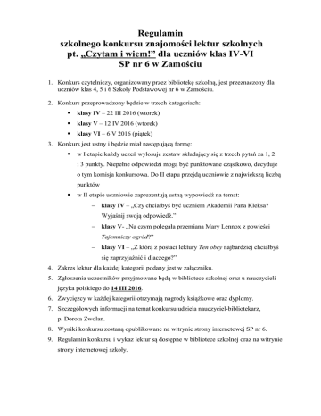 Regulamin szkolnego konkursu znajomości lektur szkolnych pt. „Czytam i wiem!” dla uczniów klas IV-VI SP nr 6 w Zamościu 1. Konkurs czytelniczy, organizowany przez bibliotekę szkolną, jest przeznaczony dla uczniów klas 4, 5 i 6 Szkoły Podstawowej nr 6 w Zamościu. 2. Konkurs przeprowadzony będzie w trzech kategoriach: klasy IV – 22 III 2016 (wtorek) klasy V – 12 IV 2016 (wtorek) klasy VI – 6 V 2016 (piątek) 3. Konkurs jest ustny i będzie miał następującą formę: w I etapie każdy uczeń wylosuje zestaw składający się z trzech pytań za 1, 2 i 3 punkty. Niepełne odpowiedzi mogą być punktowane cząstkowo, decyduje o tym komisja konkursowa. Do II etapu przejdą uczniowie z największą liczbą punktów w II etapie uczniowie zaprezentują ustną wypowiedź na temat: − klasy IV – „Czy chciałbyś być uczniem Akademii Pana Kleksa? Wyjaśnij swoją odpowiedź.” − klasy V- „Na czym polegała przemiana Mary Lennox z powieści Tajemniczy ogród?” − klasy VI – „Z którą z postaci lektury Ten obcy najbardziej chciałbyś się zaprzyjaźnić i dlaczego?” 4. Zakres lektur dla każdej kategorii podany jest w załączniku. 5. Zgłoszenia uczestników przyjmowane będą w bibliotece szkolnej oraz u nauczycieli języka polskiego do 14 III 2016. 6. Zwycięzcy w każdej kategorii otrzymają nagrody książkowe oraz dyplomy. 7. Szczegółowych informacji na temat konkursu udziela nauczyciel-bibliotekarz, p. Dorota Zwolan. 8. Wyniki konkursu zostaną opublikowane na witrynie strony internetowej SP nr 6. 9. Regulamin konkursu i wykaz lektur są dostępne w bibliotece szkolnej oraz na witrynie strony internetowej szkoły. ZAŁĄCZNIK Dla uczniów klas IV w konkursie wymagana jest znajomość następujących lektur: Brzechwa J. „Akademia Pana Kleksa” Collodi C. „Pinokio” Lewis C.S. „Opowieści z Narnii” cz.1 Dla uczniów klas V: Burnett F.H. „Tajemniczy ogród” Molnar F. „Chłopcy z placu broni” Montgomery L.M „Ania z Zielonego Wzgórza” Dla uczniów klas VI: Jurgielewiczowi I. „Ten obcy” Makuszyński K. „Szatan z siódmej klasy” Lem S. „Bajki robotów” (Trzej elektrycerze, Skarby króla Biskalara, Bajka o maszynie cyfrowej, co ze smokiem walczyła, Jak ocalał świat, Wielkie lanie)