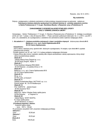Rzeszów , dnia 04.12. 2015 r. Wg rozdzielnika Dotyczy : postępowania o udzielenie zamówienia w trybie przetargu nieograniczonego na wykonanie zadania pn.: Sukcesywna dostawa artykułów spożywczych do stołówki szkolnej na potrzeby wyżywienia uczniów w Szkole Podstawowej nr 11 im.gen. Stanisława Maczka w Rzeszowie przy ul.Podwisłocze 14 ZAWIADOMIENIE O WYBORZE NAJKORZYSTNIEJSZEJ OFERTY ORAZ O TERMINIE ZAWARCIA UMOWY Zamawiający – Szkoła Podstawowa nr 11 im.gen. S. Maczka w Rzeszowie przy ul.Podwisłocze 14 działając na podstawie art.92 ust.1 pkt. 1 ustawy z dnia 29 stycznia 2004 r. – Prawo zamówień publicznych (tekst jedn. Dz. U. z 2013 r. poz.907 z późn. zm.) zawiadamia ,że w postępowaniu o udzielenie w/w zamówienia został a wybrana następująca oferta: I. dla zadanie nr 1 – dostawa produktów zwierzęcych, mięsa i produktów mięsnych złożona przez oferenta Nr 8 : Batista sp. z o.o.- sp.k.,Czarna Sędziszowska 89 B 39-123 Czarna Sędziszowska Uzasadnienie : Jest to oferta z najniższą ceną spośród ofert złożonych w postępowaniu. W związku z tym oferta Nr 8 uzyskała najwyższą ilość punktów. Ponadto zgodnie z art. 92 ust. 1 pkt 1,2 i 4 ustawy podajemy następujące informacje: 1.Nazwy (firmy) albo imiona i nazwiska ,siedziby albo miejsca zamieszkania i adresy wykonawców, którzy złożyli oferty na przedmiotowe zadanie : Oferta Nr 3 Zakłady Mięsne Nowy Żmigród sp. z o.o. 38-230 Nowy Żmigród , Mytarz 4 Oferta Nr 7 Firma Handlowo-Usługowa RES-SMAK 35-233 Rzeszów , ul.Lubelska 46 box nr 15 Oferta Nr 8 Batista sp. z o.o.- sp.k.,Czarna Sędziszowska 89 B 39-123 Czarna Sędziszowska Oferta Nr 10 EB sp. zo.o. 20-703 Lublin ,ul.Cisowa 9 Oferta Nr 11 Zakłady Przetwórstwa Mięsa MATTHIAS sp. z o.o. Kolonia Zamek 48, 23-310 Modliborzyce Oferta Nr 15 FHU KARPATIA Jolanta Krasoń 36-062 Zaczernie 792 A Oferta Nr 19 MIĘS-POL Halina i Wiesław Siwiec spółka jawna 35-054 Rzeszów , ul.Targowa 6 a Oferta Nr 25 Zakład Mięsny NOWY MAXPOL R.J Kizior spółka jawna 39-207 Brzeźnica ,ul.Leśna 2 2.Punktacja przyznana ofertom: Kryterium wyboru oferty: - cena - 100 % - 100 pkt Po porównaniu wszystkich ofert przyznano następującą punktację : Oferta Nr 3 Cena 82,96 pkt Oferta Nr 7 Cena 83,53 pkt Oferta Nr 8 Cena 100,00 pkt Oferta Nr 10 Cena Oferta Nr 11 Cena Oferta Nr 15 Cena Oferta Nr 19 Cena Oferta Nr 25 Cena 90,25 pkt 93,81 pkt 91,91 pkt 94,15 pkt 96,89 pkt II. dla zadania nr 2 – dostawa ryb i mrożonek złożona przez oferenta Nr 23 Iglotex Kraków sp. z o.o. 32 064 Krzeszowice ,ul.Daszyńskiego 10 a Filia Rzeszów 36-062 Zaczernie ,Pogwizdów Nowy 662 Uzasadnienie : Jest to oferta z najniższą ceną spośród ofert złożonych w postępowaniu. W związku z tym oferta Nr 23 uzyskała najwyższą ilość punktów. Ponadto zgodnie z art. 92 ust. 1 pkt 1,2 i 4 ustawy podajemy następujące informacje: 1.Nazwy (firmy) albo imiona i nazwiska ,siedziby albo miejsca zamieszkania i adresy wykonawców, którzy złożyli oferty na przedmiotowe zadanie : Oferta Nr 2 P. H. U. Prima Bąk spółka jawna 39-300 Mielec, ul.Głowackiego 27 Oferta Nr 9 POLARIS sp.jawna Hurtownia lodów i mrożonek Surowiecki Piotr i synowie 23-300 Janów Lubelski , ul.Wojska Polskiego 28 Oferta Nr 12 JAWIT A .i J.Białas , L.iW. Lampara sp. jawna 38-400 Krosno , ul.Mięsowicza 2 a Oferta Nr 23 Iglotex Kraków sp. z o.o. Filia Rzeszów 36-062 Zaczernie ,Pogwizdów Nowy 662 2.Punktacja przyznana ofertom: Kryterium wyboru oferty: - cena - 100 % - 100 pkt Po porównaniu wszystkich ofert przyznano następującą punktację : Oferta Nr 2 Cena 92,41 pkt Oferta Nr 9 Cena 81,69 pkt Oferta Nr 12 Cena 79,92 pkt Oferta Nr 23 Cena 100,00 pkt III. . dla zadania nr 3 – dostawa owoców, warzyw złożona przez oferenta Nr 20 NEKTAR Firma Handlowo-Produkcyjna Teresa Kępa 36-030 Błażowa Nowy Borek 287 Uzasadnienie : Jest to oferta z najniższą ceną spośród ofert złożonych w postępowaniu. W związku z tym oferta Nr 20 uzyskała najwyższą ilość punktów. Ponadto zgodnie z art. 92 ust. 1 pkt 1,2 i 4 ustawy podajemy następujące informacje: 1.Nazwy (firmy) albo imiona i nazwiska ,siedziby albo miejsca zamieszkania i adresy wykonawców, którzy złożyli oferty na przedmiotowe zadanie : Oferta Nr 14 P.P.U.H. GAMA Marek Garncarz 36-002 Jasionka , Stobierna 273 Oferta Nr 18 . Firma Usługowo- Handlowa ALEX Bronisława Drupka ,36-002 Jasionka 798 Oferta Nr 20 NEKTAR Firma Handlowo-Produkcyjna Teresa Kępa 36-030 Błażowa Nowy Borek 287 Oferta Nr 22 SAD Firma Handlowa Zofia Mrągowska - Gąsior 36-054 Mrowla, Rudna Wielka 283 Oferta Nr 28 Centrum Plus sp. zo.o. 36-100 Kolbuszowa , ul.Towarowa 4 2.Punktacja przyznana ofertom: Kryterium wyboru oferty: - cena - 100 % - 100 pkt Po porównaniu wszystkich ofert przyznano następującą punktację : Oferta Nr 14 Cena 96,98 pkt Oferta Nr 18 Cena odrzucona Oferta Nr 20 Cena 100,00 pkt Oferta Nr 22 Cena 95,57 pkt Oferta Nr 28 Cena 96,21 pkt IV. dla zadania nr 4 – dostawa produktów mleczarskich złożona przez oferenta Nr 13 Spółdzielnia Mleczarska MLEKOVITA 18-200 Wysokie Mazowieckie ,ul.Ludowa 122 Hurtownia Magazyn nr 28 w Trzebownisku 36-001 Trzebownisko 931 Uzasadnienie : Jest to oferta z najniższą ceną spośród ofert złożonych w postępowaniu. W związku z tym oferta Nr 13 uzyskała najwyższą ilość punktów. Ponadto zgodnie z art. 92 ust. 1 pkt 1,2 i 4 ustawy podajemy następujące informacje: 1.Nazwy (firmy) albo imiona i nazwiska ,siedziby albo miejsca zamieszkania i adresy wykonawców, którzy złożyli oferty na przedmiotowe zadanie : Oferta Nr 6 ALMAX-DYSTRYBUCJA spółka z o.o. Pańszczyzna ,21-002 Jastków Oferta Nr 13 Spółdzielnia Mleczarska MLEKOVITA 18-200 Wysokie Mazowieckie ,ul.Ludowa 122 Hurtownia Magazyn nr 28 w Trzebownisku 36-001 Trzebownisko 931 Oferta Nr 17 Okręgowa Spółdzielnia Mleczarska w Stalowej Woli 37-450 Stalowa Wola , ul.Staszica 1 Oferta Nr 20 NEKTAR Firma Handlowo-Produkcyjna Teresa Kępa 36-