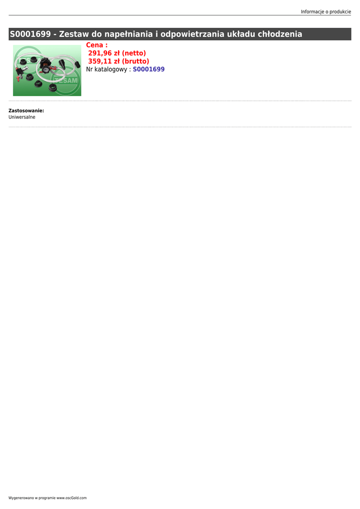 Informacje o produkcie S0001699 - Zestaw do napełniania i odpowietrzania układu chłodzenia Cena : 291,96 zł (netto) 359,11 zł (brutto) Nr katalogowy : S0001699 Zastosowanie: Uniwersalne Wygenerowano w programie www.oscGold.com