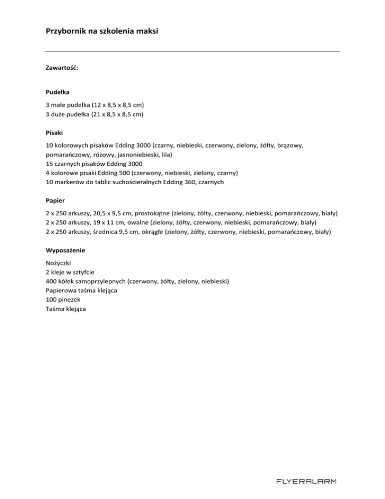 Przybornik na szkolenia maksi Zawartość: Pudełka 3 małe pudełka (12 x 8,5 x 8,5 cm) 3 duże pudełka (21 x 8,5 x 8,5 cm) Pisaki 10 kolorowych pisaków Edding 3000 (czarny, niebieski, czerwony, zielony, żółty, brązowy, pomarańczowy, różowy, jasnoniebieski, lila) 15 czarnych pisaków Edding 3000 4 kolorowe pisaki Edding 500 (czerwony, niebieski, zielony, czarny) 10 markerów do tablic suchościeralnych Edding 360, czarnych Papier 2 x 250 arkuszy, 20,5 x 9,5 cm, prostokątne (zielony, żółty, czerwony, niebieski, pomarańczowy, biały) 2 x 250 arkuszy, 19 x 11 cm, owalne (zielony, żółty, czerwony, niebieski, pomarańczowy, biały) 2 x 250 arkuszy, średnica 9,5 cm, okrągłe (zielony, żółty, czerwony, niebieski, pomarańczowy, biały) Wyposażenie Nożyczki 2 kleje w sztyfcie 400 kółek samoprzylepnych (czerwony, żółty, zielony, niebieski) Papierowa taśma klejąca 100 pinezek Taśma klejąca