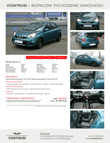 Nissan Micra 1.2 Marka: Model: Rok Produkcji: Pojemność silnika : Kolor Nadwozia: Skrzynia biegów: Nissan Micra 2014 1198 cm3 Niebieski Manual Przebieg : Moc silnika : Kolor Wnętrza: Rodzaj nadwozia: Ilość drzwi: Rodzaj paliwa: 27000 km 80 KM Czarny Hatchback 4/5 Benzyna OPIS POJAZDU: Data pierwszej rejestracji: 09.10.2014 Dokument sprzedaży: Faktura Vat 23% Dodatkowe Wyposażenie ✓Kierownica wykończona skórą ✓Klimatyzacja ✓Komputer pokładowy ✓Tempomat ✓Manualna skrzynia biegów Systemy Bezpieczeństwa ✓System monitorowania ciśnienia w oponach ✓Poduszka powietrzna kierowcy i pasażera Multimedia ✓Gniazdo AUX ✓Gniazdo USB / iPod® ✓Zestaw głośnomówiący Bluetooth ✓Radio CD FINANSOWANIE I UBEZPIECZENIA: Przykładowa rata miesięczna, wpłata 20%, okres leasingu/kredytu 48 miesięcy, 10% wykupu. Rata leasingu jest wartością netto bez vat. Rata: 566 Cena: 38 500 PLN PLN Niniejsza treść nie stanowi oferty w rozumieniu przepisów Kodeksu Cywilnego oraz opisu towaru ani zapewnienia w rozumieniu art. 4 Ustawy z dnia 27 lipca 2002r o szczególnych warunkach sprzedaży konsumenckiej. Powered by TCPDF (www.tcpdf.org)