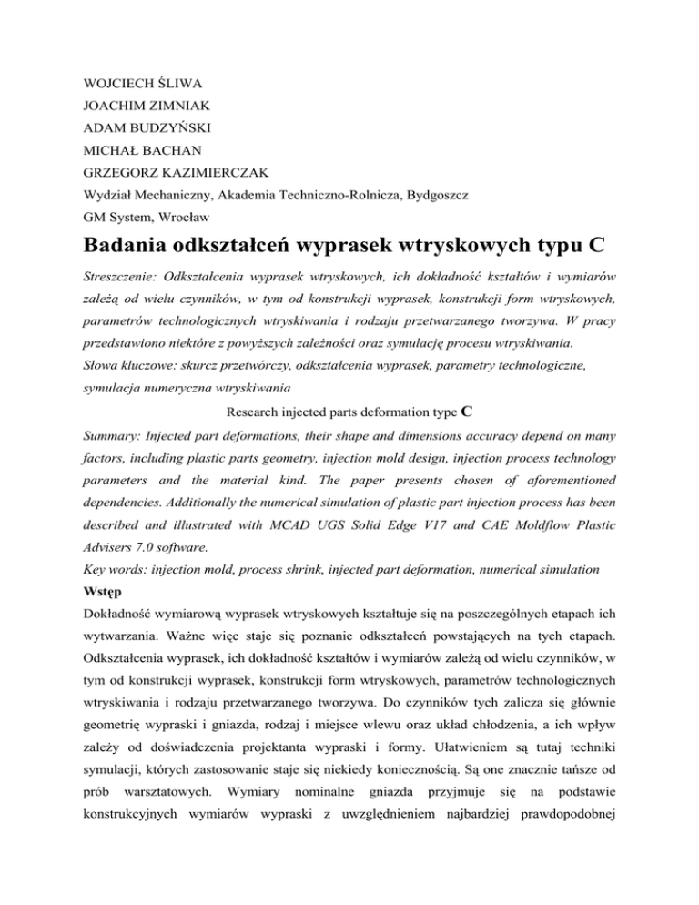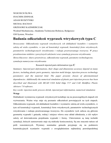 WOJCIECH ŚLIWA JOACHIM ZIMNIAK ADAM BUDZYŃSKI MICHAŁ BACHAN GRZEGORZ KAZIMIERCZAK Wydział Mechaniczny, Akademia Techniczno-Rolnicza, Bydgoszcz GM System, Wrocław Badania odkształceń wyprasek wtryskowych typu C Streszczenie: Odkształcenia wyprasek wtryskowych, ich dokładność kształtów i wymiarów zależą od wielu czynników, w tym od konstrukcji wyprasek, konstrukcji form wtryskowych, parametrów technologicznych wtryskiwania i rodzaju przetwarzanego tworzywa. W pracy przedstawiono niektóre z powyższych zależności oraz symulację procesu wtryskiwania. Słowa kluczowe: skurcz przetwórczy, odkształcenia wyprasek, parametry technologiczne, symulacja numeryczna wtryskiwania Research injected parts deformation type C Summary: Injected part deformations, their shape and dimensions accuracy depend on many factors, including plastic parts geometry, injection mold design, injection process technology parameters and the material kind. The paper presents chosen of aforementioned dependencies. Additionally the numerical simulation of plastic part injection process has been described and illustrated with MCAD UGS Solid Edge V17 and CAE Moldflow Plastic Advisers 7.0 software. Key words: injection mold, process shrink, injected part deformation, numerical simulation Wstęp Dokładność wymiarową wyprasek wtryskowych kształtuje się na poszczególnych etapach ich wytwarzania. Ważne więc staje się poznanie odkształceń powstających na tych etapach. Odkształcenia wyprasek, ich dokładność kształtów i wymiarów zależą od wielu czynników, w tym od konstrukcji wyprasek, konstrukcji form wtryskowych, parametrów technologicznych wtryskiwania i rodzaju przetwarzanego tworzywa. Do czynników tych zalicza się głównie geometrię wypraski i gniazda, rodzaj i miejsce wlewu oraz układ chłodzenia, a ich wpływ zależy od doświadczenia projektanta wypraski i formy. Ułatwieniem są tutaj techniki symulacji, których zastosowanie staje się niekiedy koniecznością. Są one znacznie tańsze od prób warsztatowych. Wymiary nominalne gniazda przyjmuje się na podstawie konstrukcyjnych wymiarów wypraski z uwzględnieniem najbardziej prawdopodobnej wartości skurczu, którego dokładne określenie jest często trudne, ponieważ zależy od struktury tworzywa, gęstości, orientacji cząsteczek i napełniaczy oraz od temperatury i ciśnienia tworzywa w formie [1,3,4]. Zanika dawniej obowiązujący podział na wypraski codziennego użytku, które charakteryzowały się wysoką jakością wizualną i typowo techniczne mające wysoką wytrzymałość, dokładność wymiarową itp. Granica pomiędzy tymi dwoma grupami szybko zanika. Obecnie zamawiający formę wtryskową żąda, aby elementy otrzymywane z narzędzia miały zarówno wysoką jakość wizualną jak i cechy charakteryzujące wypraski techniczne. Element taki powinien mieć jak najmniejsze deformacje, wypaczenia itd. Konstruowanie profesjonalnej formy wymaga dużego doświadczenia. Niestety na tak wysokim etapie rozwoju poleganie tylko i wyłącznie na samym doświadczeniu konstruktora jest często niewystarczające. Dlatego proces konstruowania formy powinien być poprzedzany i wspomagany metodami numerycznymi, które w odpowiednim przybliżeniu starają się symulować rzeczywistość. Konstruktor wyposażony w dodatkowe silne wsparcie ze strony narzędzi numerycznych może łatwo wyeliminować późniejsze problemy, które są drogie do usunięcia w kolejnych etapach. Szczegółowe analizy dają szerokie rozeznanie, pomagają w uniknięciu kosztownych poprawek [2]. Największy udział w całkowitej deformacji wypraski ma jej podstawa, na której jest budowana. Dokładne zbadanie tendencji do deformowania podstawy jest pierwszym krokiem do osiągnięcia zminimalizowanych odkształceń. Minimalizacja deformacji jest szczególnie ważna dla przedmiotów, które muszą współpracować z innymi elementami urządzenia i być dokładnie do nich dopasowanymi. Są to przykładowo przedstawione na rys.1. obudowy, korpusy, uchwyty. Rys.1. Przykłady wyprasek mających korpus ceowy Analiza odkształceń wyprasek o dominującym kształcie ceowym W pracy zawarto rozważania na temat deformacji wyprasek typu ceownik z polipropylenu. Jest to tworzywo krystaliczne powszechnie stosowane na wyroby codziennego użytku. Duży stopień krystaliczności powoduje problemy z osiągnięciem żądanych a/ b/ c/ d/ Rys. 2. Odkształcenia wypraski rzeczywistej a/ i jej modelu uproszczonego b/ o dużej grubości ścianki, c/ o małej grubości ścianki oraz d/ zróżnicowanych grubości dna i ścianek bocznych wymiarów. Wybrana geometria składa się z ceowego korpusu, który w dalszej kolejności jest uzupełniany innymi elementami – rys.2. Numeryczny zapis docelowej geometrii produktu wygenerowano w systemie 3D MCAD UGS Solid Edge V17, a następnie za pośrednictwem formatu *.stl wyeksportowano do aplikacji CAE MPA Moldflow 7.0, w której wykorzystuje się Metodę Elementów Skończonych. W przypadku tworzyw krystalicznych duży wpływ na przebieg procesu zestalania się tworzywa mają spadki ciśnień, które zależą od grubości ścianki. Przy ściance o większej grubości jak przedstawiono na rys.2b odkształcenia skurczowe są równomierne bez wypaczeń, przepływ jest stabilniejszy, występuje niska anizotropia skurczu. Docisk jest bardziej skuteczny ze względu na to, iż rdzeń pozostaje dłużej płynny. Stosowanie wyprasek o dużej grubości ścianki prowadzi jednak do zwiększenia jej masy, czasu trwania cyklu wtryskiwania i w efekcie do wzrostu kosztu przedmiotu. Dlatego dąży się do minimalizowania grubości wyprasek. Odrębnym problemem jest przetwórstwo tworzyw kompozytowych w ramach ich recyklingu. Tutaj pogrubianie ścianek wyprasek jest często korzystne, a nawet konieczne. Symulację odkształceń wyprasek o małej grubości ścianki pokazano na rys.2c i rys.2d. Zmniejszenie grubości ścianki powoduje zmianę deformacji wy