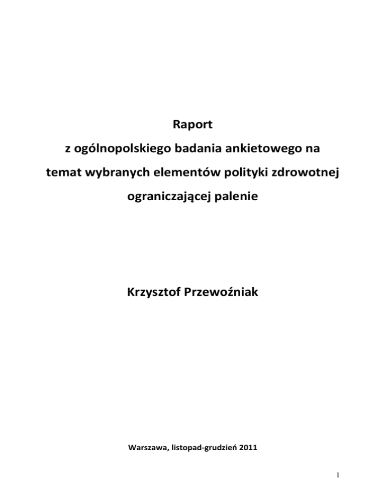 Raport z ogólnopolskiego badania ankietowego na temat wybranych elementów polityki zdrowotnej ograniczającej palenie Krzysztof Przewoźniak Warszawa, listopad-grudzieo 2011 1 Spis treści 1.Metodologia badao ................................................................................................................. 3 1.1. Cel, założenia i przedmiot badao ................................................................................. 3 1.2. Organizacja badao ....................................................................................................... 4 1.3. Źródła danych i dobór badanej próby ......................................................................... 4 2.Narażenie na dym tytoniowy w pracy i lokalach gastronomicznych ...................................... 5 2.1. Metodologia badania i analizy zebranych danych sondażowych ................................... 6 2.2. Poziom narażenia na dym tytoniowy w pracy i lokalach gastronomicznych .................. 6 2.3 Narażenie na dym tytoniowy w pracy i lokalach gastronomicznych a palenie tytoniu ... 7 3.Postawy wobec polityki zdrowotnej ograniczającej palenie tytoniu ...................................... 8 3.1. Metodologia badania i analizy zebranych danych sondażowych ................................... 9 3.2. Wpływ zakazu palenia w miejscach publicznych na poziom narażenia na dym tytoniowy.............................................................................................................................. 10 3.3. Wpływ zakazu palenia w miejscach publicznych na zaprzestanie palenia ................... 12 3.4. Poparcie dla całkowitego zakazu palenia we wszystkich miejscach publicznych ......... 13 3.5. Poparcie dla wprowadzenia obrazkowych ostrzeżeo zdrowotnych na paczkach papierosów ........................................................................................................................... 14 4. Podsumowanie wyników i wnioski....................................................................................... 16 Narażenie na dym tytoniowy w pracy i lokalach gastronomicznych ................................... 16 Postawy wobec polityki zdrowotnej ograniczającej palenie................................................ 17 2 1.Metodologia badao 1.1. Cel, założenia i przedmiot badao Badanie zostało zaplanowane i przeprowadzone przez Centrum Onkologii – Instytut im. Marii Skłodowskiej-Curie w ramach Programu Prewencji Pierwotnej Narodowego Programu Zwalczania Chorób Nowotworowych.1 Raport dotyczący zmian w narażeniu na dym tytoniowy po wprowadzeniu w 2010 r. zakazu palenia w miejscach publicznych i pracy został opracowany ze środków Stowarzyszenia MANKO Jednym z celów ww. badania była ocena narażenia społeczeostwa polskiego na dym tytoniowy w zakładach pracy i lokalach gastronomicznych oraz stosunku Polaków do wybranych elementów polityki zdrowotnej ograniczającej palenie, a w szczególności poparcia dla całkowitego zakazu palenia tytoniu we wszystkich miejscach publicznych i zakładach pracy oraz poparcia dla umieszczenia na paczkach papierosów dużych, zajmujących co najmniej 50% powierzchni opakowania, ostrzeżeo zdrowotnych zawierających fotograficzną ilustrację zdrowotnych skutków palenia. W badaniu podjęto również próbę oceny wpływu wprowadzonego w Polsce w 2010 r. zakazu palenia w miejscach publicznych i pracy na postawy palaczy, w tym zaprzestanie przez nich palenia. Wszystkie ww. zmienne zostały zanalizowane osobno wśród ogółu respondentów, mężczyzn i kobiet, a w każdej z tych grup w następujących przekrojach społeczno-demograficznych: według wieku, miejsca zamieszkania, wykształcenia, stanu cywilnego, statusu zawodowego, grupy społeczno-zawodowej, samooceny sytuacji materialnej, dochodu na osobę. W ocenie polityki zdrowotnej wzięto także pod uwagę postawy Polaków wobec palenia. 1 Zob. całościowy raport z ww. badania: W. Zatooski, K. Przewoźniak, J. Łobaszewski, J.M. Jaworski. Raport z ogólnopolskiego badania na temat związanych ze stylem życia czynników ryzyka i czynników ochronnych nowotworów złośliwych oraz wybranych elementów polityki zdrowotnej ograniczającej palenie. Centrum Onkologii-Instytut, Warszawa 2011 3 1.2. Organizacja badao Badanie przeprowadzono we współpracy z TNS OBOP w terminie 13-16 października 2011 r. Wywiady przeprowadzono metodą wywiadu bezpośredniego z wykorzystaniem technik komputerowych (ang. Computer Assisted Personal Interviewing – CAPI) w domach/mieszkaniach respondentów na reprezentatywnej, liczącej 1000 osób, próbie ludności Polski powyżej 15 roku życia. Operat losowania stanowił rejestr zasobów mieszkaniowych prowadzony przez Główny Urząd Statystyczny. Na poziomie gospodarstwa domowego dobór respondenta dokonano zgodnie z regułą ostatnich urodzin, która zapewnia losowy dobór respondenta. Wszystkie osoby powyżej 15 roku życia były spisywane w specjalnej tabeli, z uwzględnieniem dokładnych dat ich urodzin. Ankieter wybierał do badania tę osobą, która jako ostatnia miała urodziny. 1.3. Źródła danych i dobór badanej próby Próba badawcza została wylosowana w Głównym Urzędzie Statystycznym. Jako operat losowania posłużył tzw. TERYT (Krajowy Rejestr Urzędowy Podziału Terytorialnego Kraju), składający się z kilku podsystemów. Pierwszy to system identyfikatorów i nazw jednostek podziału administracyjnego TERC99. System zawiera identyfikatory i nazwy jednostek zasadniczego trójstopniowego podziału terytorialnego kraju i jest zbudowany według hierarchicznej numeracji: województw, powiatów, gmin. Drugi to system identyfikatorów i nazw miejscowości SIMC99. System zawiera: urzędowe nazwy miejscowości, stałe, niepowtarzalne identyfikatory miejscowości, określenia rodzajowe miejscowości, przynależnośd miejscowości do gminy, powiatu i województwa. Trzeci podsystem to system rejonów statystycznych i obwodów spis