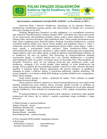 Wrocław 25.04.2015 r. Sprawozdanie z działalności Zarządu ROD „POKÓJ” we Wrocławiu za 2014 r. Szanowne Panie i Panowie Działkowcy. Spotykamy się by zapoznać Państwa z działalnością i problemami naszego ogrodu, zdać sprawozdanie za ubiegły rok i wyznaczyć plan pracy Zarządu na rok 2015. Dziękuję Okręgowemu Zarządowi za miłą współpracę, a w szczególności prezesowi mgr Januszowi Moszkowskiemu, Krajowej Radzie PZD i wszystkim tym, którzy przyczynili się do opracowania obywatelskiego projektu zmiany ustawy prawo budowlane w zakresie definicji altan, autorstwa Komitetu „Stop rozbiórkom altan”, która została zatwierdzona przez Sejm, Senat i podpisana przez Pana Prezydenta. Dziękuję wszystkim działkowcom, a przede wszystkim ludziom dobrej woli, którzy złożyli podpisy pod projektem ustawy w walce o zachowanie naszych altan. Dzisiaj jest najważniejszą sprawą walka o nasze altany i walka o nasze ogrody z prezydentem miasta warszawy Panią Gronkiewicz-Waltz, która zakwestionowała nasz statut przy rejestracji w sądzie, daleko wykraczając poza kompetencje organu nadzoru, gdyż chce oddać ogrody za długi po dekrecie nacjonalizacyjnym Bieruta, na co działkowcy nie chcą się zgodzić. Jeśli pozwolimy by niesprawiedliwość dotknęła warszawskie ogrody, to wkrótce dotknie ona i nas. Prosimy działkowców o wysyłanie indywidualnych listów do posłów wszystkich opcji, do Rzecznika Praw Obywatelskich, do Prezydent Warszawy, gdyż nie ma większej motywacji gdy pojedyncze osoby, sami działkowcy, zabiegają o byt swoich działek. Mam nadzieję, że wielu działkowców tak postąpi. Wyraz poparcia dla obywatelskiego projektu i sprzeciwu wobec zakusów likwidacji ogrodów w miastach, będzie dobrym argumentem, dla naszych włodarzy, że działkowcy zasługują na godne i właściwe miejsce w przestrzeni publicznej. Ogólnie zebraliśmy 700 tysięcy podpisów i za to Krajowa Rada PZD dziękuje wszystkim działkowcom i sympatykom, którzy złożyli podpisy. Senat ustawę przyjął w całości i przekazał do Sejmu. Teraz czekamy na podpis Prezydenta Komorowskiego. Muszę państwa zasmucić, ponieważ w okresie bożonarodzeniowym nasz ogród został brutalnie potraktowany przez złodziei, którzy wszystko ukradli wszystko co mieliśmy na stanie. Była policja spisała straty i pobrała odciski palców. Włamania do swych altan zgłaszali również działkowcy. Nasz dobytek był ubezpieczony w PZU, jednak otrzymaliśmy jedynie 700 zł. W minionej kadencji w naszym ogrodzie został zakupiony i postawiony mały ogródek jordanowski dla dzieci, tak że rodzice z małymi pociechami mogą swobodnie z niego korzystać. 1. Skład Zarządu w minionej kadencji: Tadeusz Netczuk – prezes Waldemar Mieszkowski – zastępca prezesa Renata Hejda – sekretarz Danuta Zbierak – skarbnik Paweł Błażejewski – członek Zarządu. 2. Przy Zarządzie ROD działały następujące komisje: a) Rewizyjna - Władysława Czupryna - przewodnicząca - Ryszard Surmacewicz - sekretarz b) Rozjemcza nie istnieje zgodnie z ustawą: jednak zarząd postanowił aby ta komisja dalej działała jako doraźna problemowa komisja mediacyjna, dlatego że są sporne sprawy które można załatwić polubownie bez sądu. - Bożena Traczyk - przewodnicząca - Helena Sikorska - sekretarz - Antoni Jodkiewicz - członek c) Lustracyjna - Paweł Błażejewski - przewodniczący, do tej komisji są powołani gospodarze ogrodu, jak też po dwie osoby z komisji Rewizyjnej i Rozjemczej jako mediacyjnej. d) Ochrony środowiska, SSI - Tadeusz Netczuk - przewodniczący - Danuta Zbierak - Helena Sikorska - Paweł Błażejewski e) Socjalna - Danuta Zbierak - przewodnicząca, oraz nasze Panie: - Helena Sikorska - sekretarz - Bożena Traczyk - Władysława Czupryna - Renata Hejda f) Gospodarze - Pan Waldemar Ścigała jest gospodarzem przy al. Armii Krajowej w ROD Pokój - Pan Jerzy Milewski jest gospodarzem kolonii Brochów. Zarząd i komisje się zmienią, jednak o tych odchodzących trzeba pamiętać co zrobili dla ogrodu. Bardzo dziękuję za trud i pracę Gospodarzy na rzecz ogrodu. Ci Panowie potrafią wykonać każde zadanie. Gospodarze konserwowali infrastrukturę, naprawiali urządzenia, dbali o wywóz śmieci, nadzorowali prace społecznie użyteczne. Wszystko to, by w naszym ogrodzie było czysto i przyjemnie. 3. Komisja Lustracyjna i Konkursowa prowadziła przegląd ogrodu przez cały sezon, wytypowała działki do konkursu na najładniejszą działkę podczas w Dnia Działkowca. a) Działki zostały wyróżnione nagrodą, dyplomem i książką w 2014 r. Jak również w 2013 r. nasz ogród zajął trzecie miejsce, były odznaczenia, dyplomy huczna zabawa z okazji 60-lecia istnienia naszego ogrodu, z tej okazji otrzymaliśmy dwa puchary. Ocena prac w naszym ogrodzie przypadająca na okres jesienno-wiosenny wypadła dobrze. Niestety wiele działek jest zaniedbanych, brudnych, brak numerów, nasadzenia są nieprawidłowe, kompostowniki źle usytuowane, za blisko granic, a to z kolei już jeden krok do zatargów i kłótni między działkowiczami i Zarządem ROD. 4. Komisja Rozjemcza i Rewizyjna. Dziękuję obu tym Komisjom za pracę na rzecz ogrodu i pomoc Zarządowi. Szczególnie zaś statutowej komisji rozjemczej, która w 2014 r. zakończyła pracę jako statutowa. 5. Komisja Lustracyjna i Konkursowa, Społeczna Służba Instruktorów i Komisja Ochrony Środowiska służyły radą działkowcom. Zostały przeprowadzone pokazy i szkolenia z zakresu szczepień drzew, krzewów oraz cięcia drzew, winorośli, udzielano porad. Najaktywniej działali w 2010 - 2015 r. prezes instruktor krajowy oraz instruktorzy ogrodowi: Danuta Zbierak, Helena Sikorska, Paweł Błażejewski i Waldemar Mieszkowski. Na stronie internetowej opublikowano 14., 15. i 16. numer Mini Gazety SSI poświęcony przegłosowaniu naszej ustawy przez Sejm i Senat oraz podpisaniu tej ustawy przez Prezydenta, to było wspólne nasze zwyci